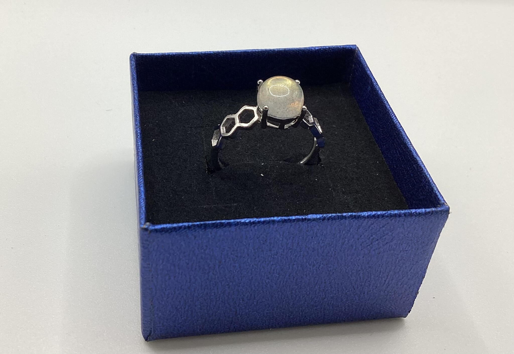 Bague ajustable en argent S925 et pierre de Labradorite aux somptueux reflets orange et jaune (sunset). Fine et élégante .