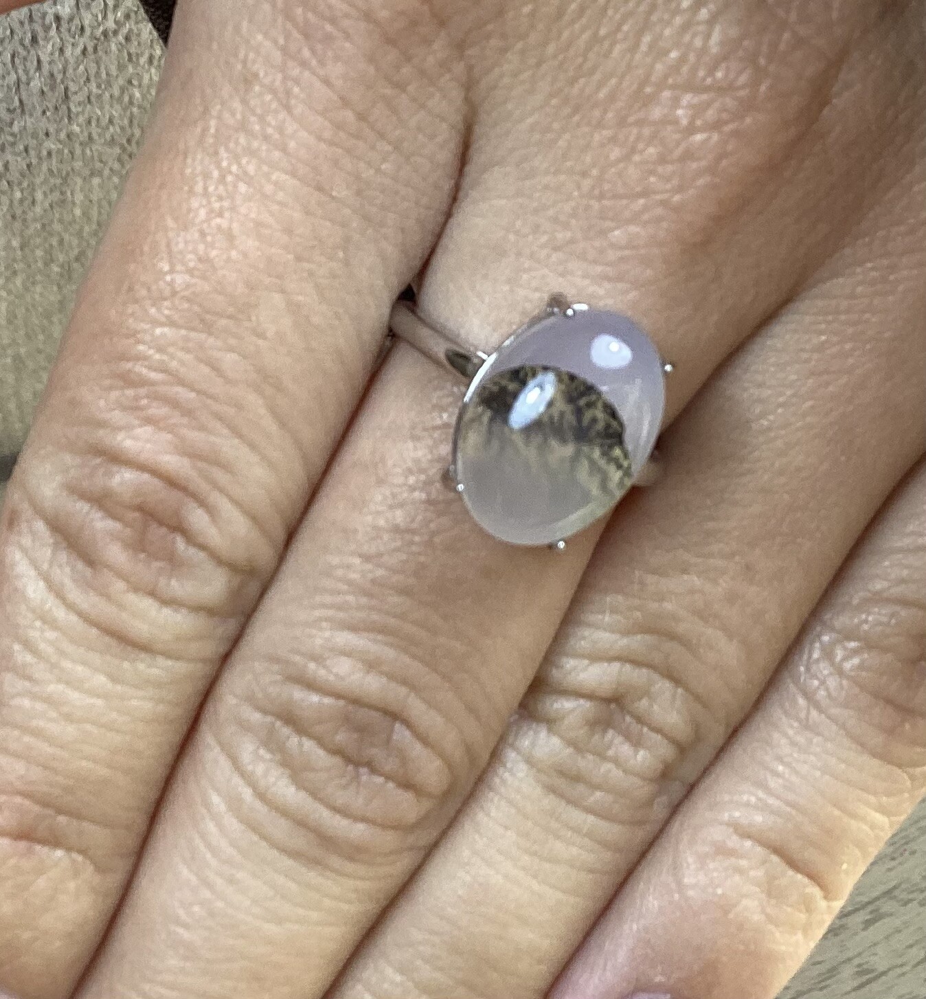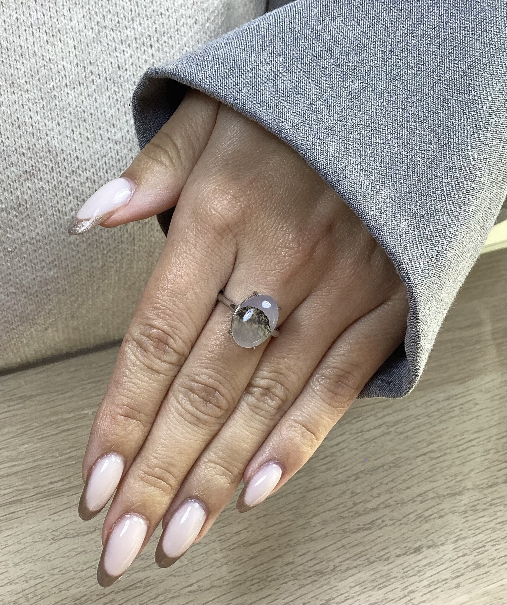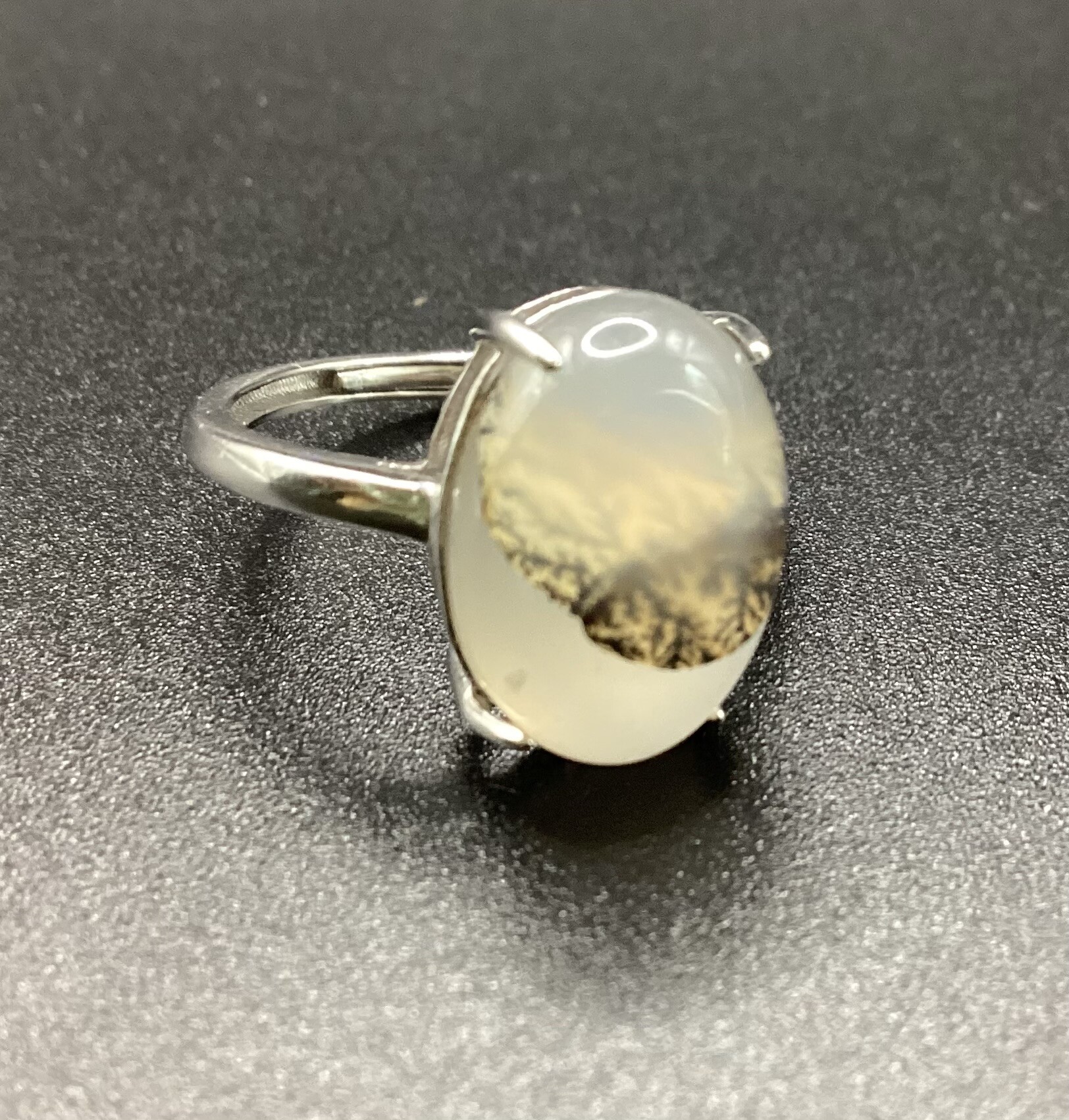 Bague ajustable en argent S925 et cabochon en agate dendritique. Mystère de cette pierre qu’on ne voit pas souvent montée en bague..