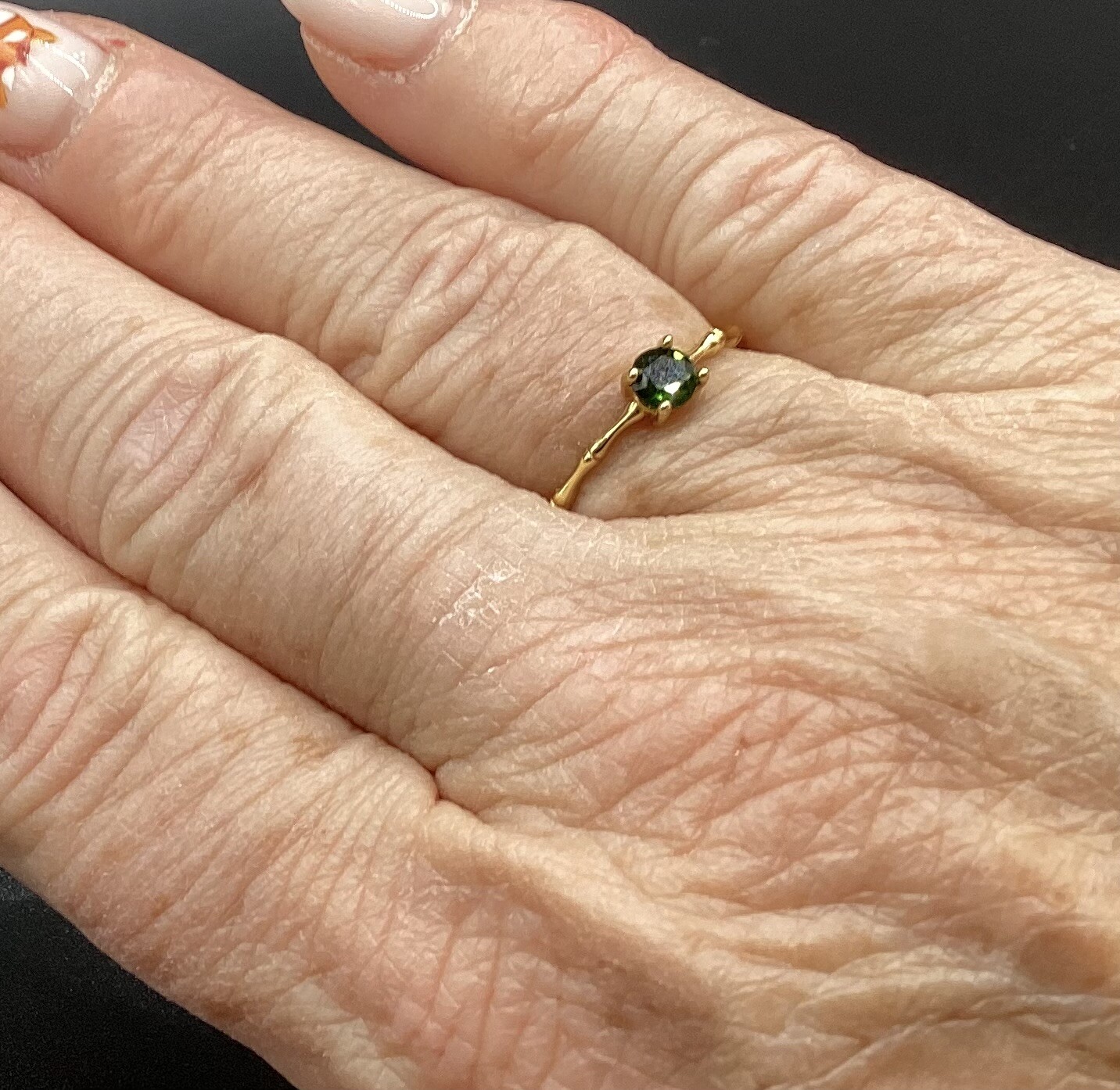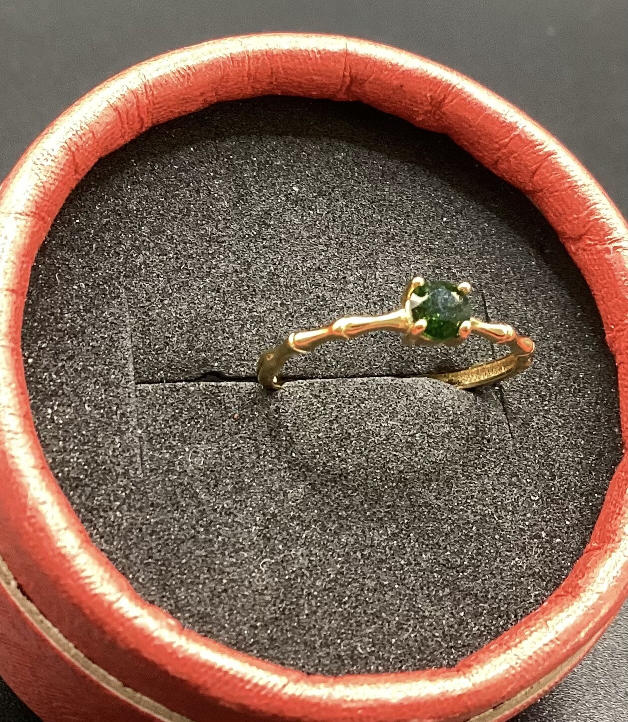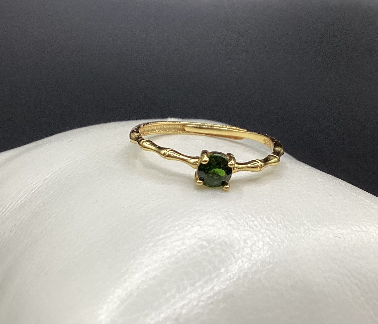 Jolie bague bambou, ajustable, en argent S925 plaqué or. Sa pierre et un diopside d’une beauté vert intense !