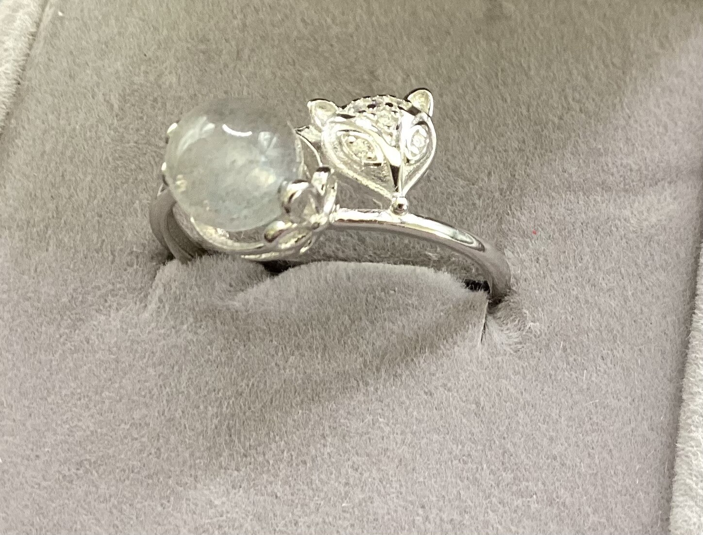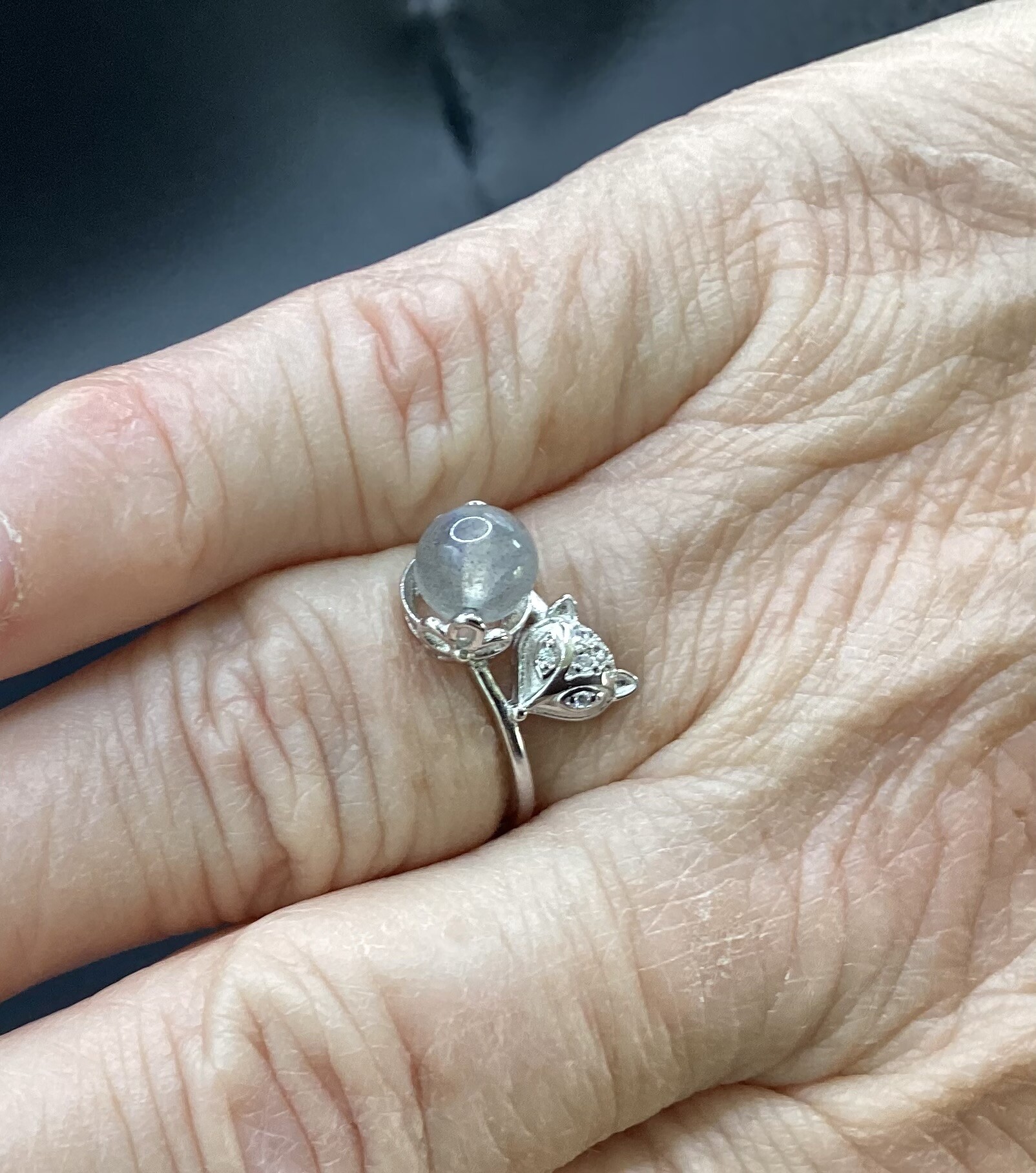 Bague en argent S925 ajustable, avec une tête de renard et une jolie perle de péristérite aux superbes reflets bleu..