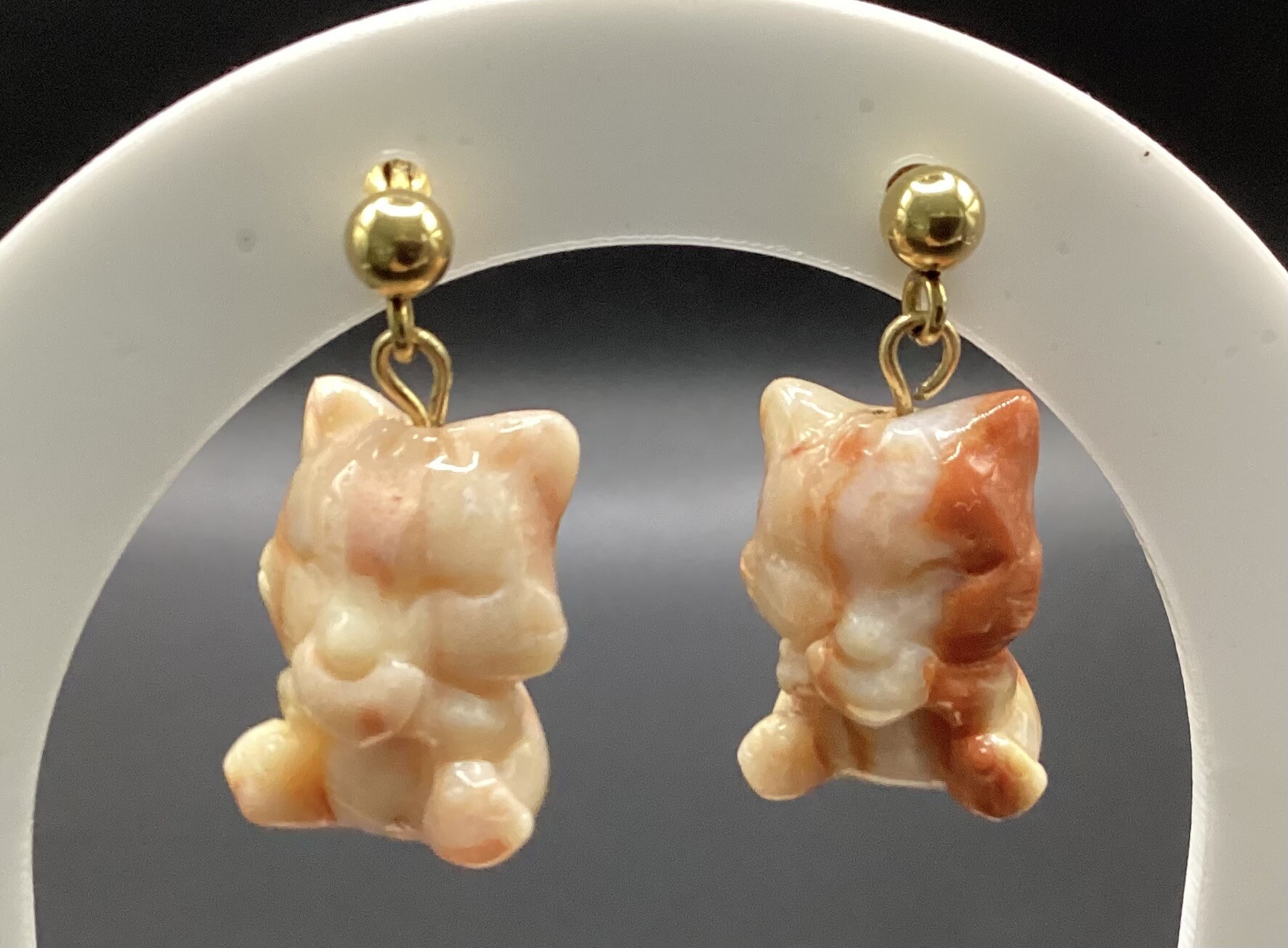 Boucles d’oreilles en agate crazy lace représentant deux petit chats !! Montures et clous en acier inoxydable.