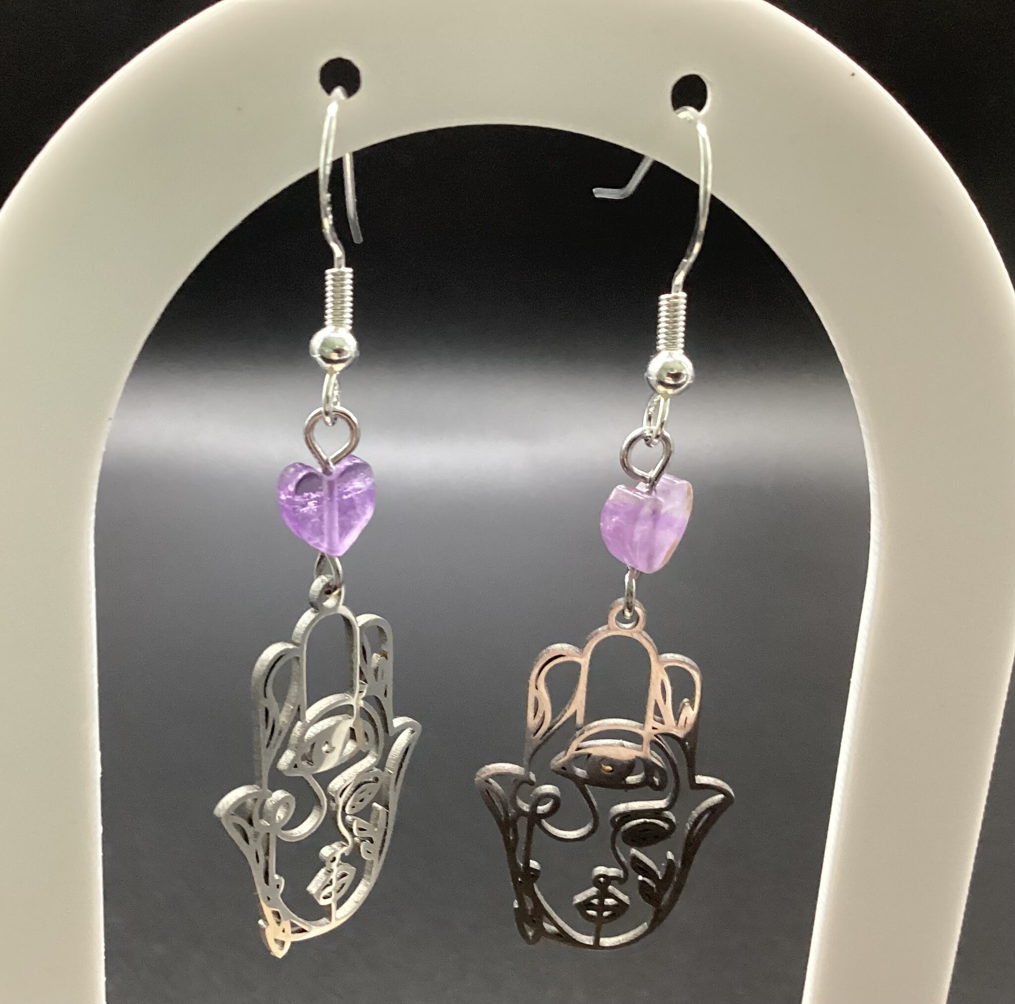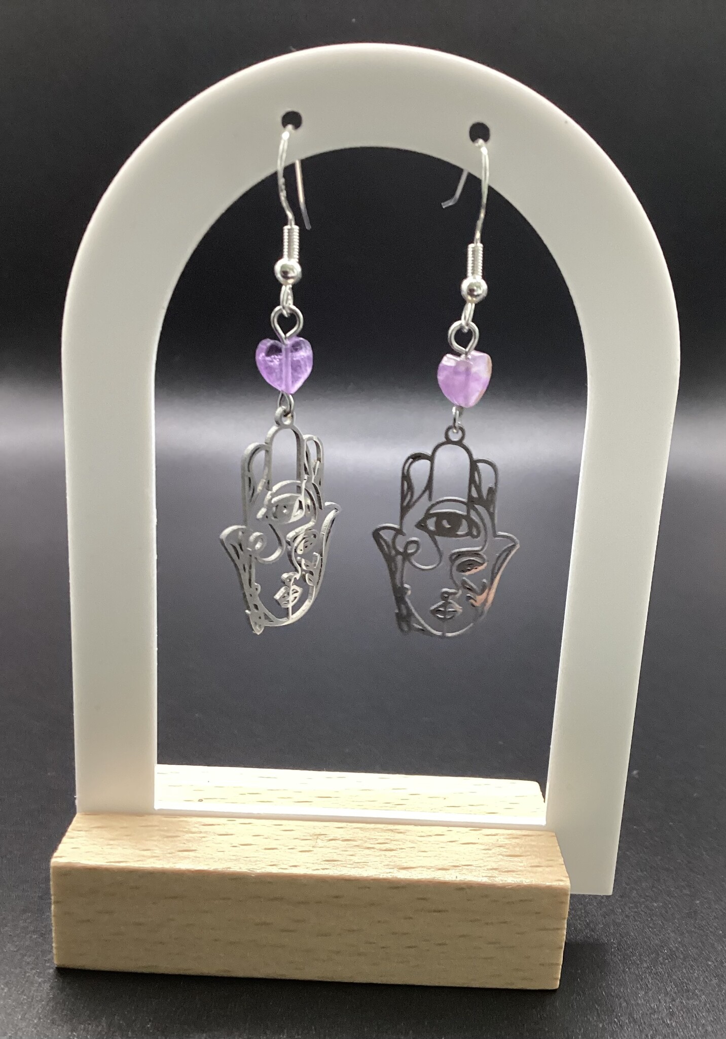 Boucles d’oreilles acier inoxydable et petits cœurs en améthyste. Les crochets sont en argent S925.
