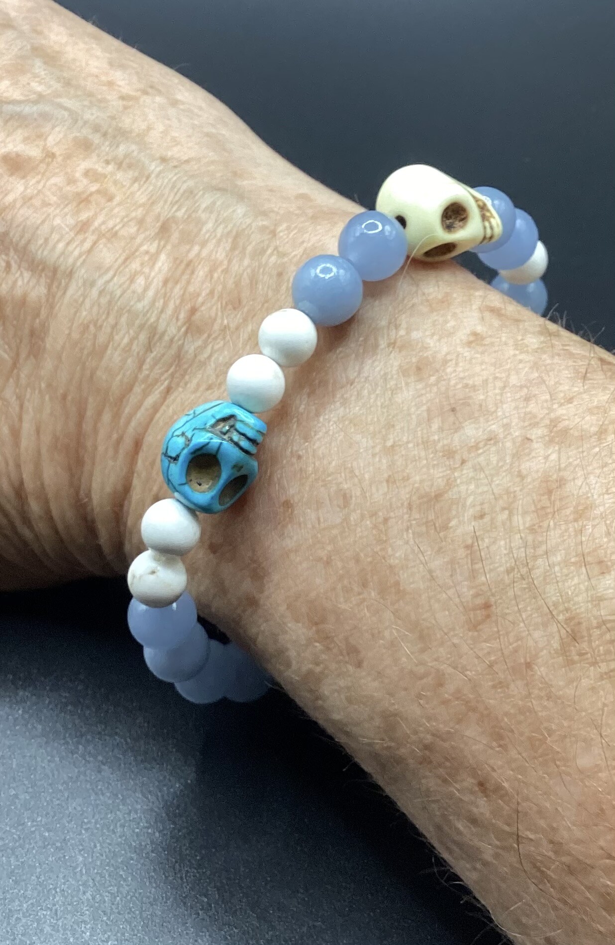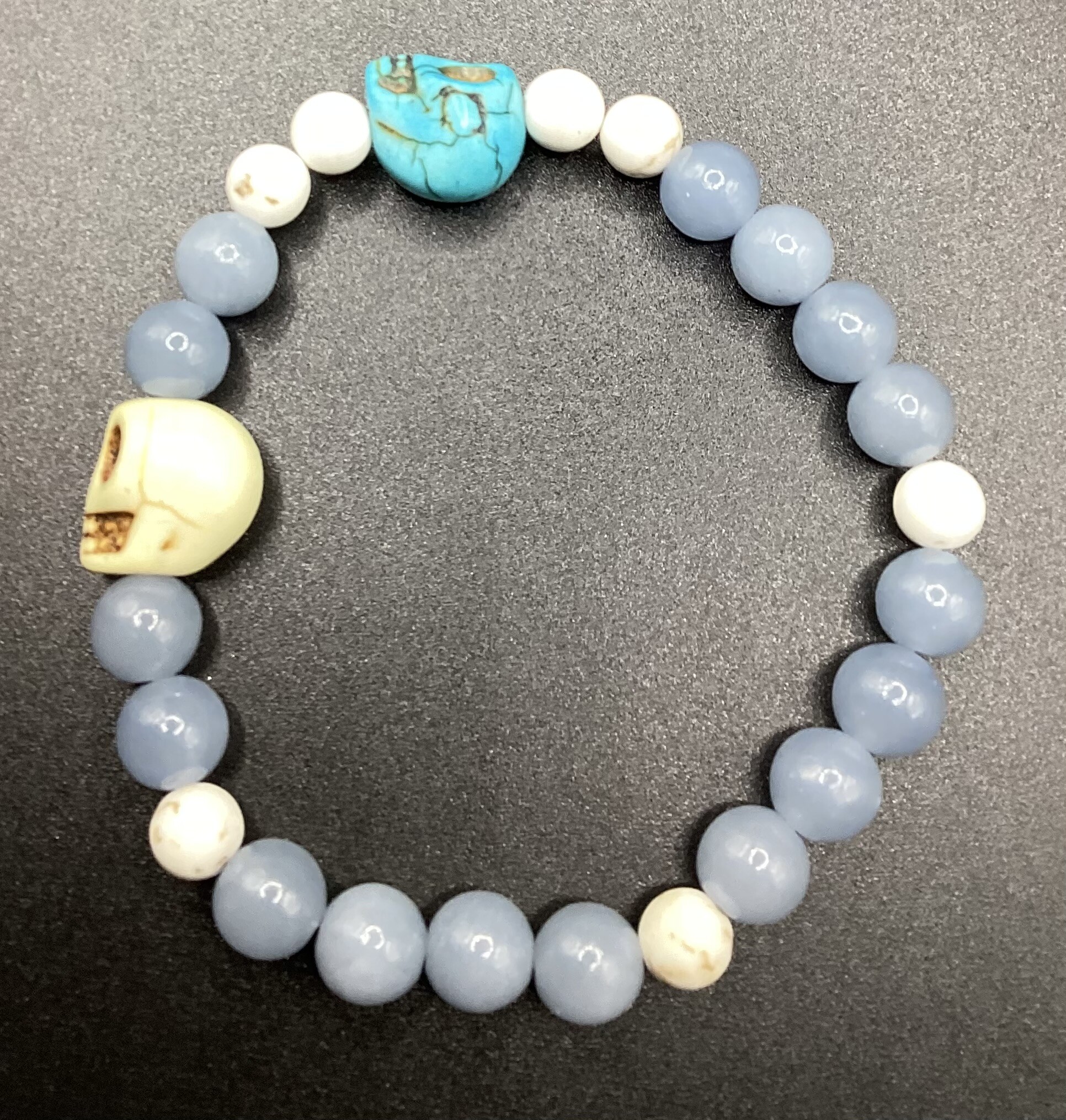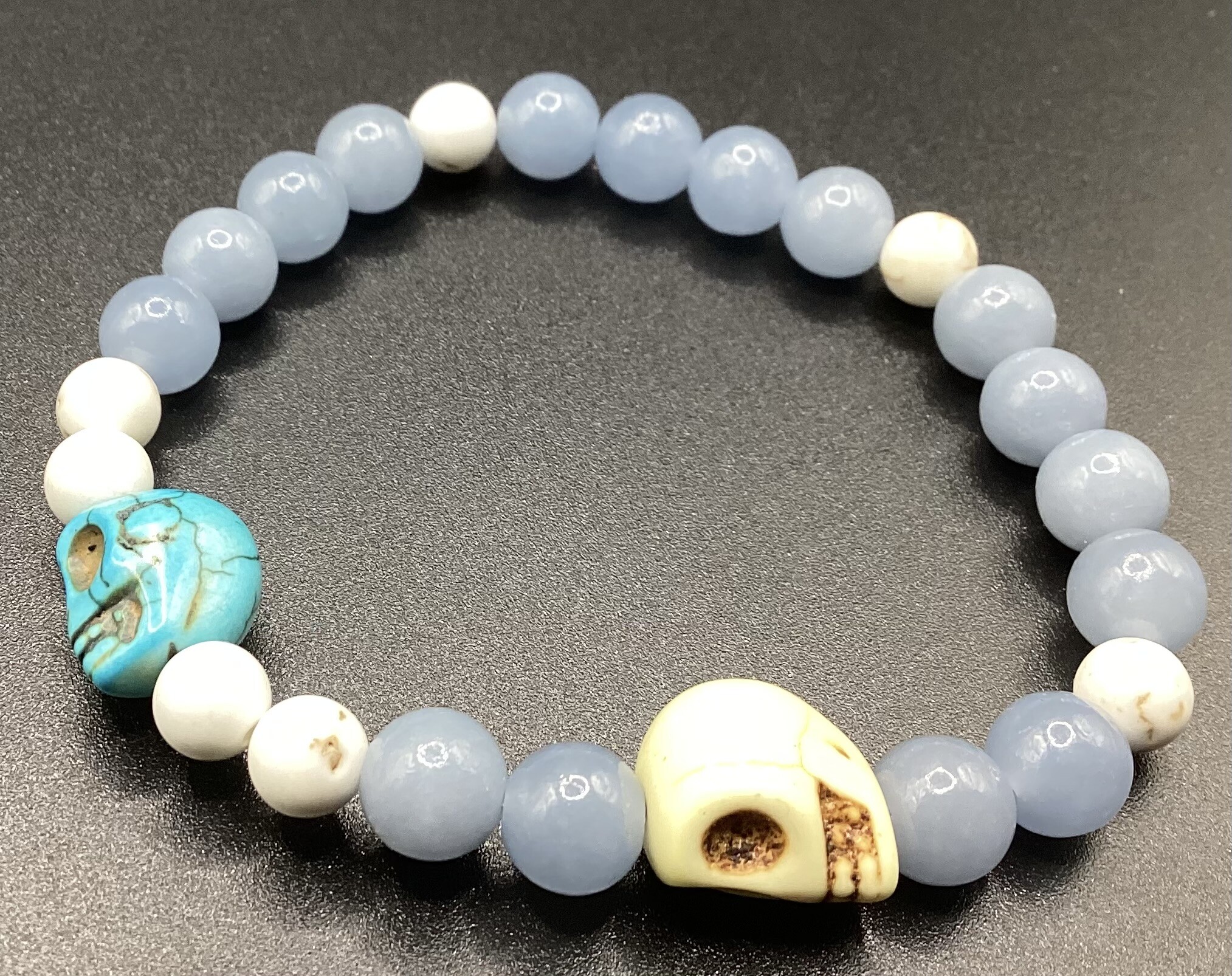 Bracelet en perles d’angélite ( 8mm) et howlite (6mm) Ève-Charlotte deux têtes de mort en howlite teintée. Parfait pour Halloween !!