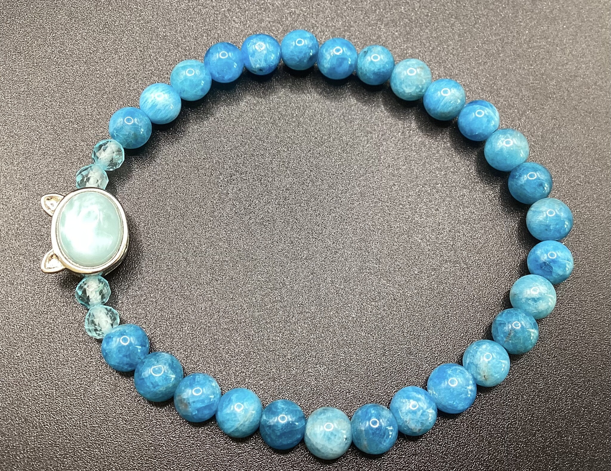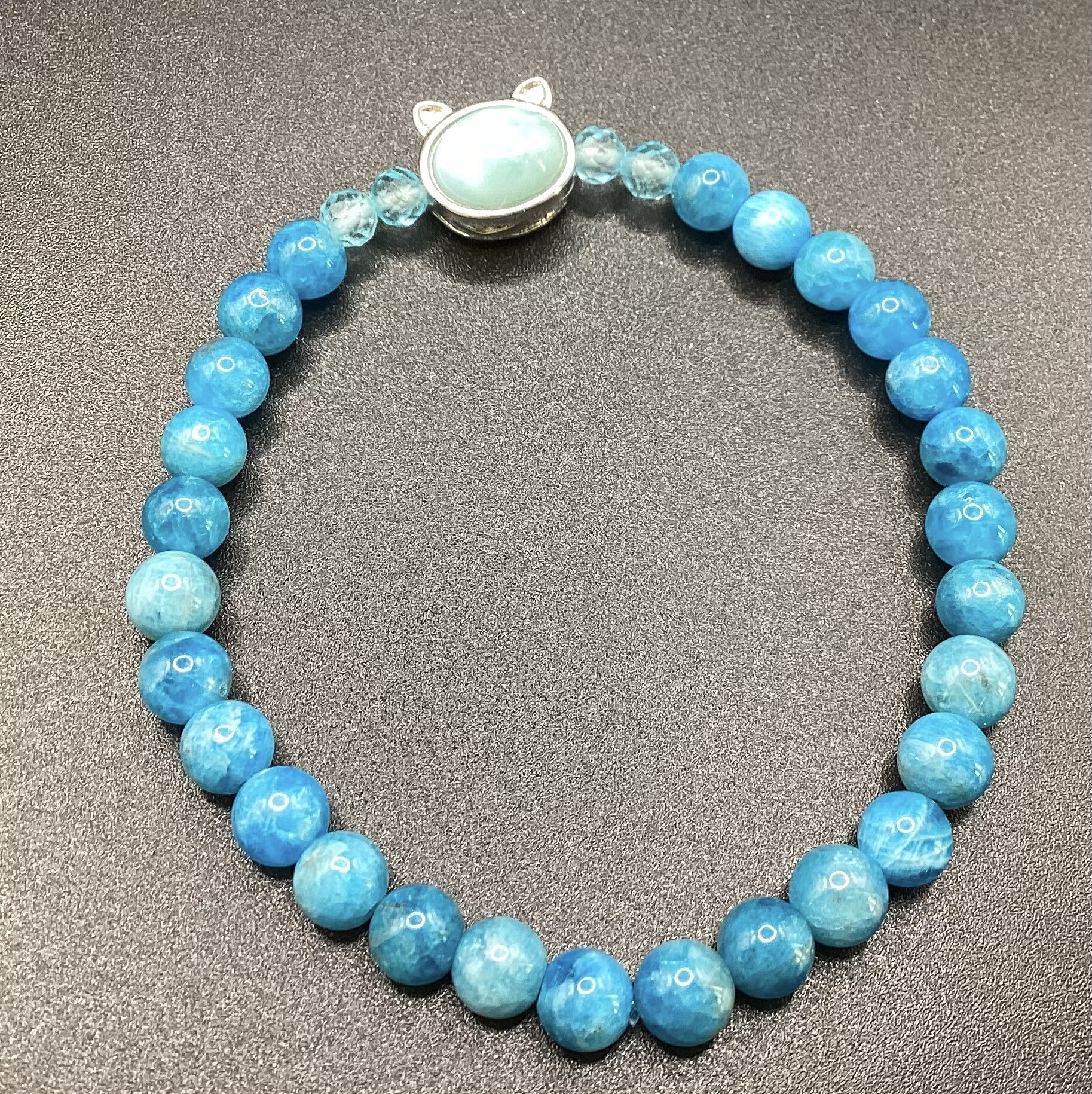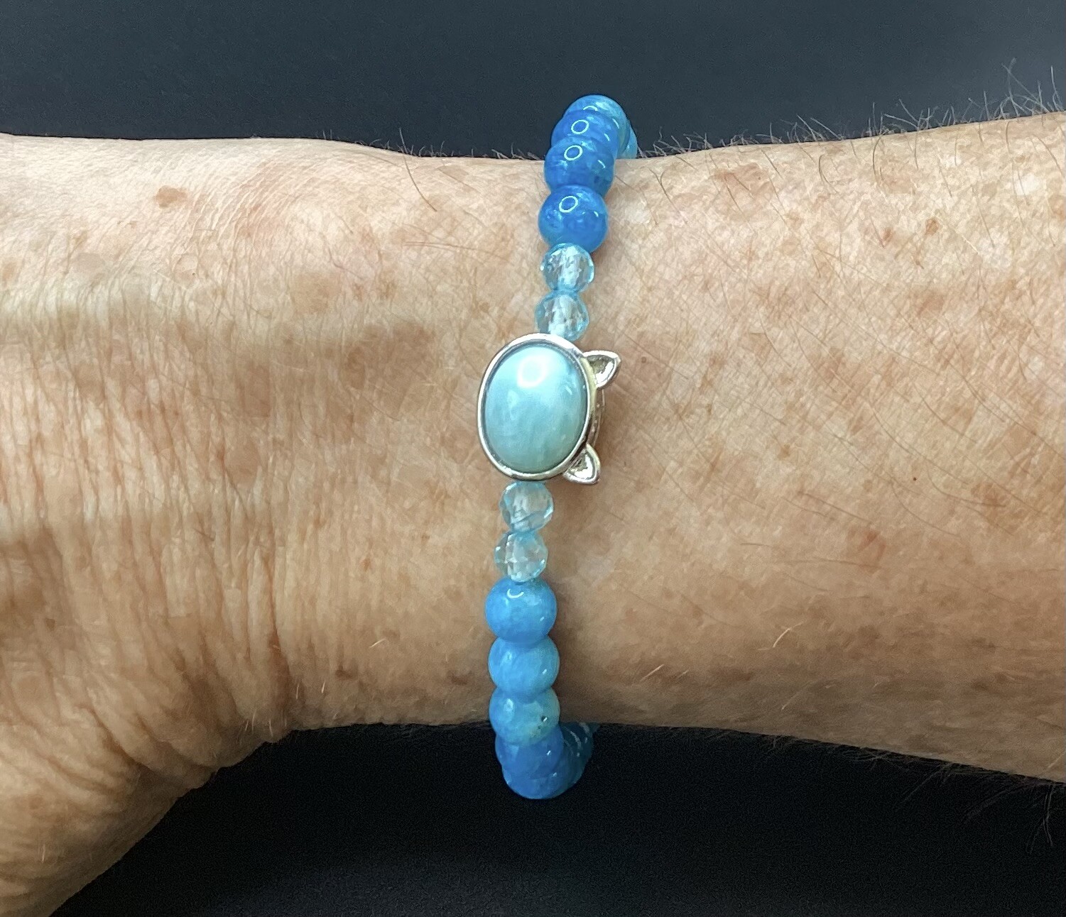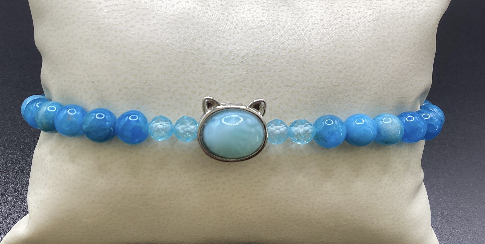 Bracelet en perles de Larimar, avec en son centre une tête de chat Larimar et argent S925, entouré de deux petites perles facettées de topaze bleue.