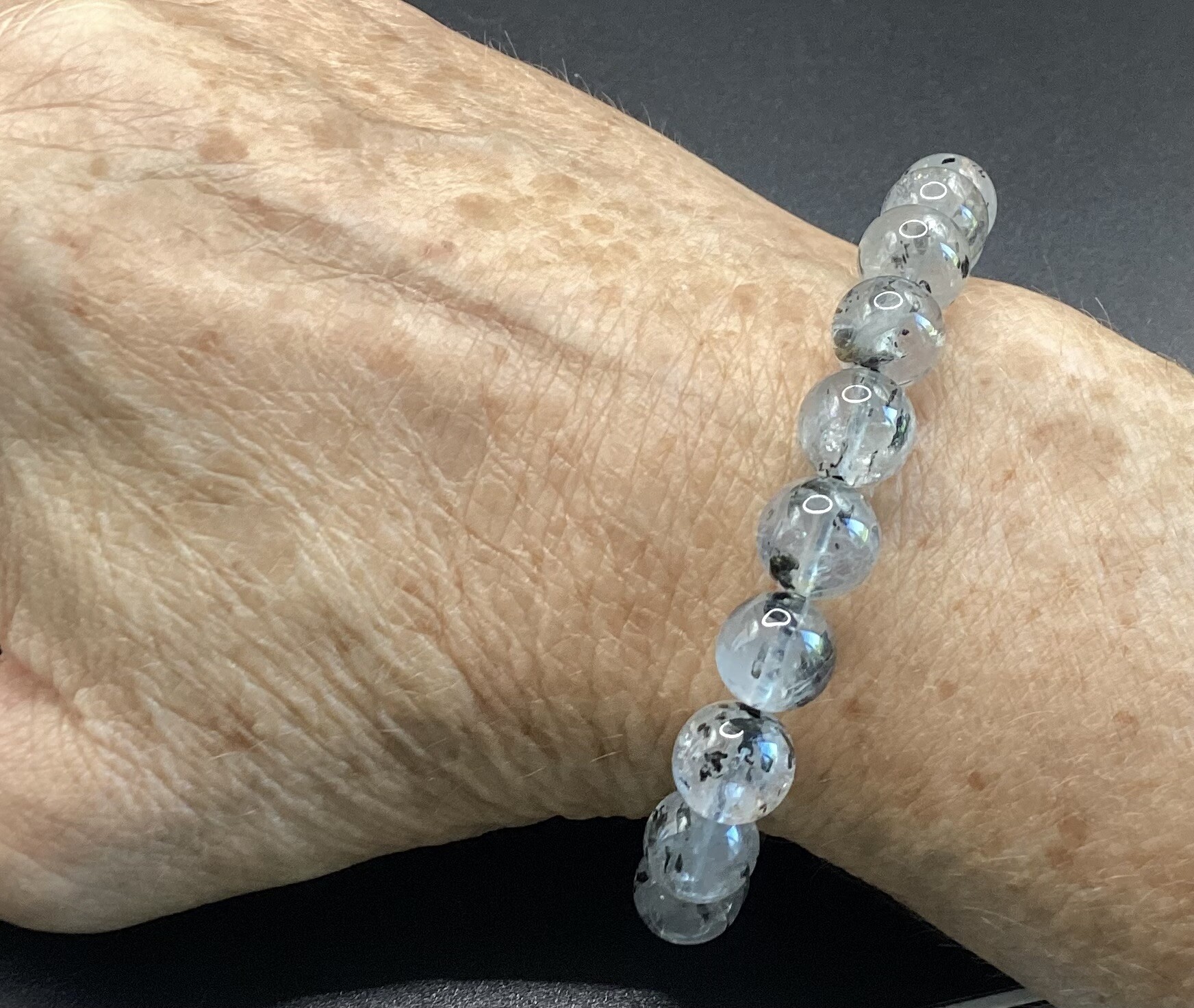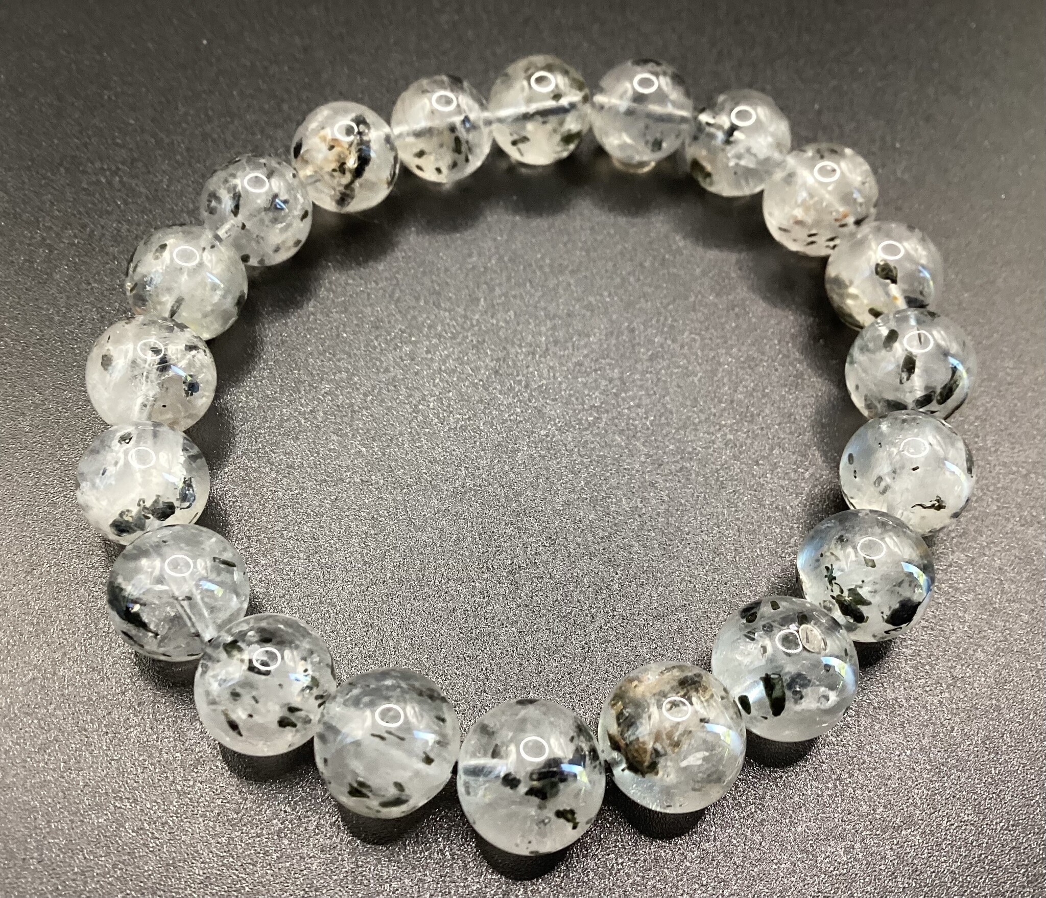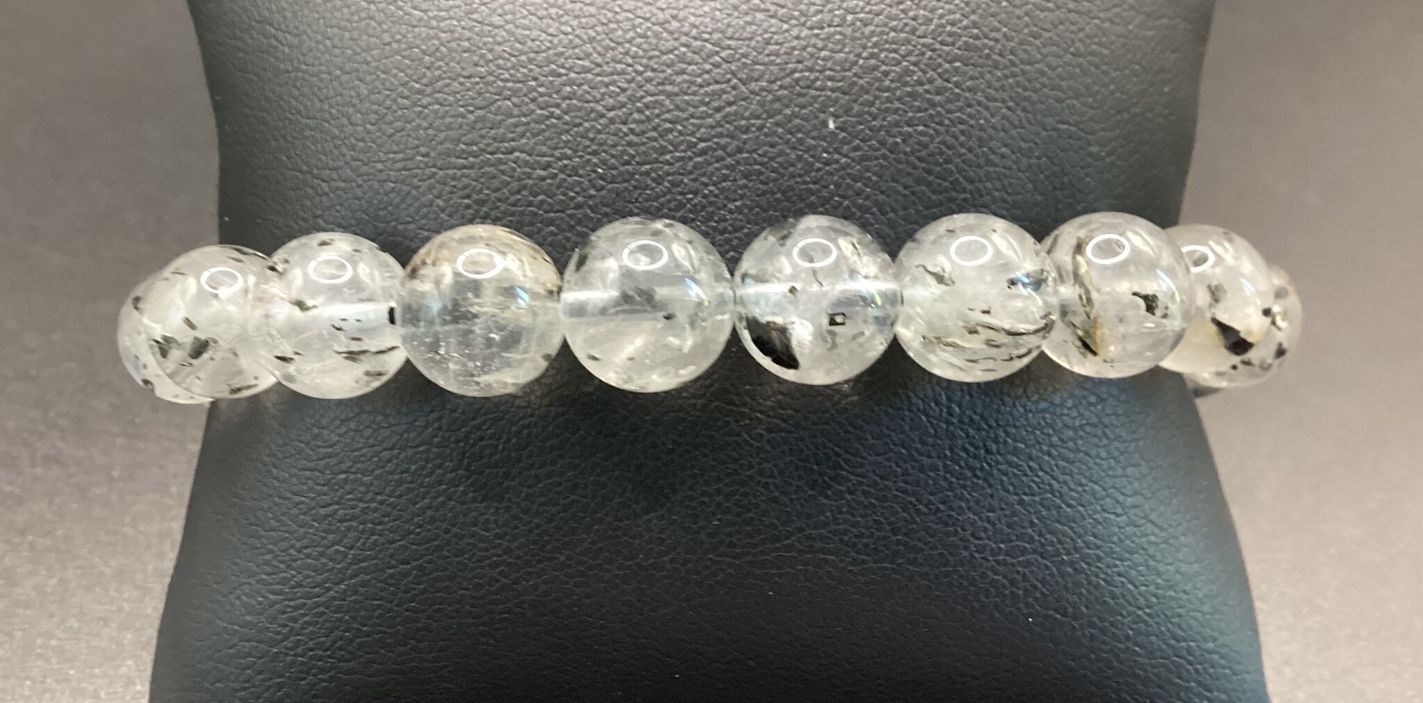 Bracelet en perles de cristal de roche avec inclusions de mica noir (9mm) et très belle qualité. Original et peu commun (rutilé). Il est parfois appelé quartz fraise noir.