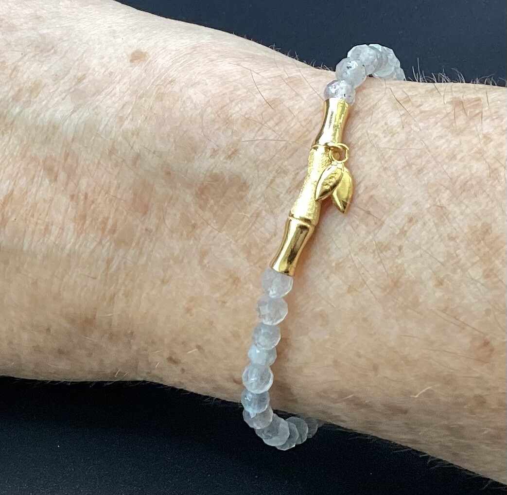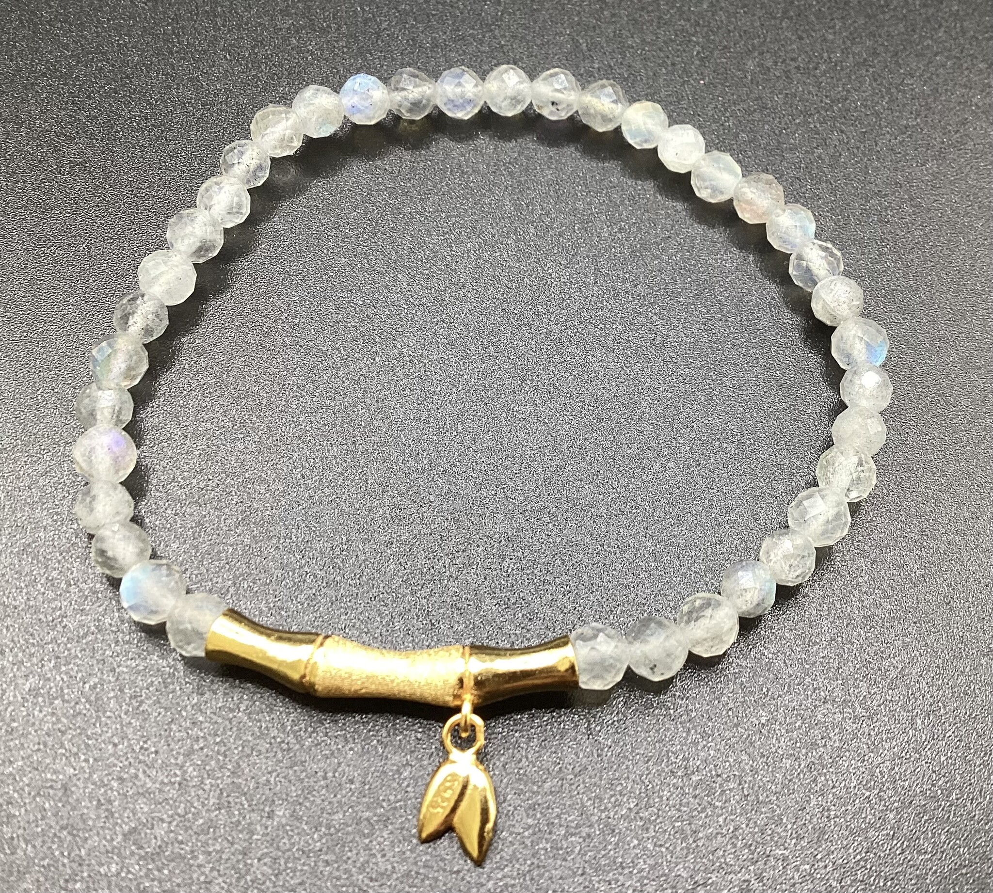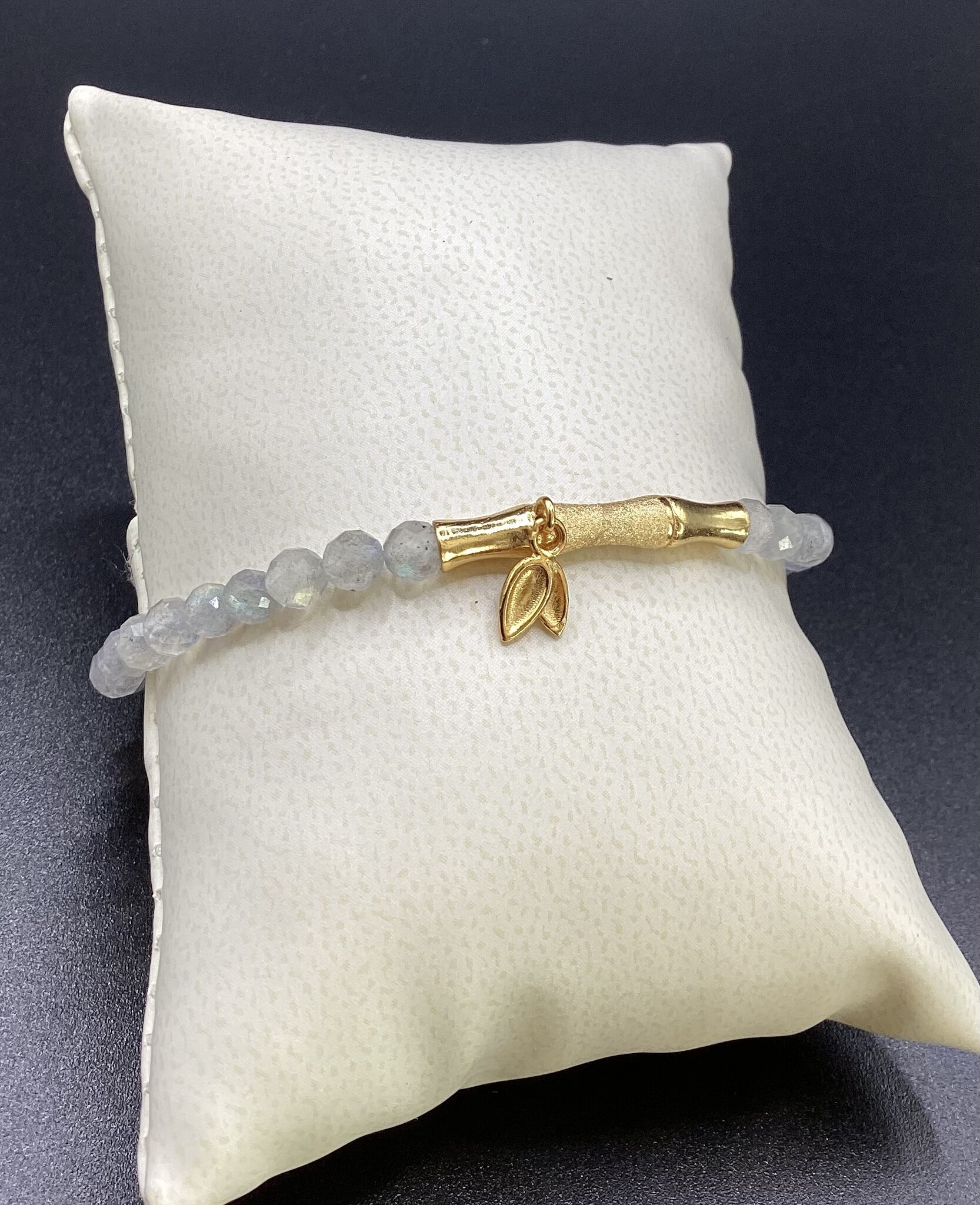Bracelet en perles de labradorite facettées (4mm) aux jolis flash bleus. En son centre, une jolie tube bambou en argent S925 plaqué or.