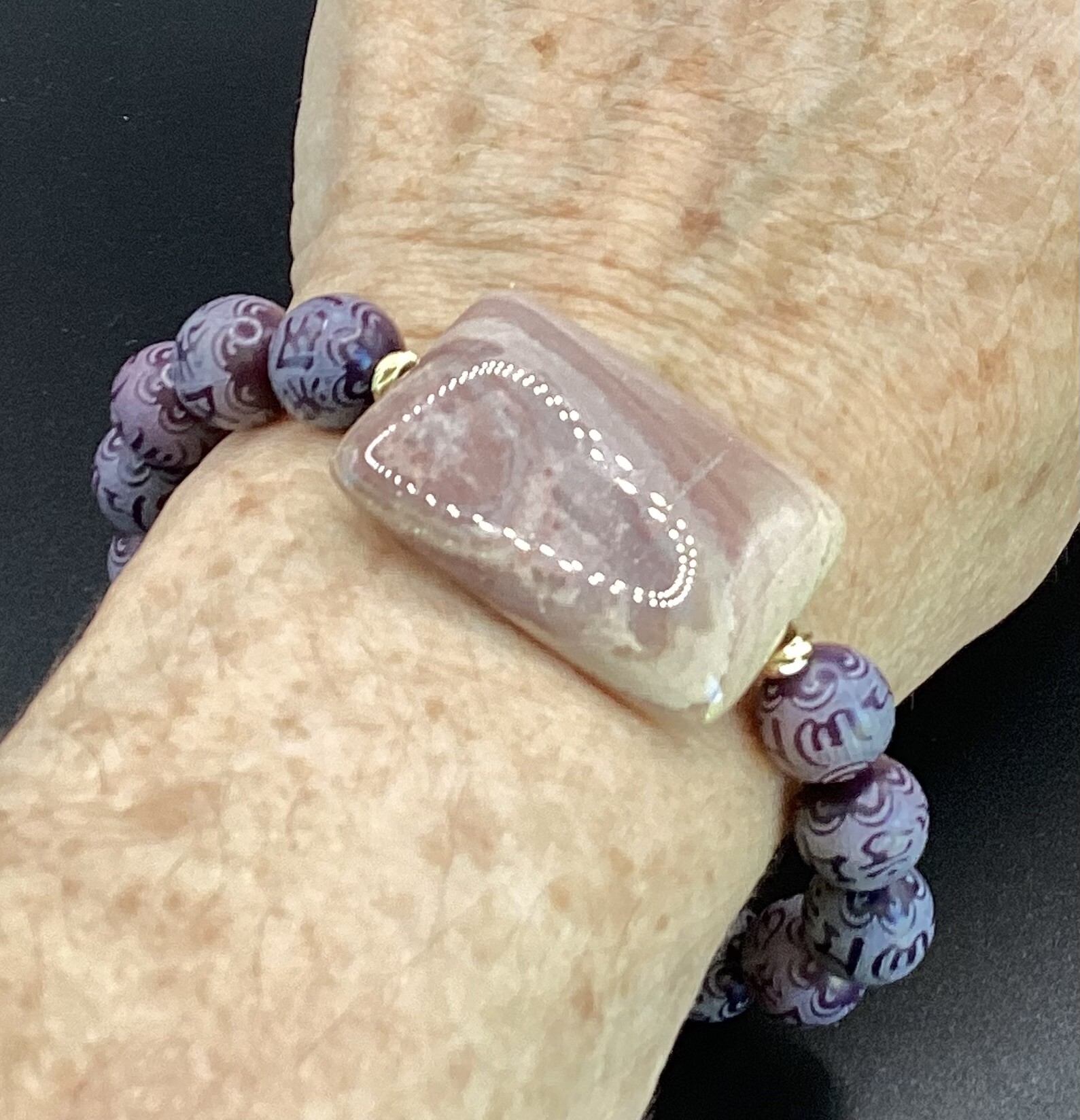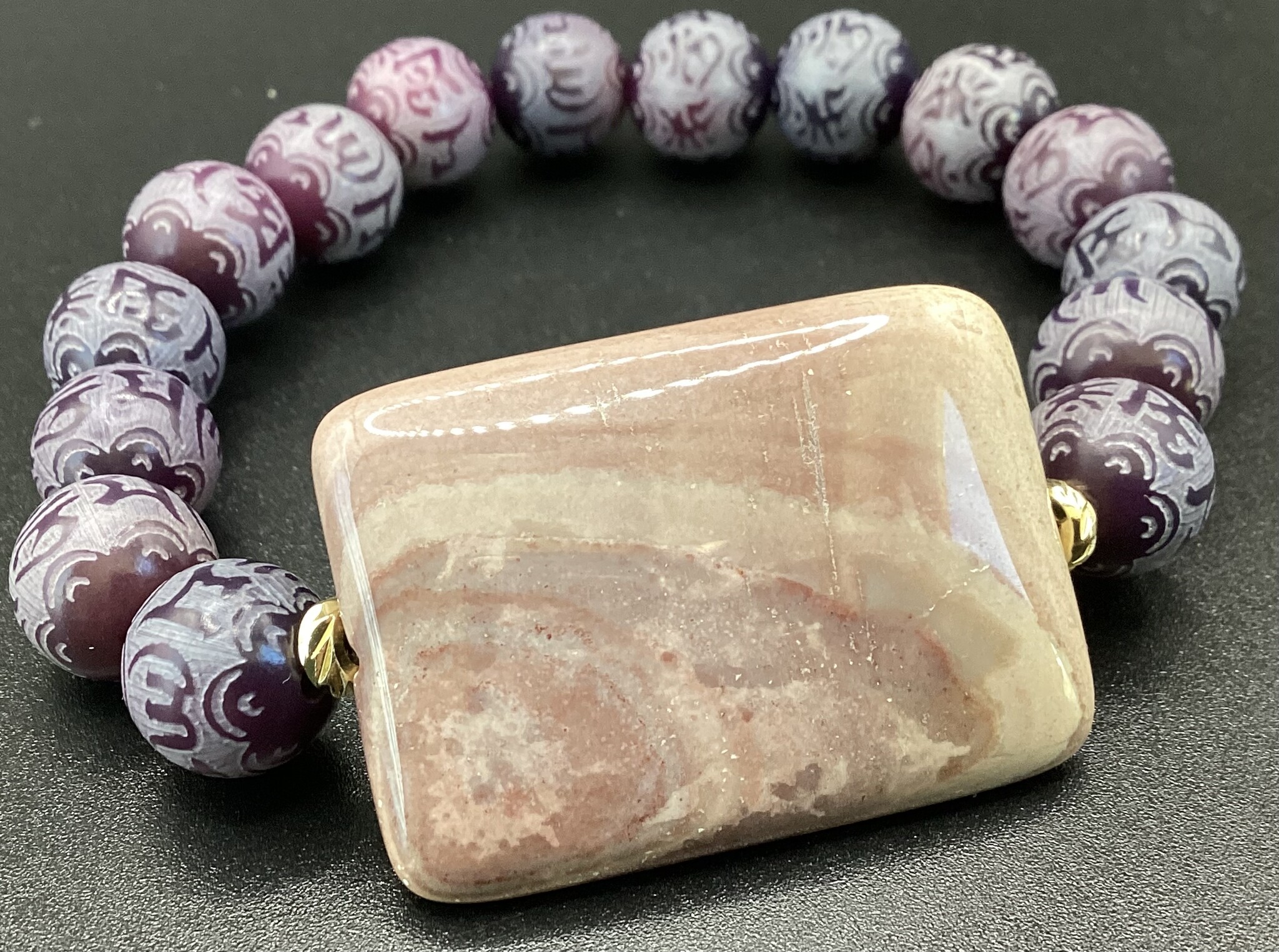 Joli bracelet en perles de bodhi violettes (10 mm), gravées de mantras. En son centre une belle pierre d’agate aux tons rosé. Détails dorés en acier inoxydable.