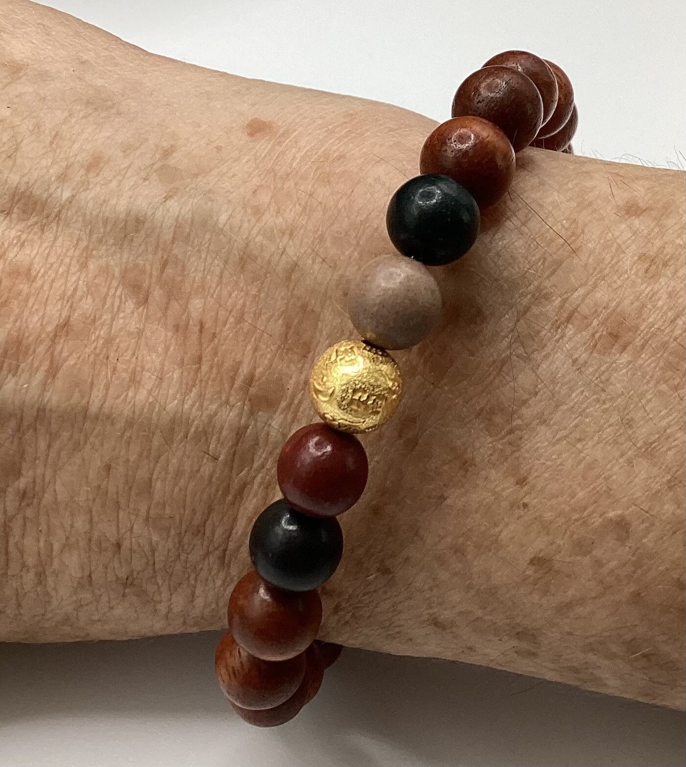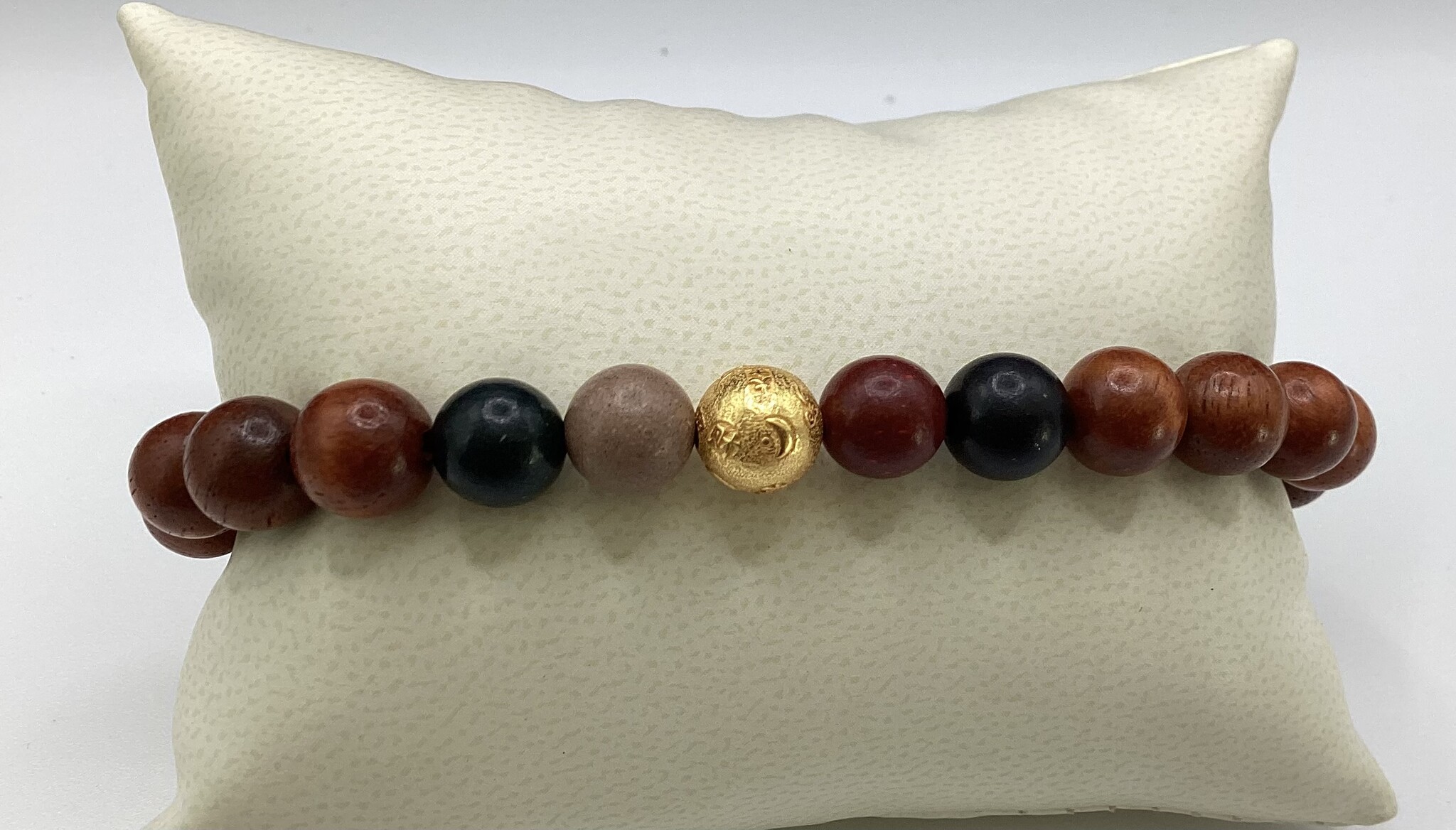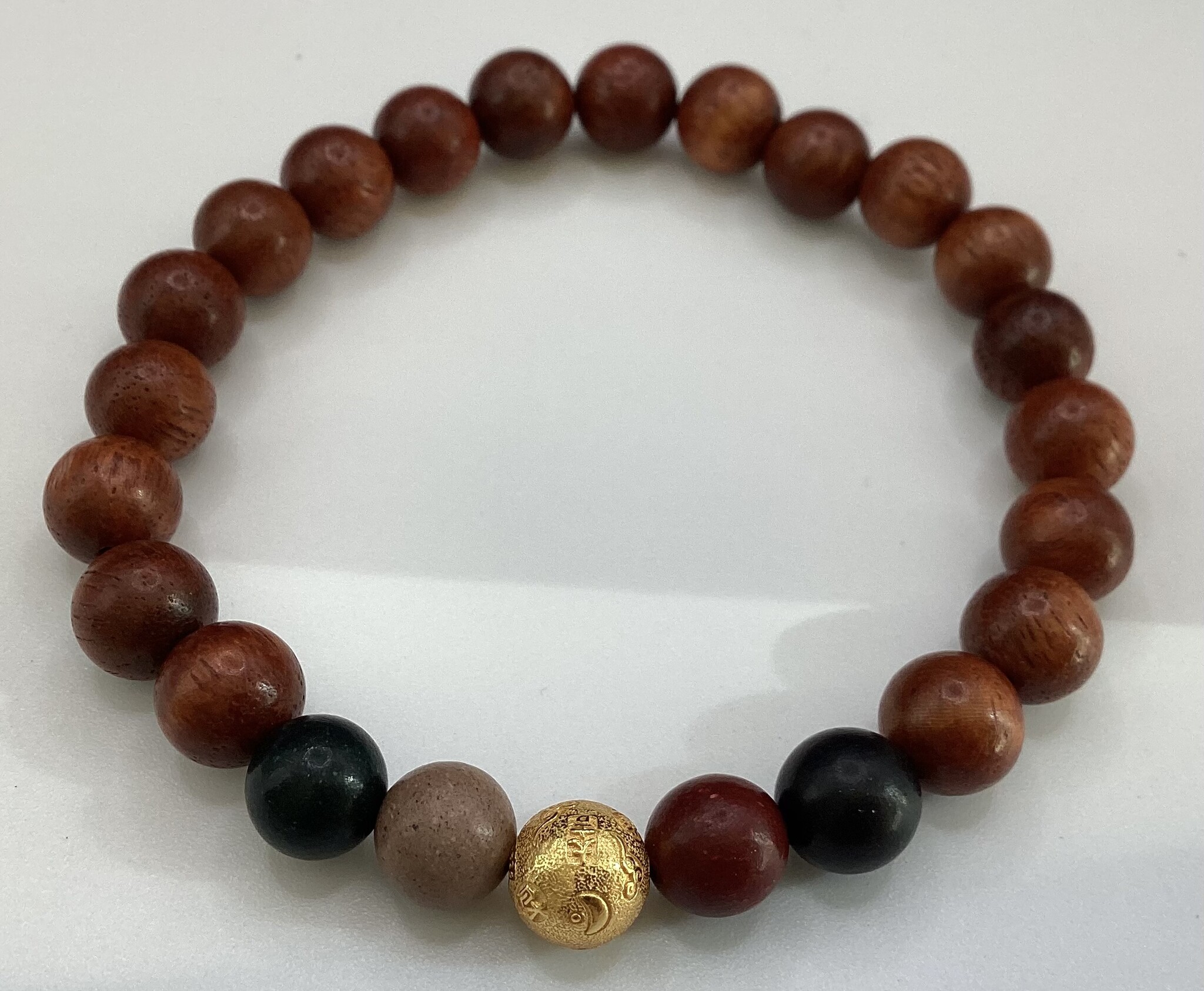Bracelet en perles de bois de rose (8mm). En son centre, une perle mantra en argent S925 plaqué or, entourée de 4 perles d’herbes médicinales chinoises compressées. Doux parfum…