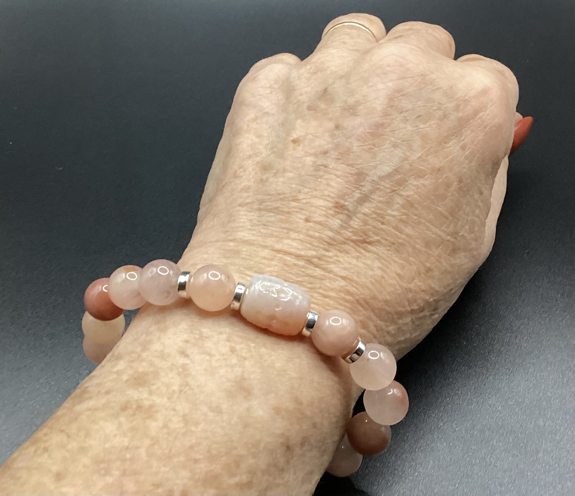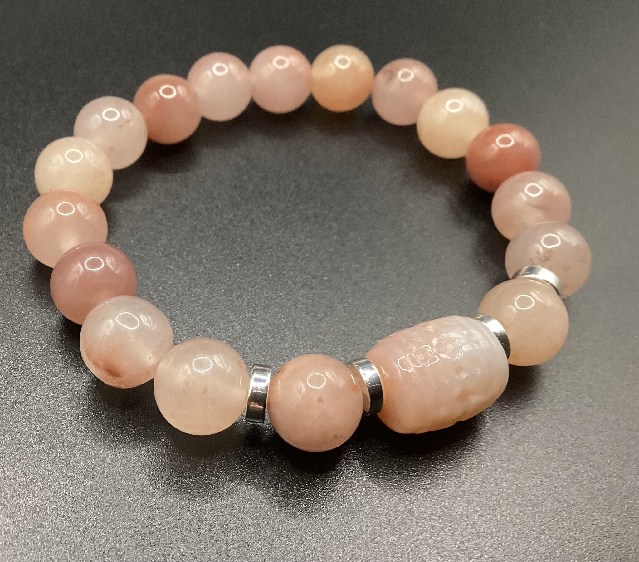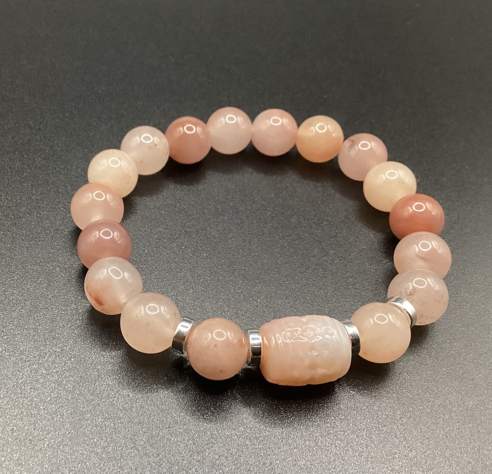 Bracelet en perles de jade fleur (10 mm). Couleur rosé pour ce jade, douceur et élégance. En son centre un « tonneau » d’agate du même ton. Les espaceurs sont en