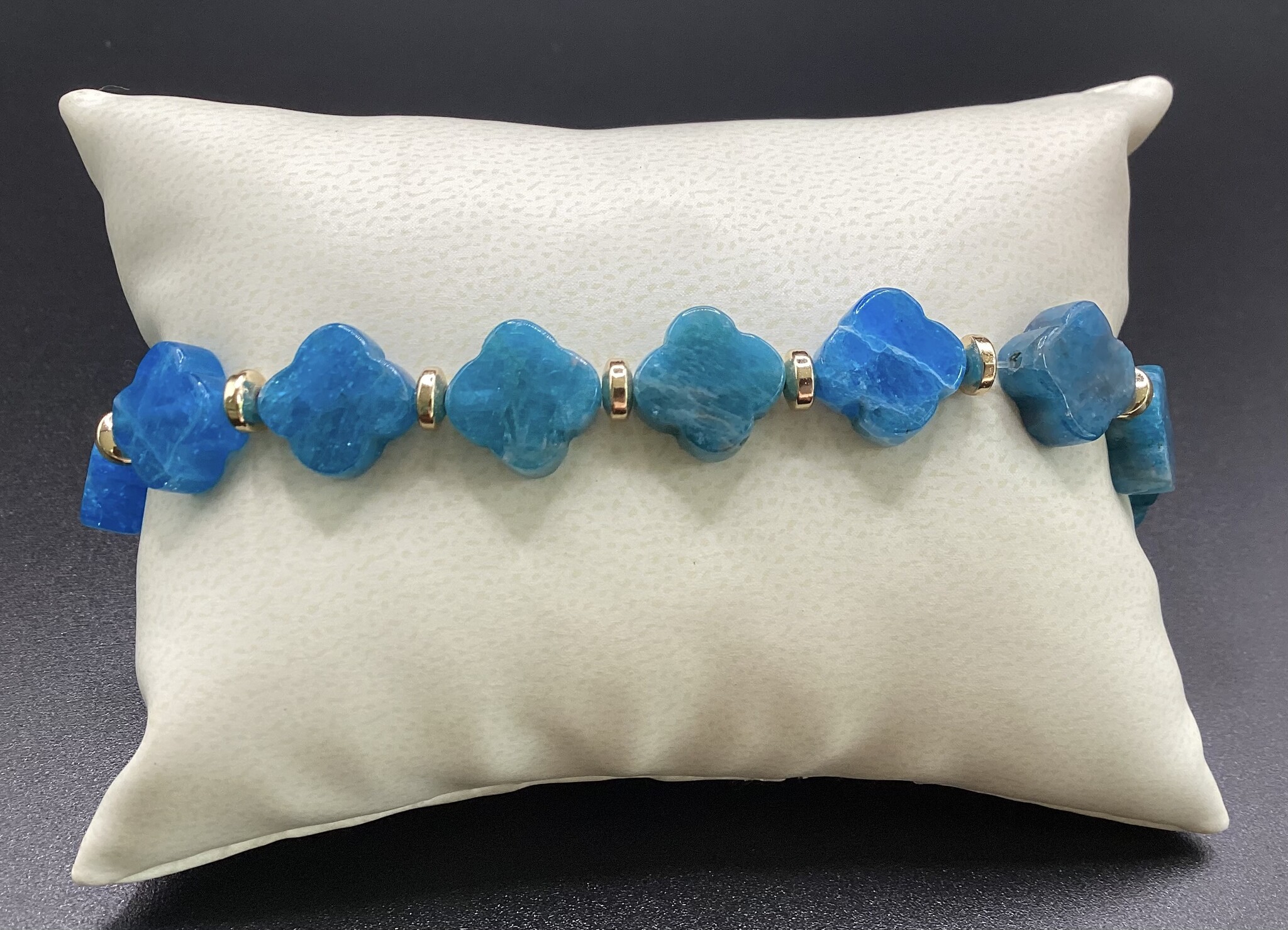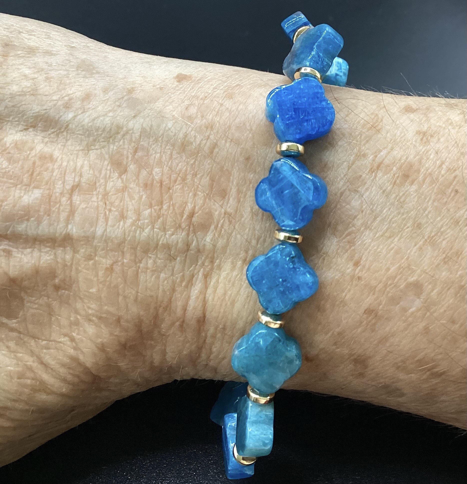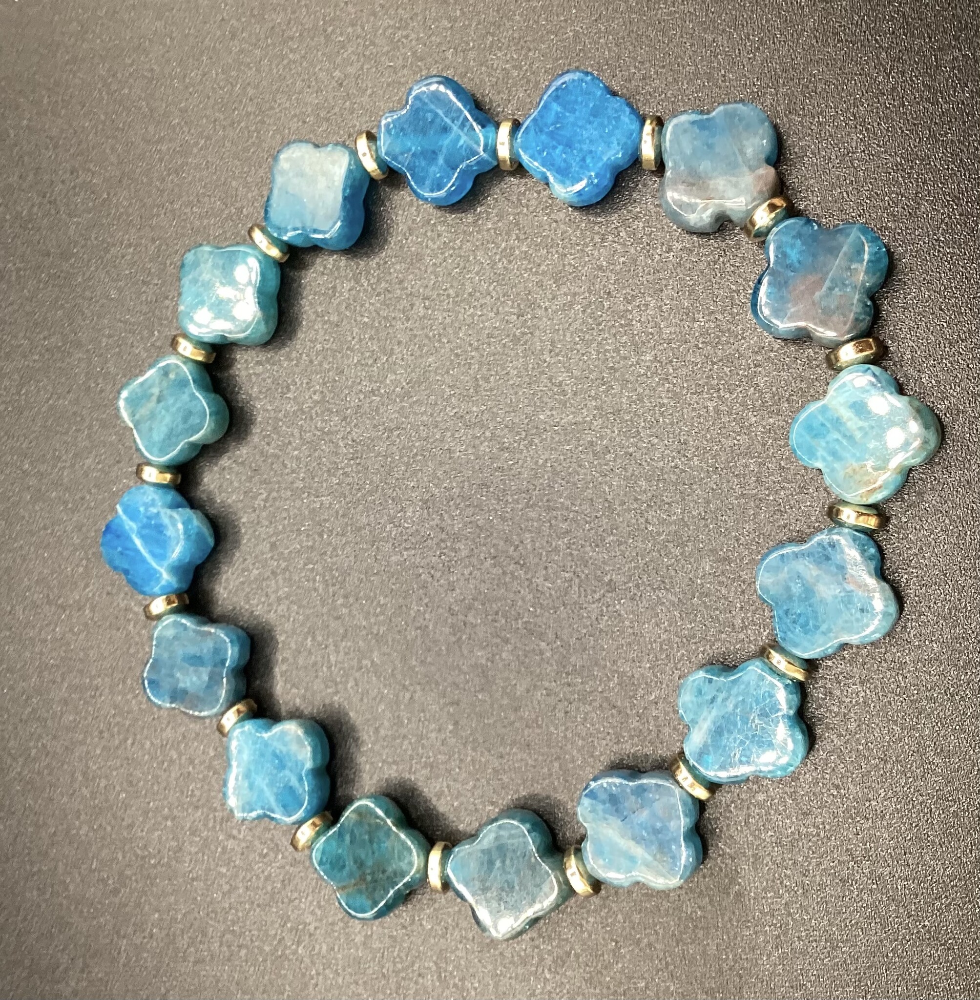 Bracelet en perles d’apatie en forme de trèfle (10 mm), séparées par de petits donuts en hématite.