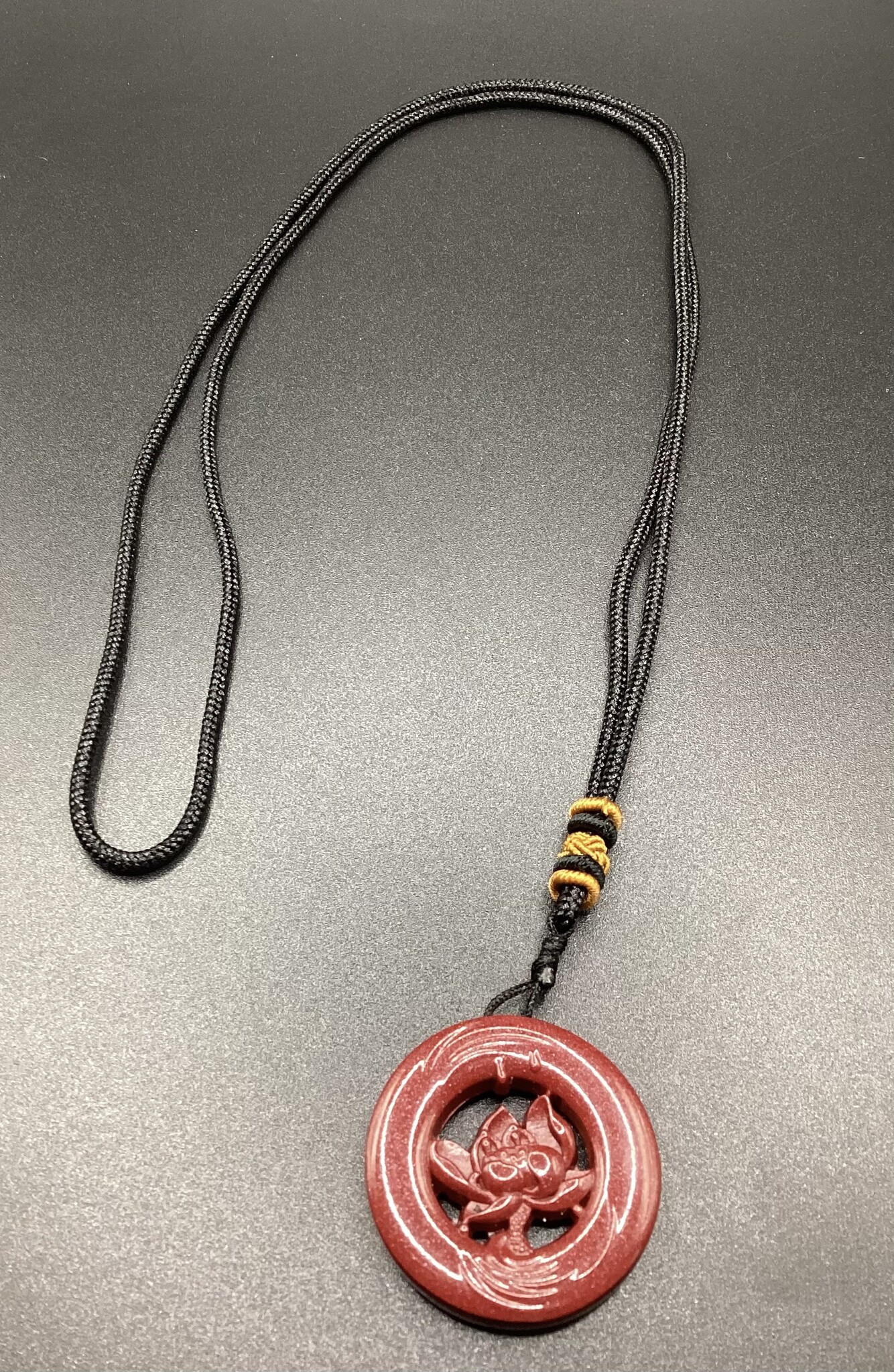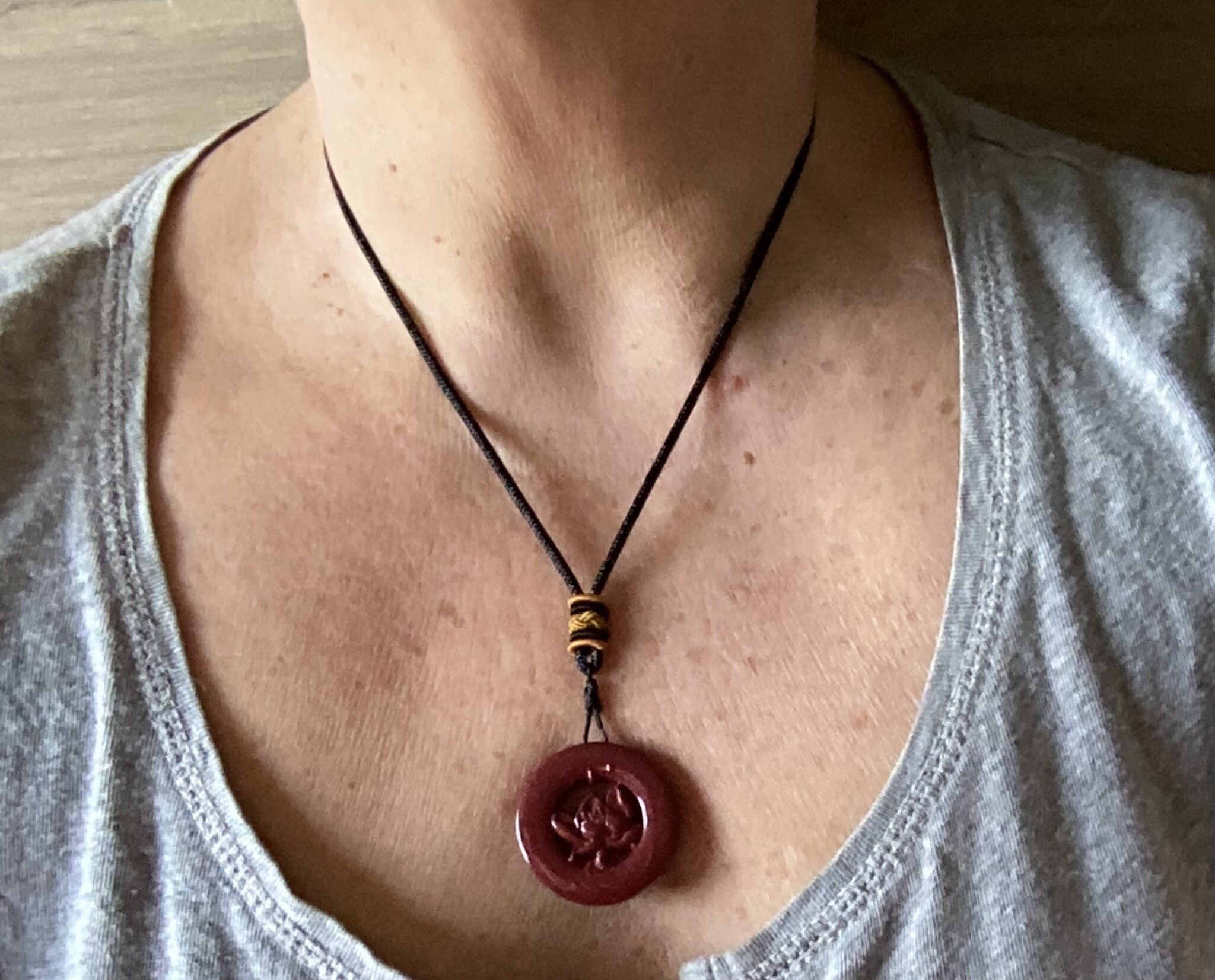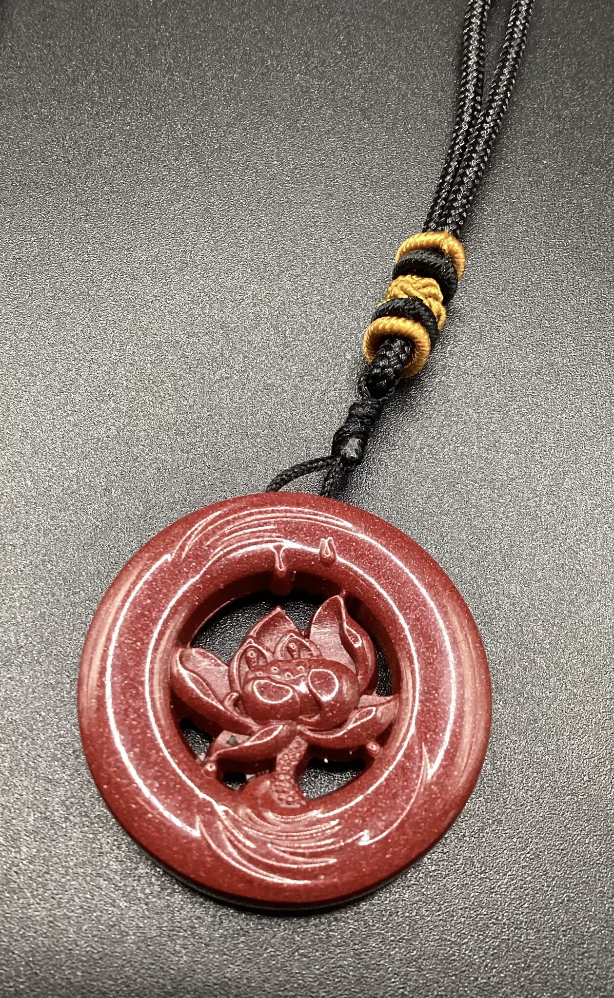 Joli pendentif lotus en cinabre, sur un cordon. Belle qualité de cinabre.