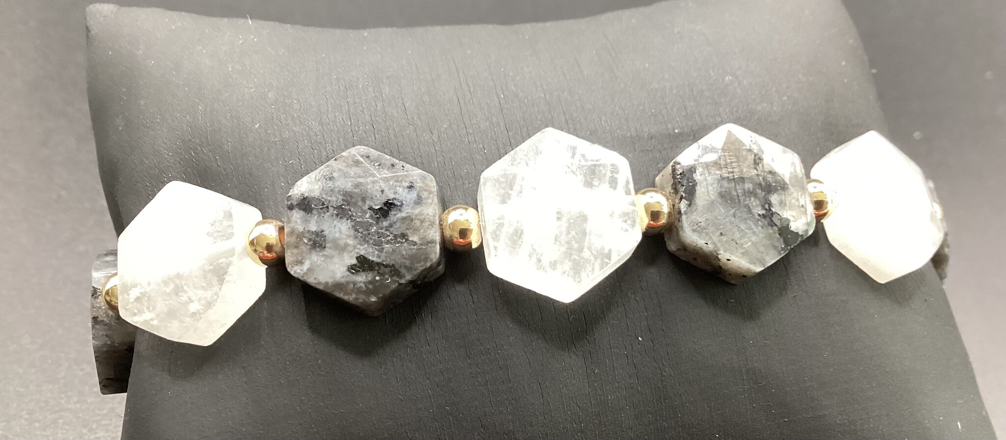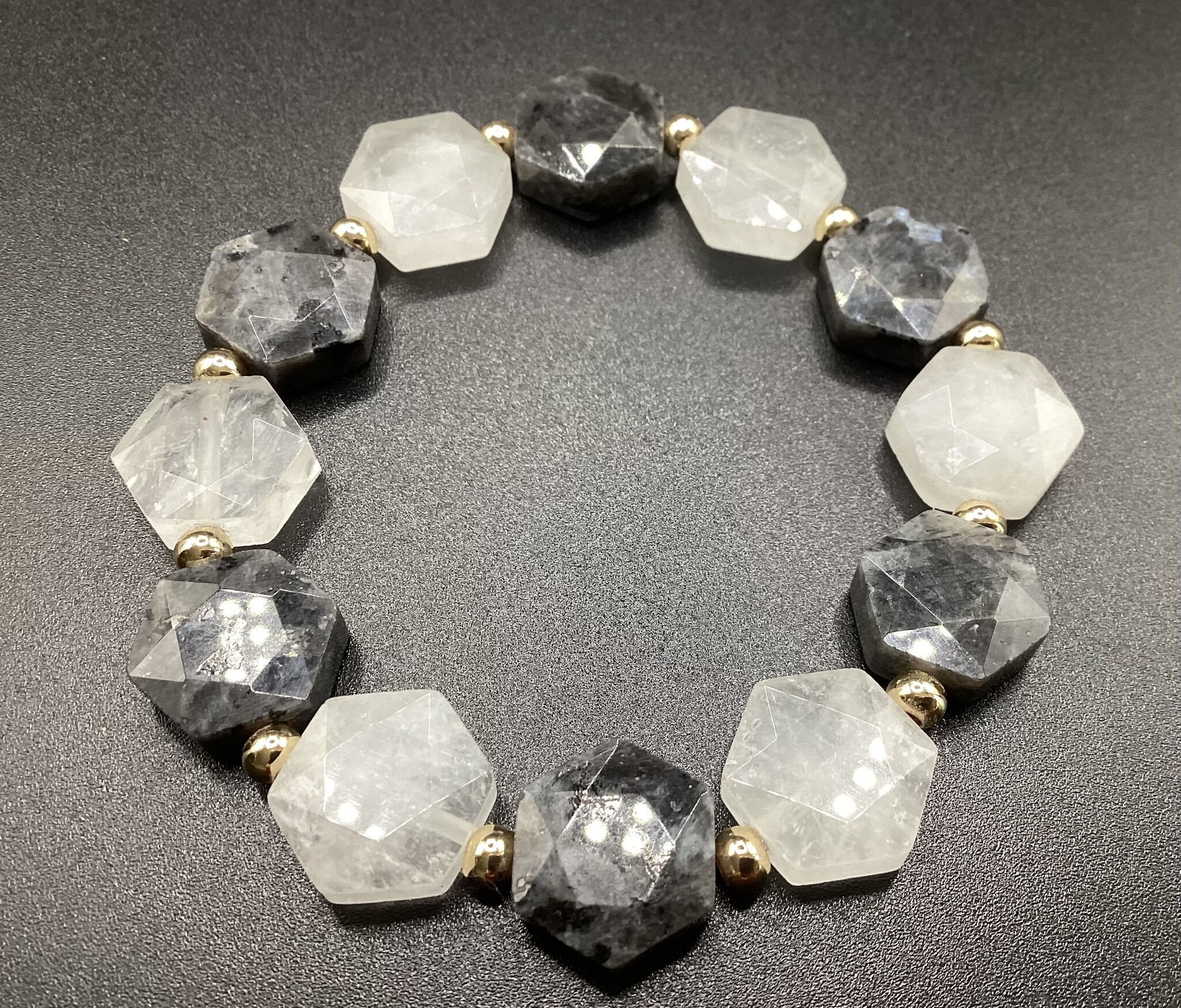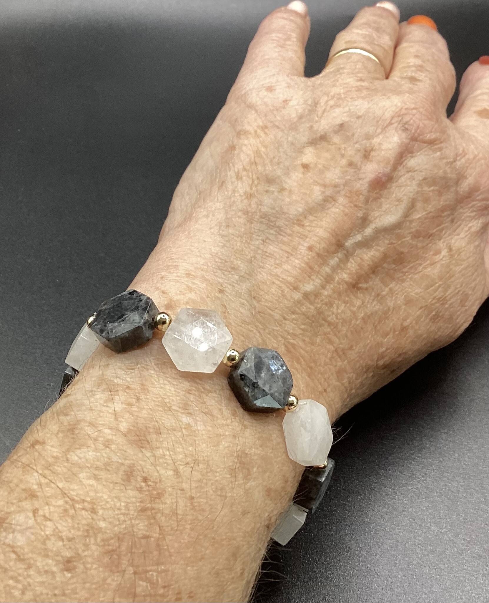 Bracelet en perles hexagonales de larvilite et cristal de roche. Petites perles intercalaires en acier inoxydable. Très lumineux et très chic !