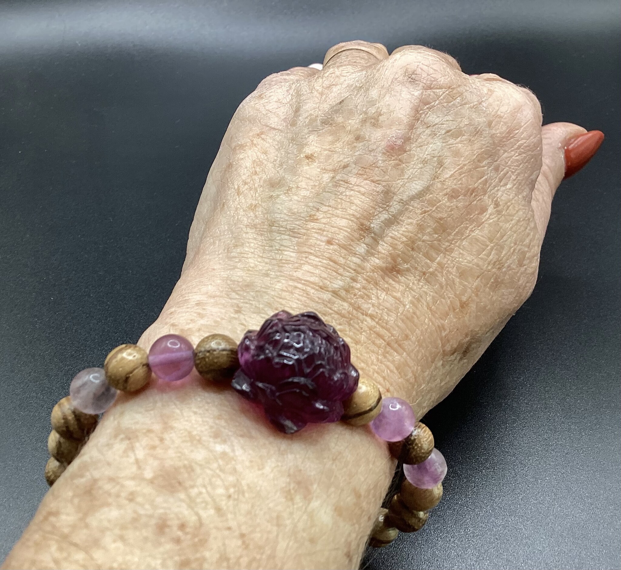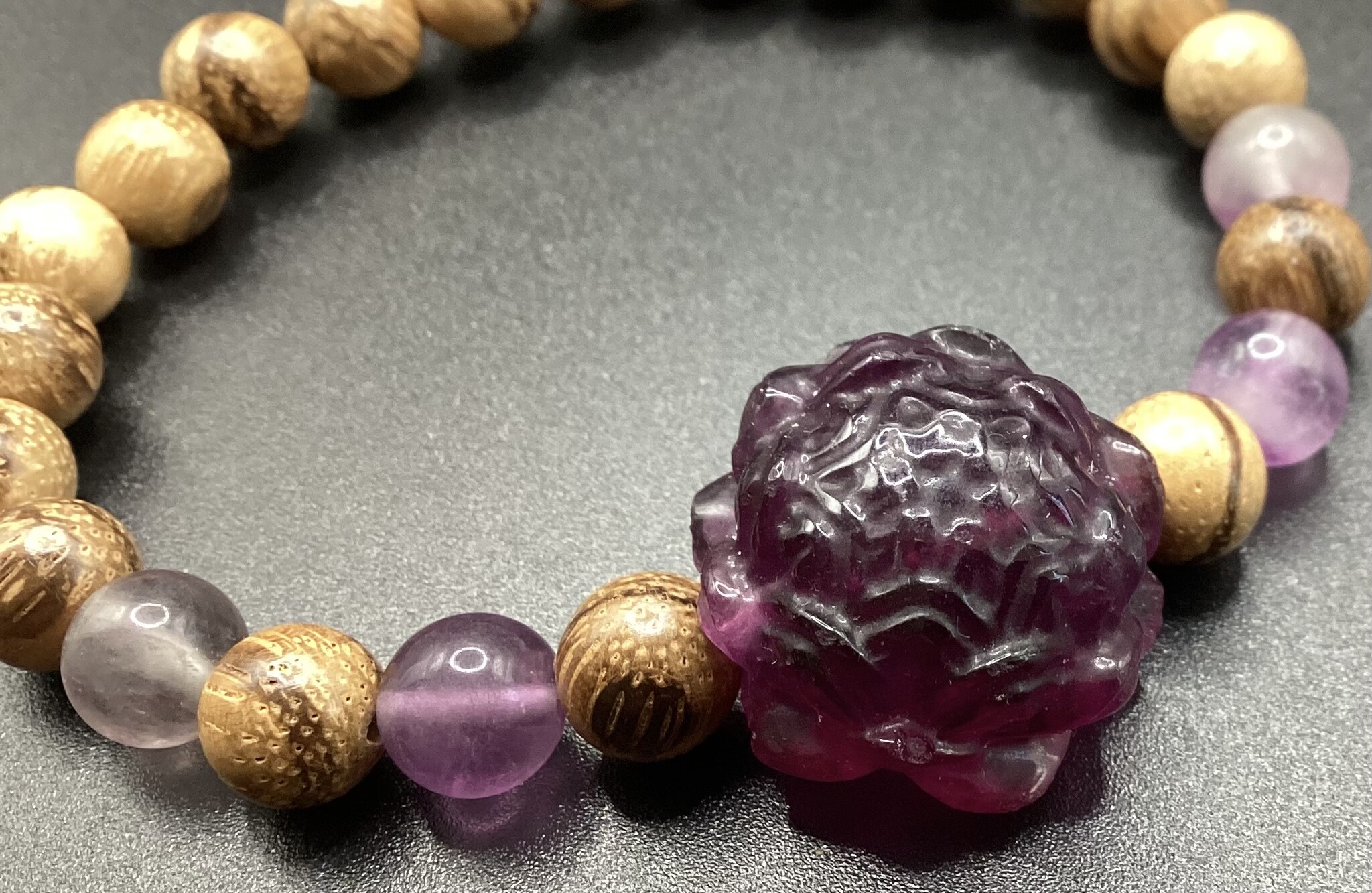 Bracelet en perles de bois d’agar et fluorite (8mm). En son centre un joli lotus en fluorite.. il est tellement beau et se marie parfaitement avec le bois !