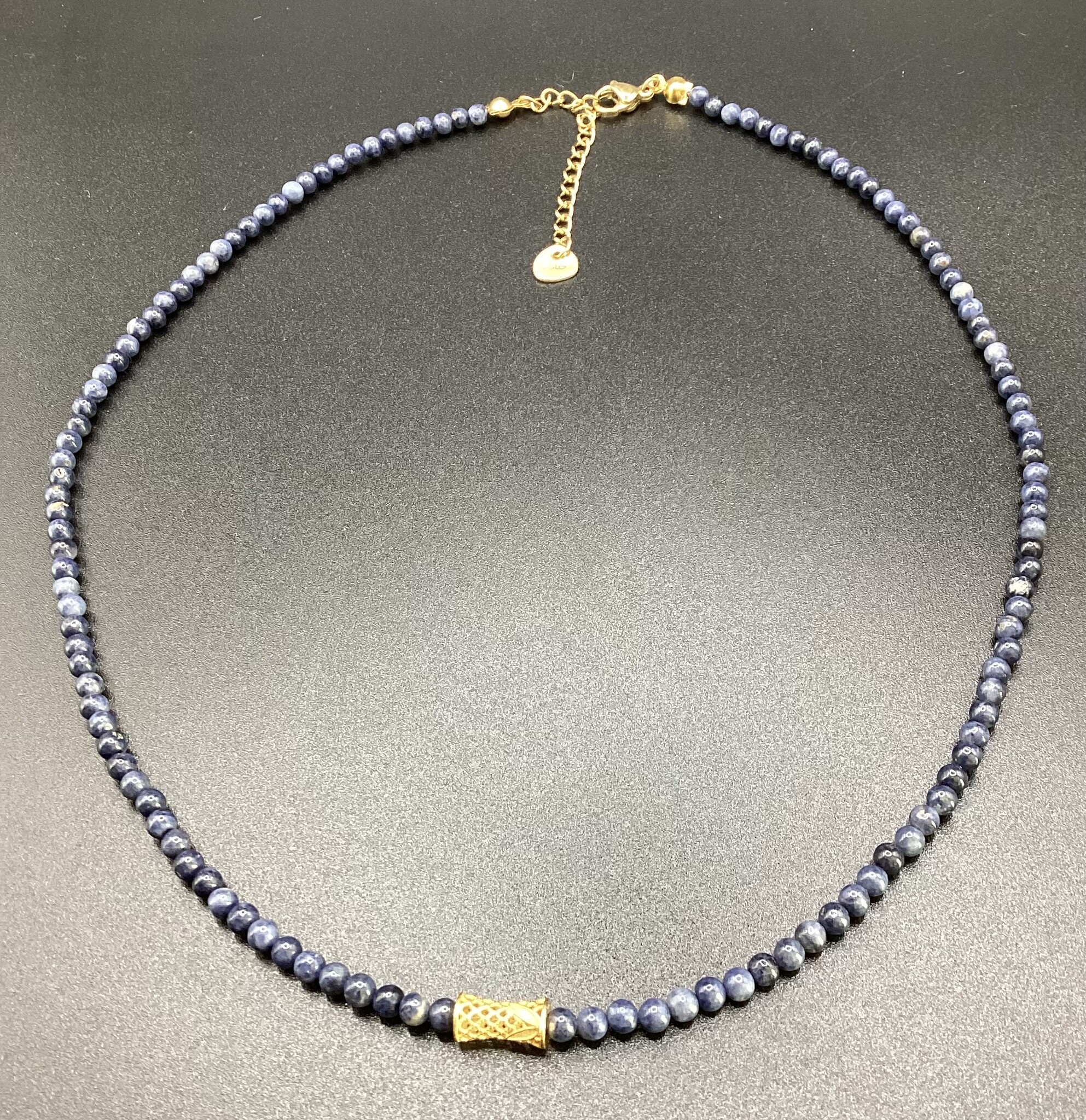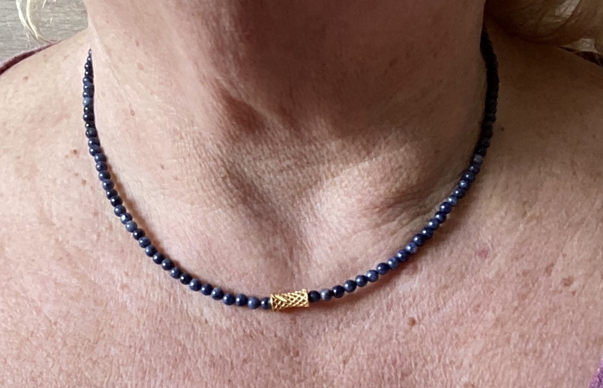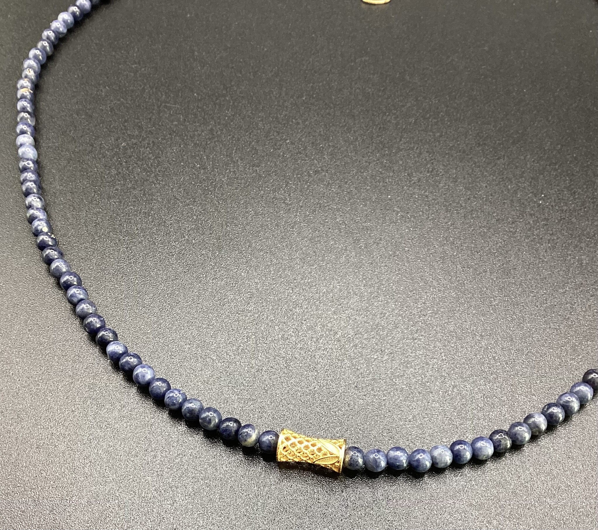 Collier en perles de saphir (3mm), délicates… en son centre un petit tube aux deux feuilles de bambou, 30 % argent 70 % alliage (ne s’oxyde pas). Fermoir en acier inoxydable avec chaîne d’extension.