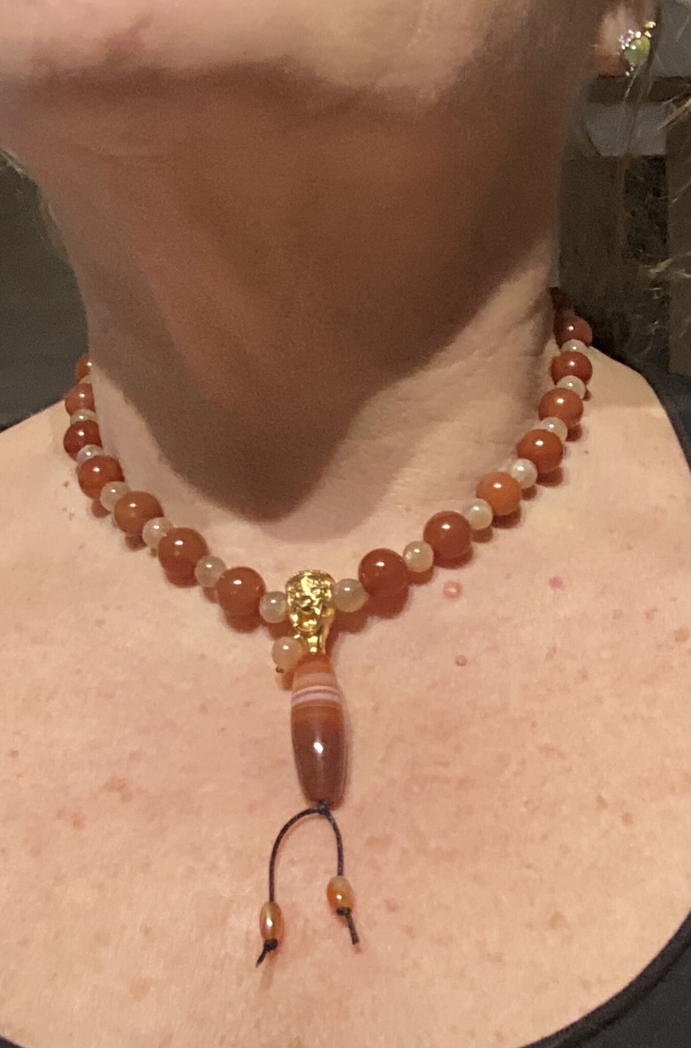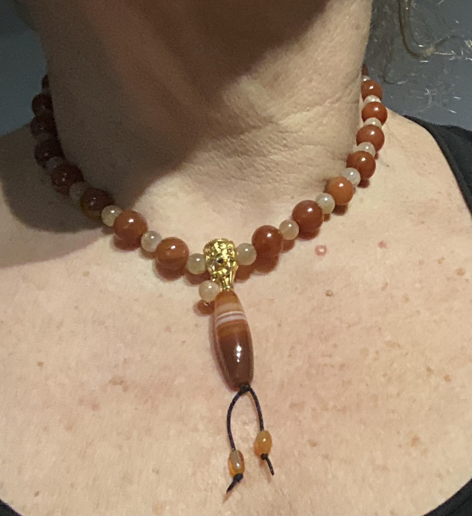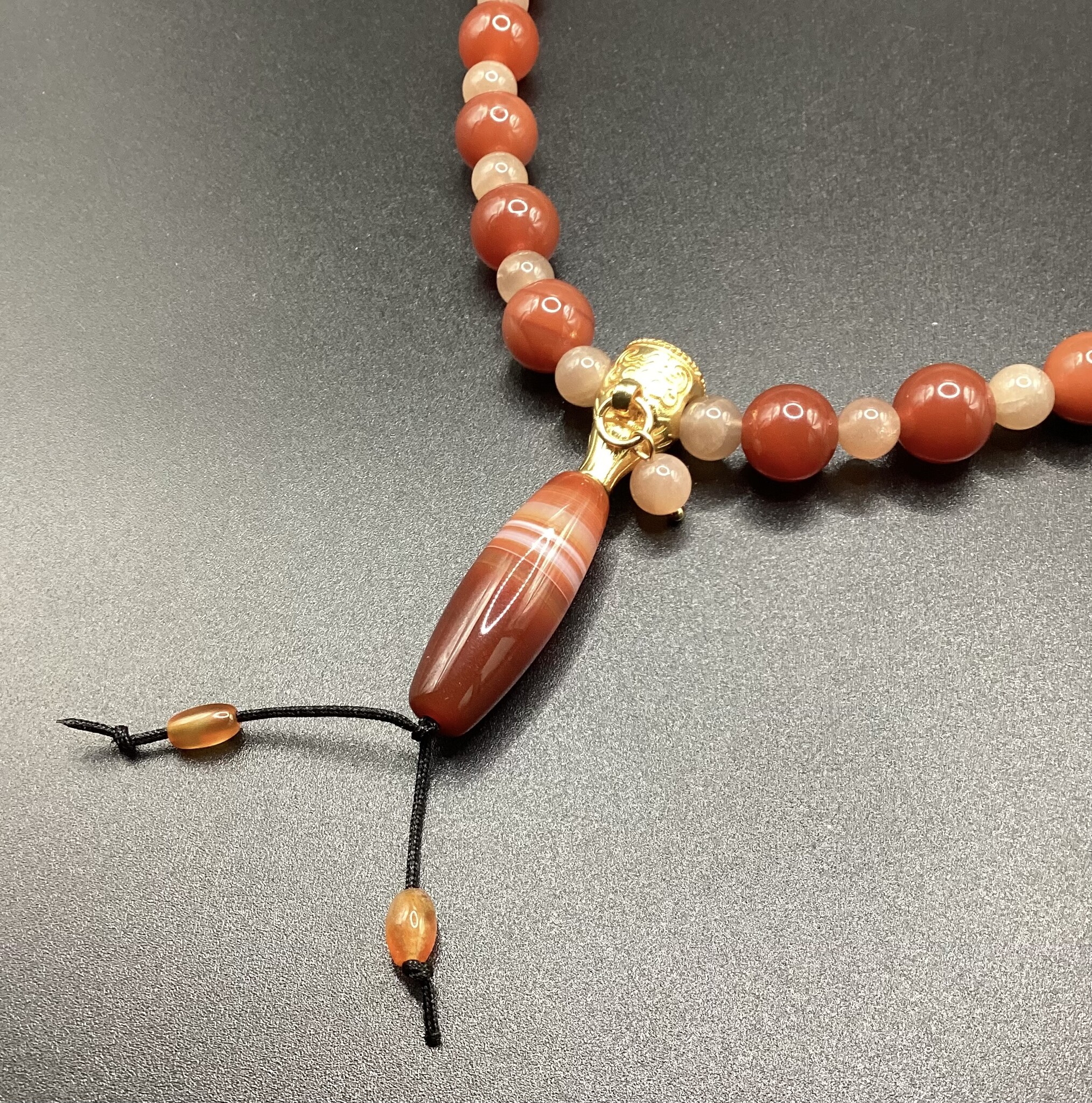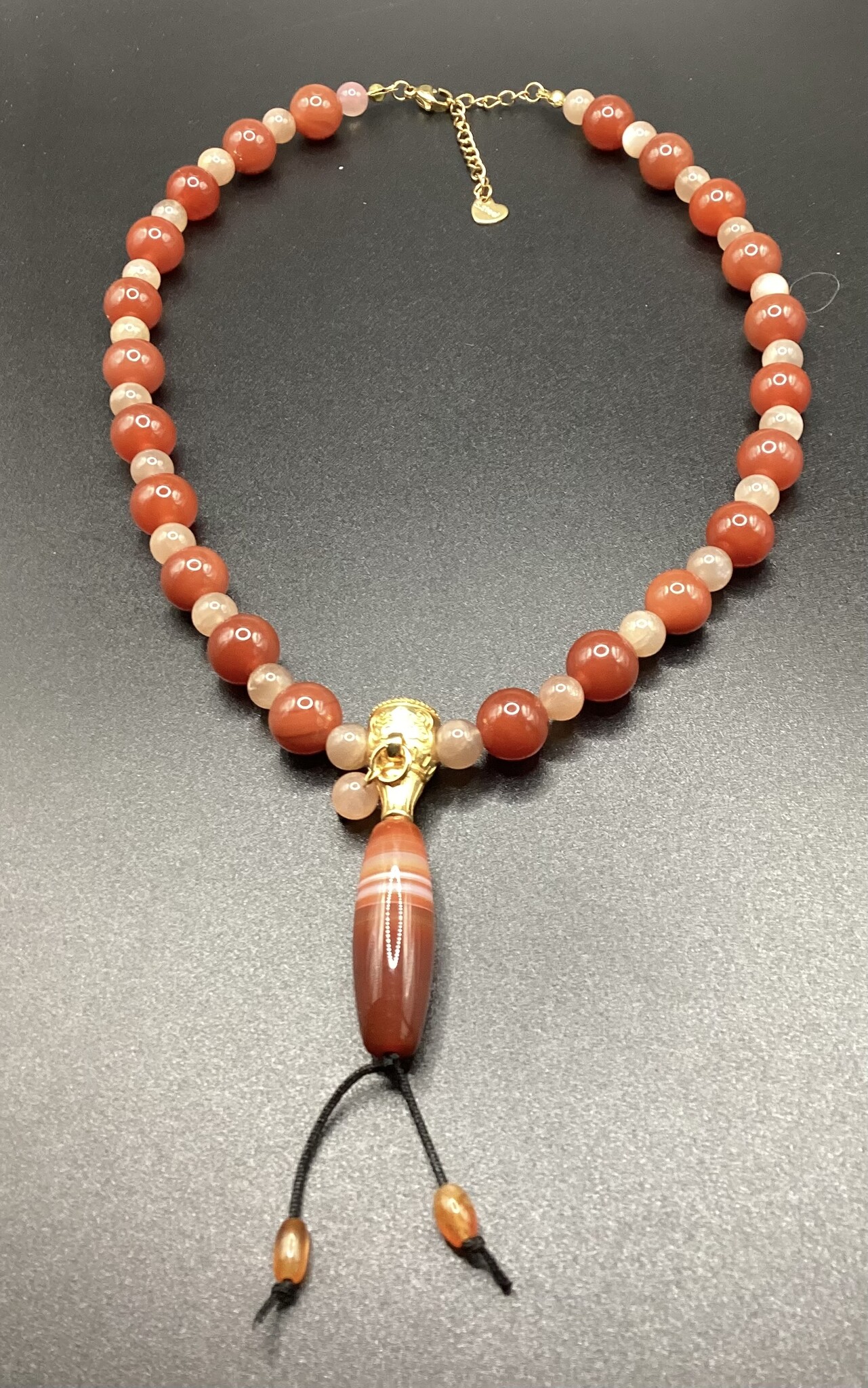 Collier en perles d’agate rouge (10 mm) et pierre de lune pêche (6mm). En son centre une perle de connection de Mala 30 % argent -70 % alliage ( ne s’oxyde pas), suivie d’une longue perle d’agate rubannée (cornaline). Le fermoir est en acier inoxydable avec une chaîne d’extension.