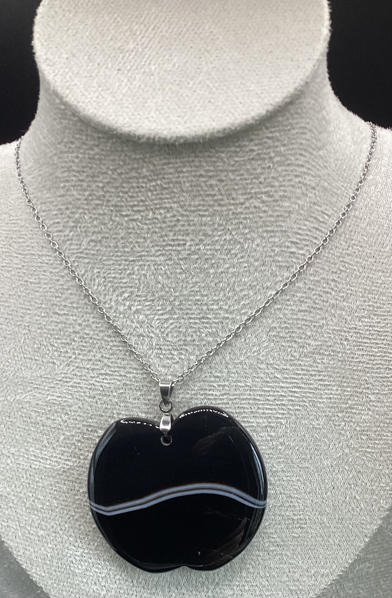 Collier en acier inoxydable et pendentif en forme de pomme, en agate noire rubanée. Bélière et fermoir en acier inoxydable. Une pierre très élégante.