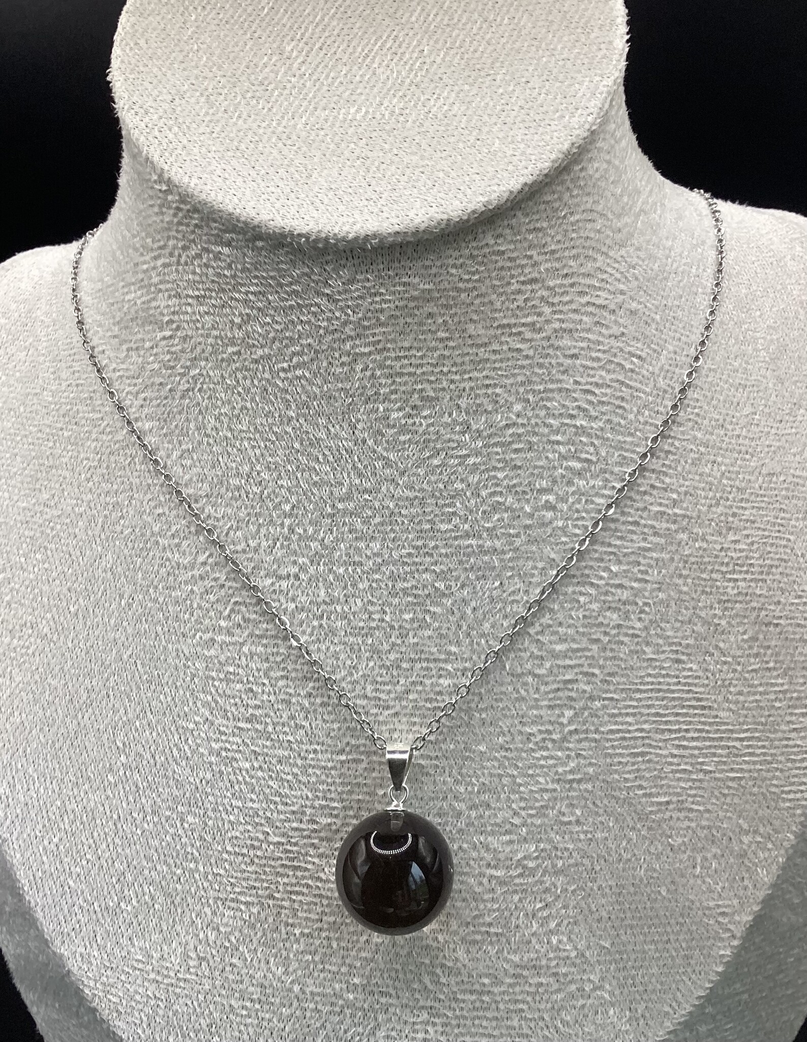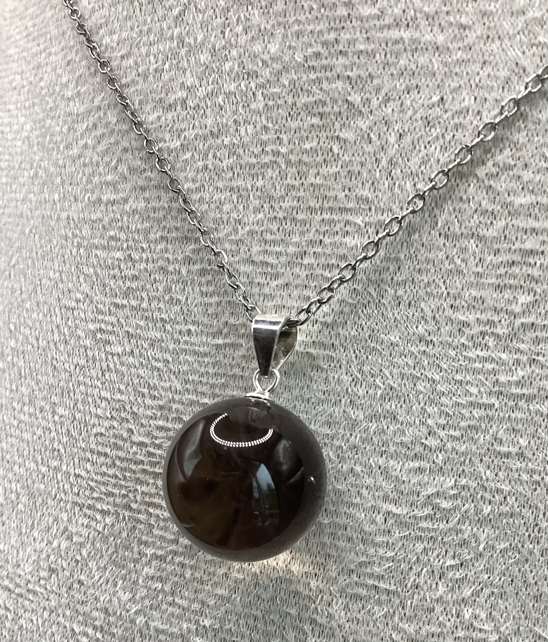 Minimaliste et élégant, sphère de quartz fumé (15 mm) d’une belle transparence, montée sur une chaîne acier inoxydable.