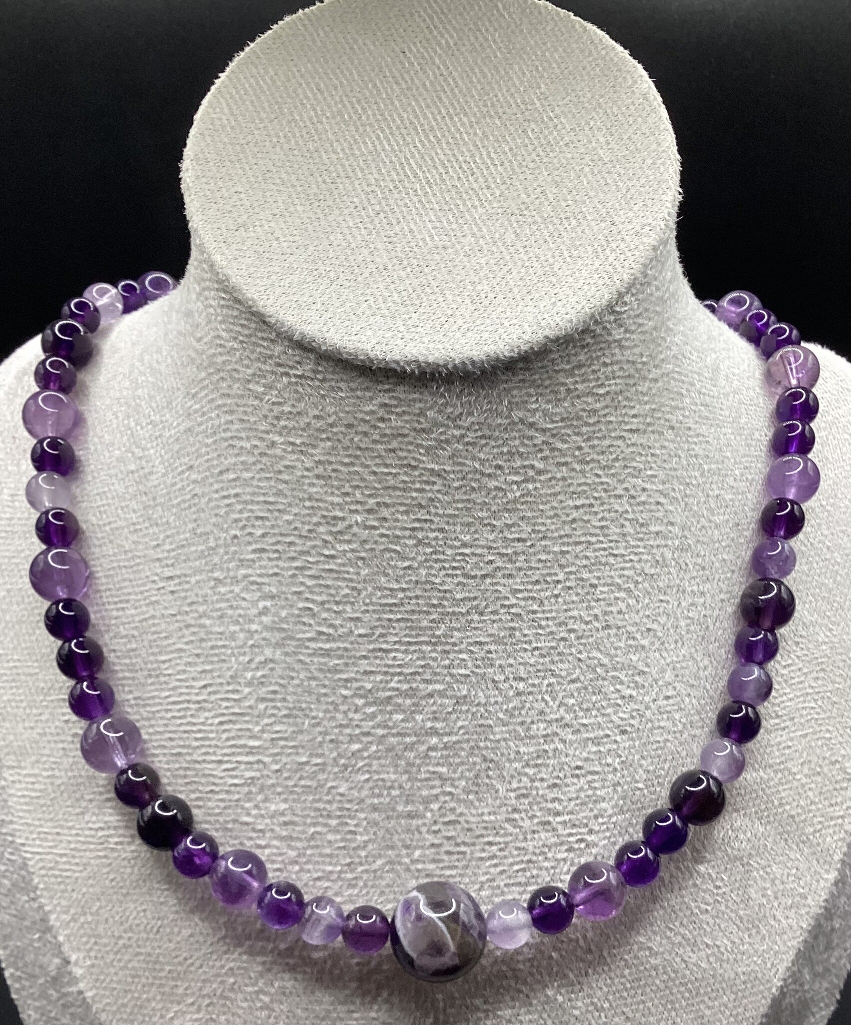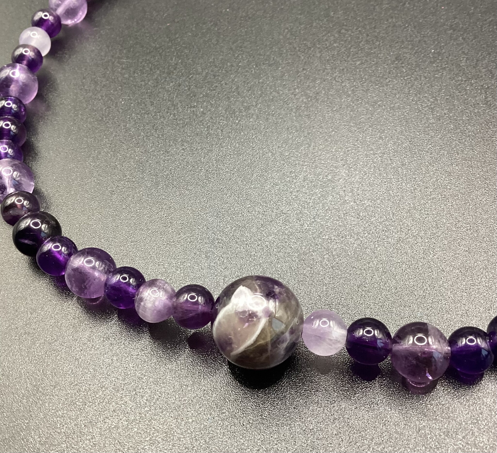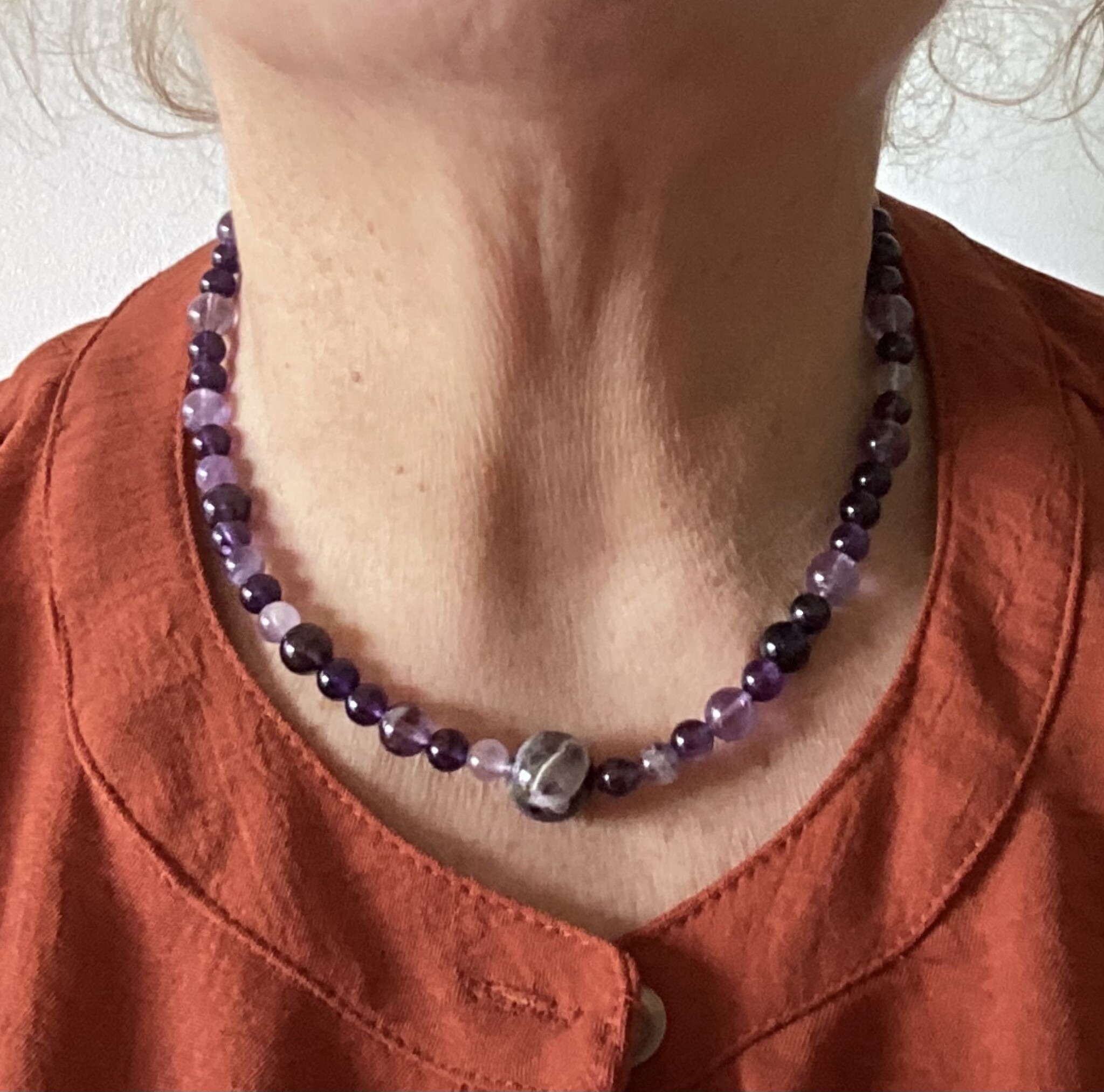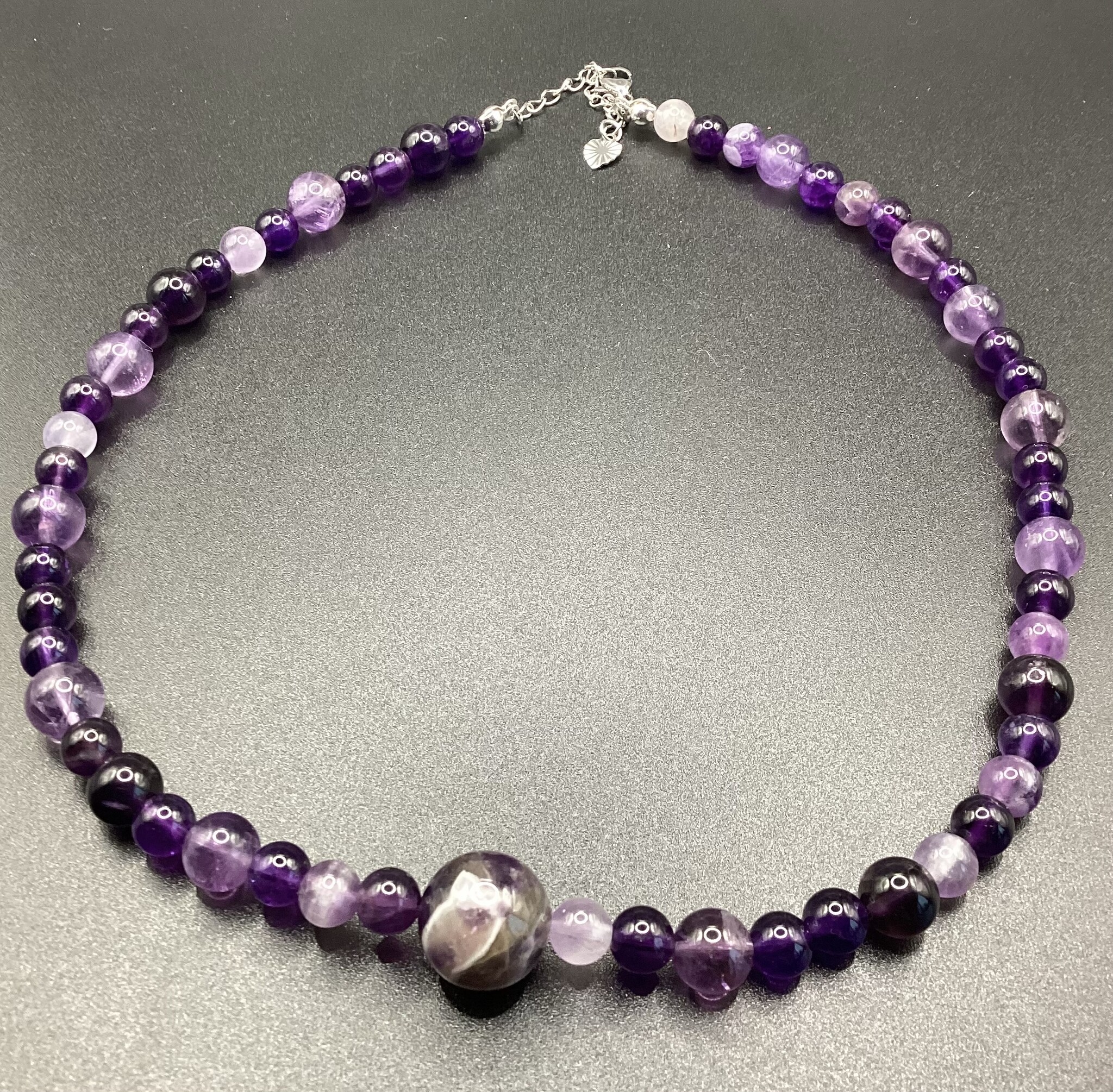 Collier en perles d’améthyste (6mm) de différents nuances, allant du foncé au lavande.. en son centre une grosse perle d’améthyste chevron (13 mm). Le fermoir est en acier inoxydable avec chaîne d’extension.