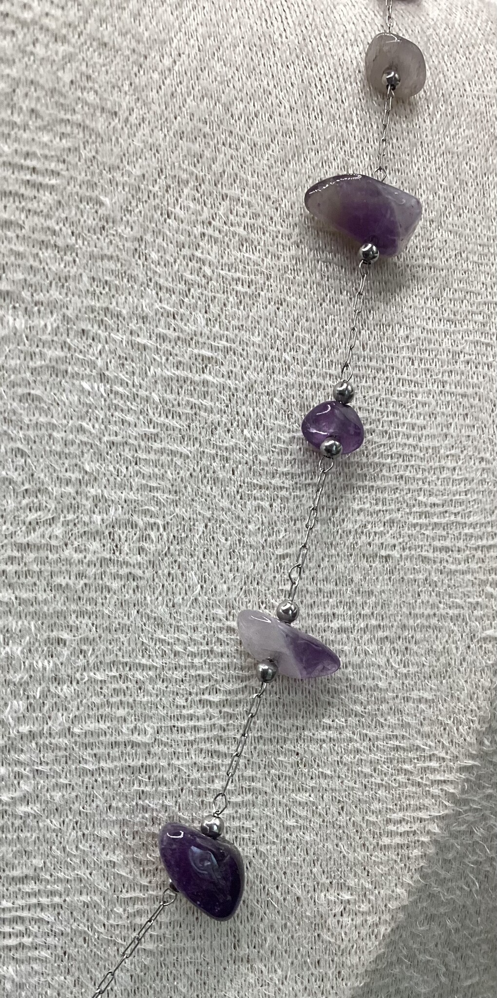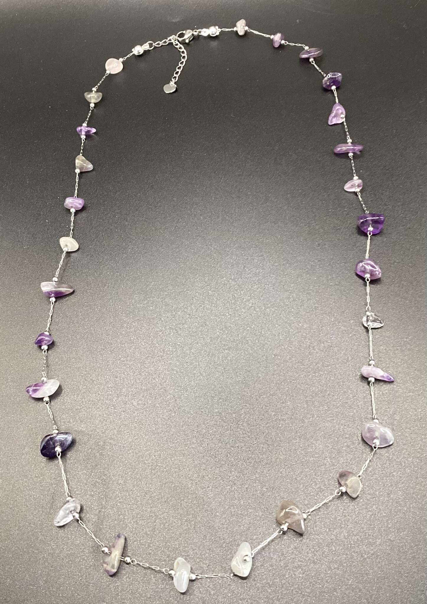 Collier de petites perles d’améthyste sur une fine chaîne en acier inoxydable. Fermoir en acier inoxydable avec une chaîne d’extension.