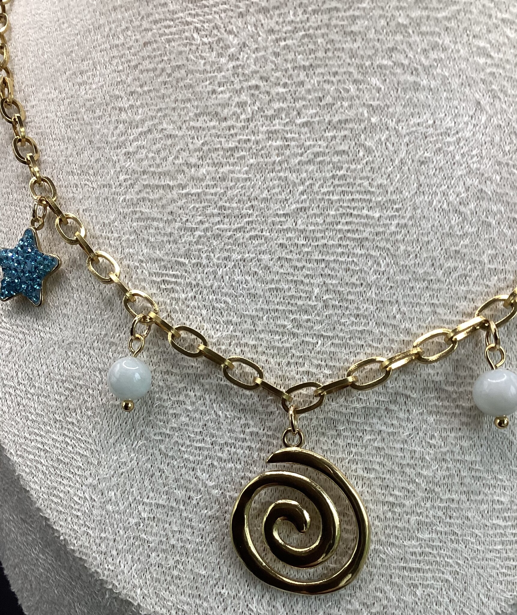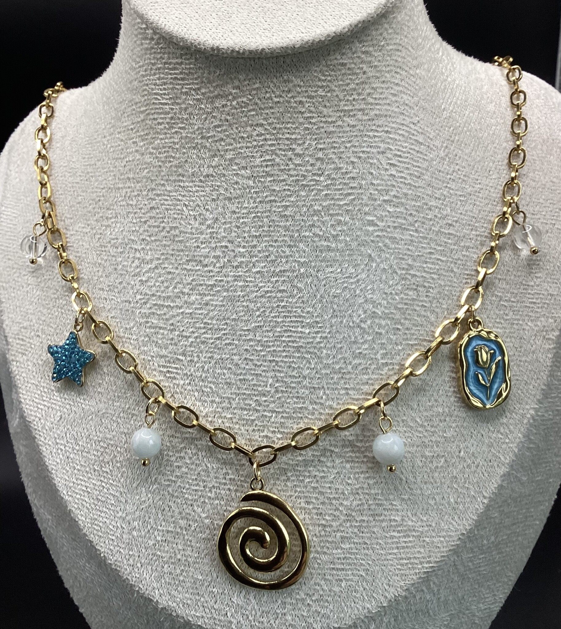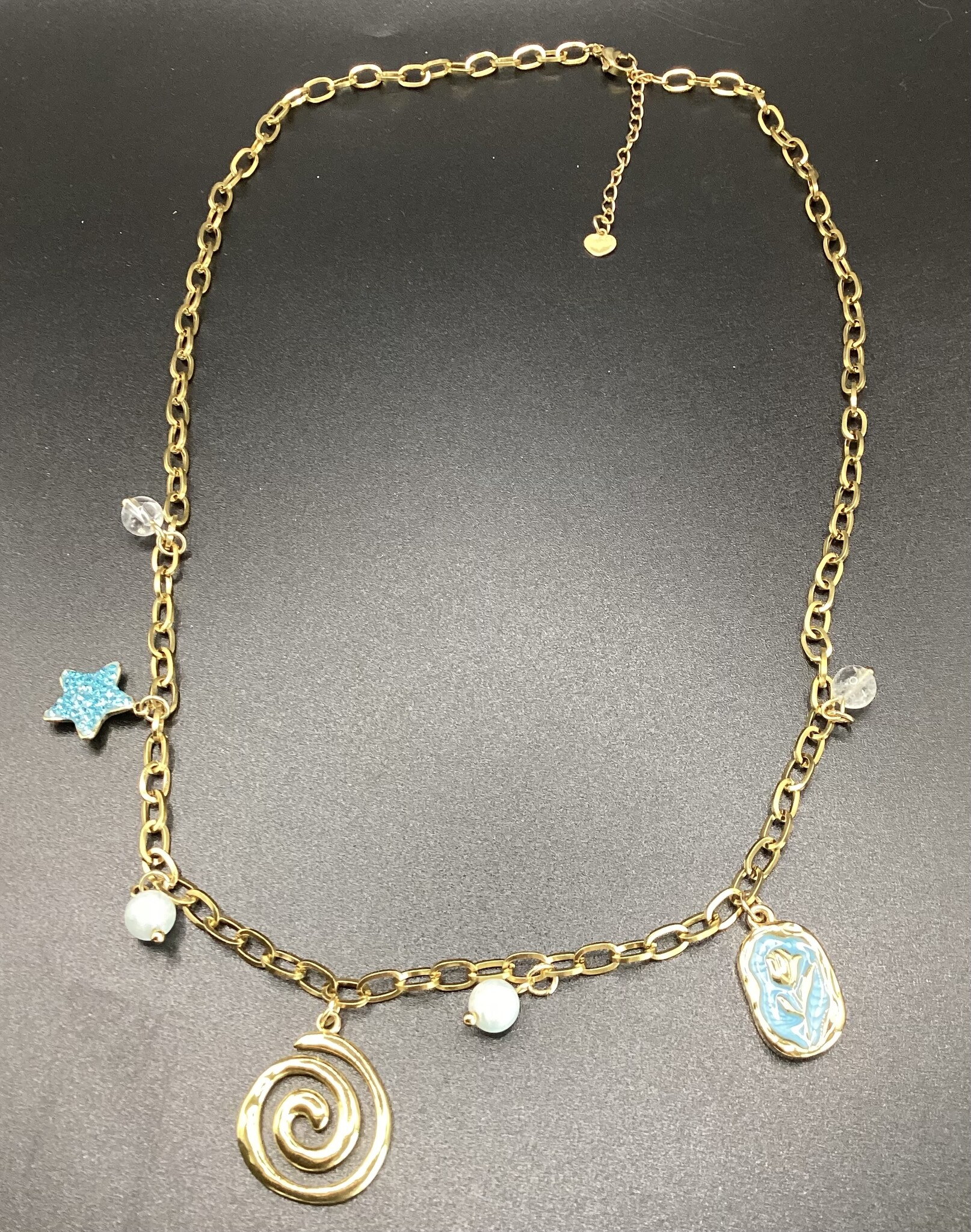 Collier chaîne acier inoxydable avec des breloques variées en acier inoxydable. Quelques perles de calcite et de quartz. Fermoir en acier inoxydable avec d’extension.