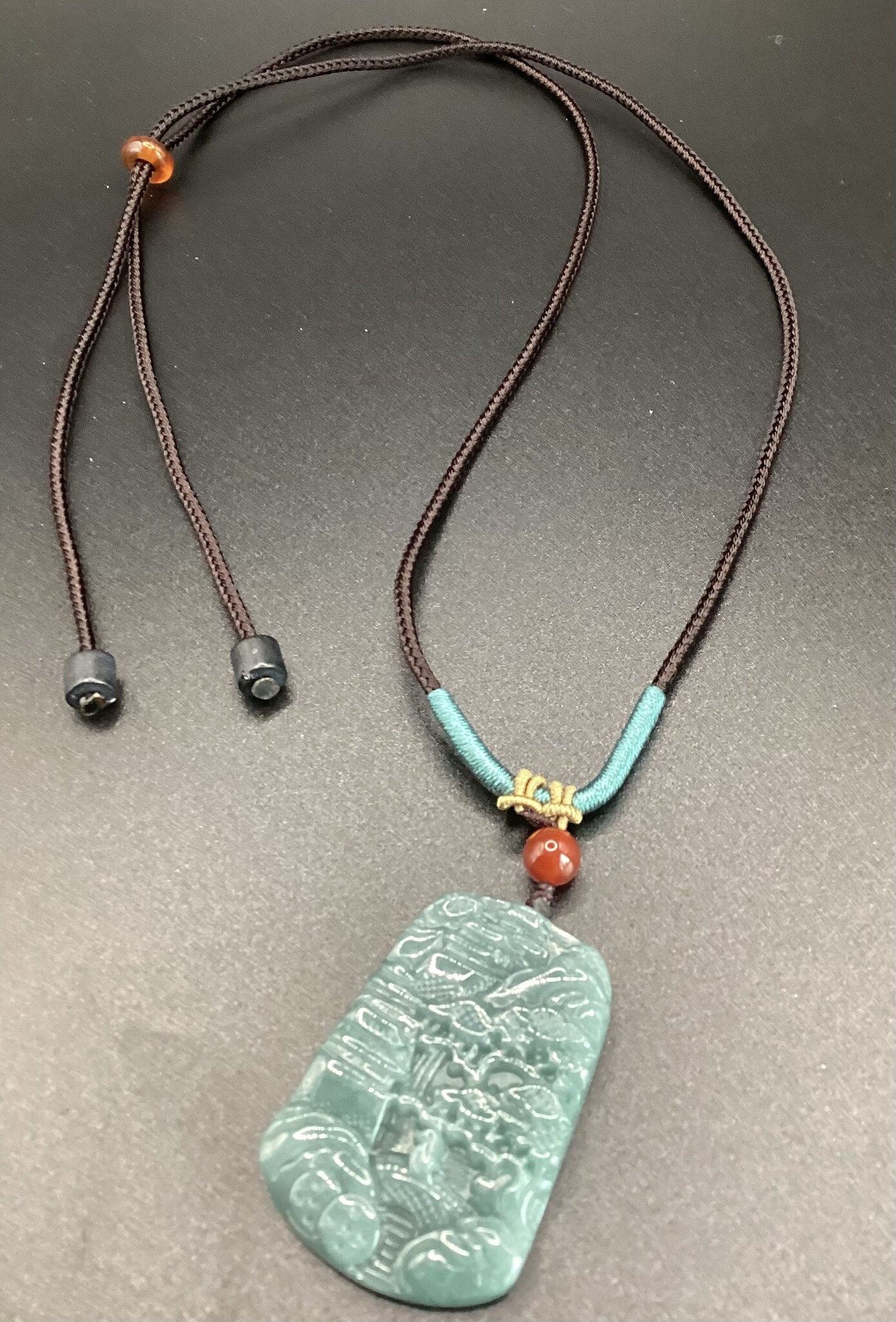 Collier cordon réglable et pendentif en jade jadéite représentant un paysage d’Asie. Image tellement sereine.. belle couleur vert bleuté du jade jadéite…