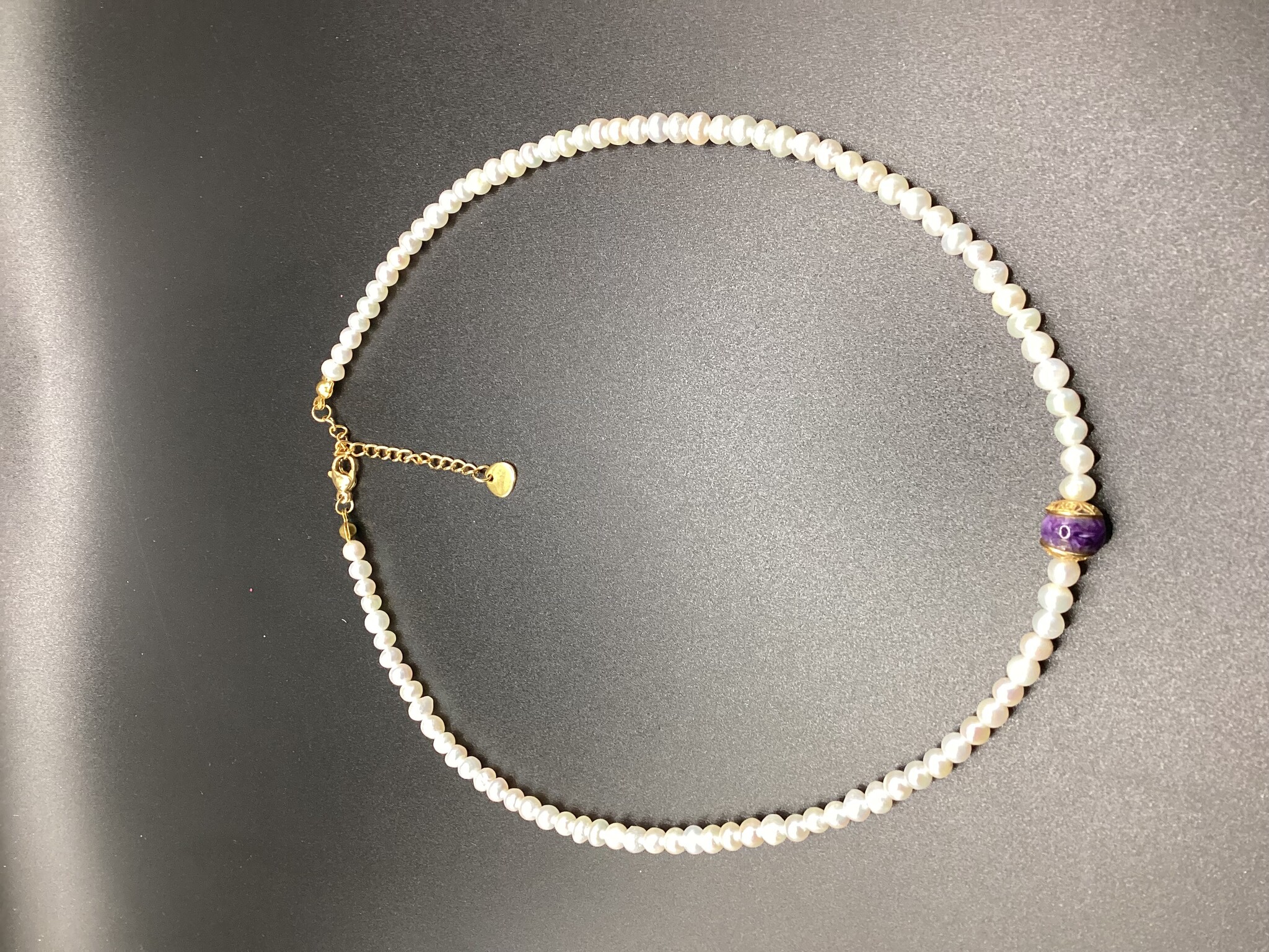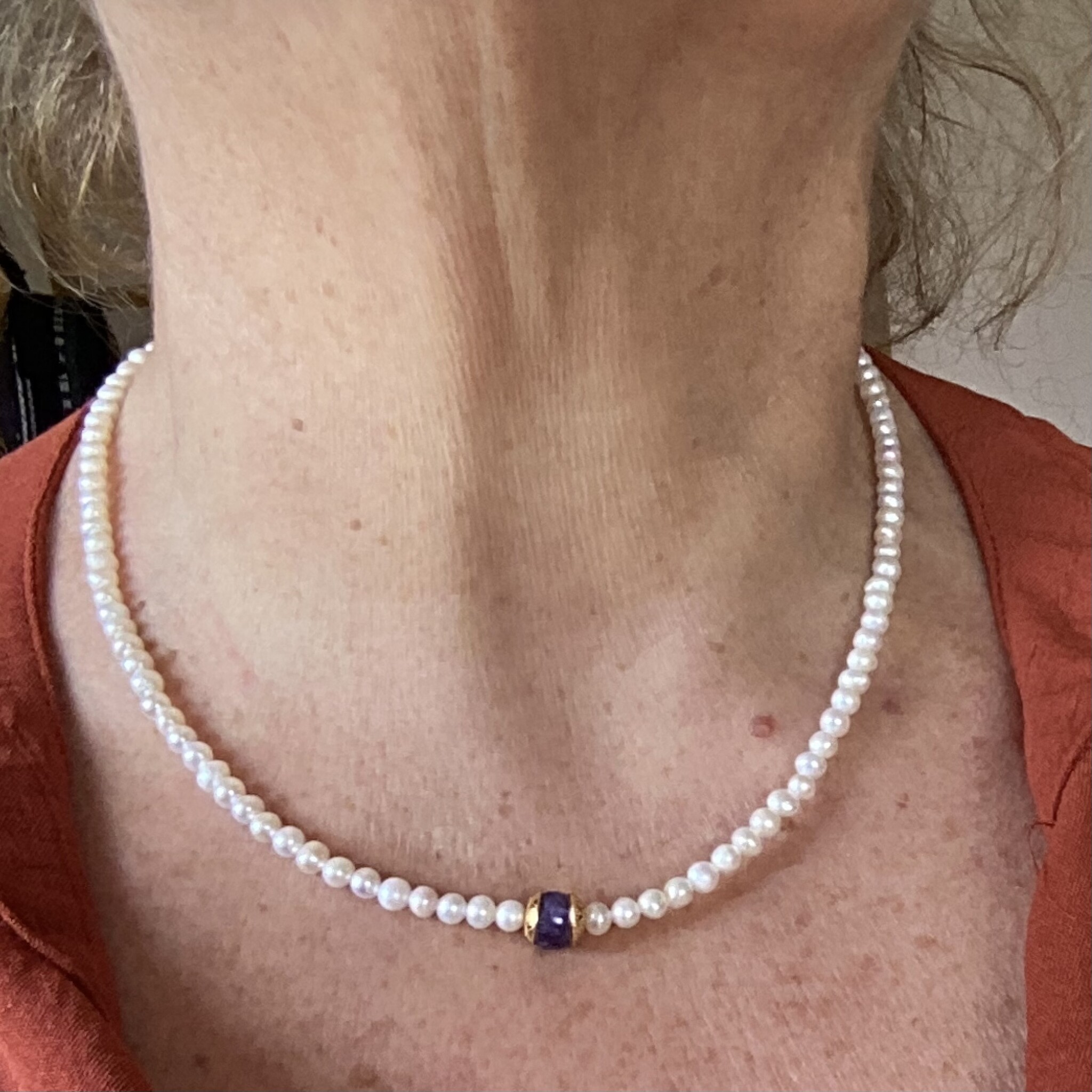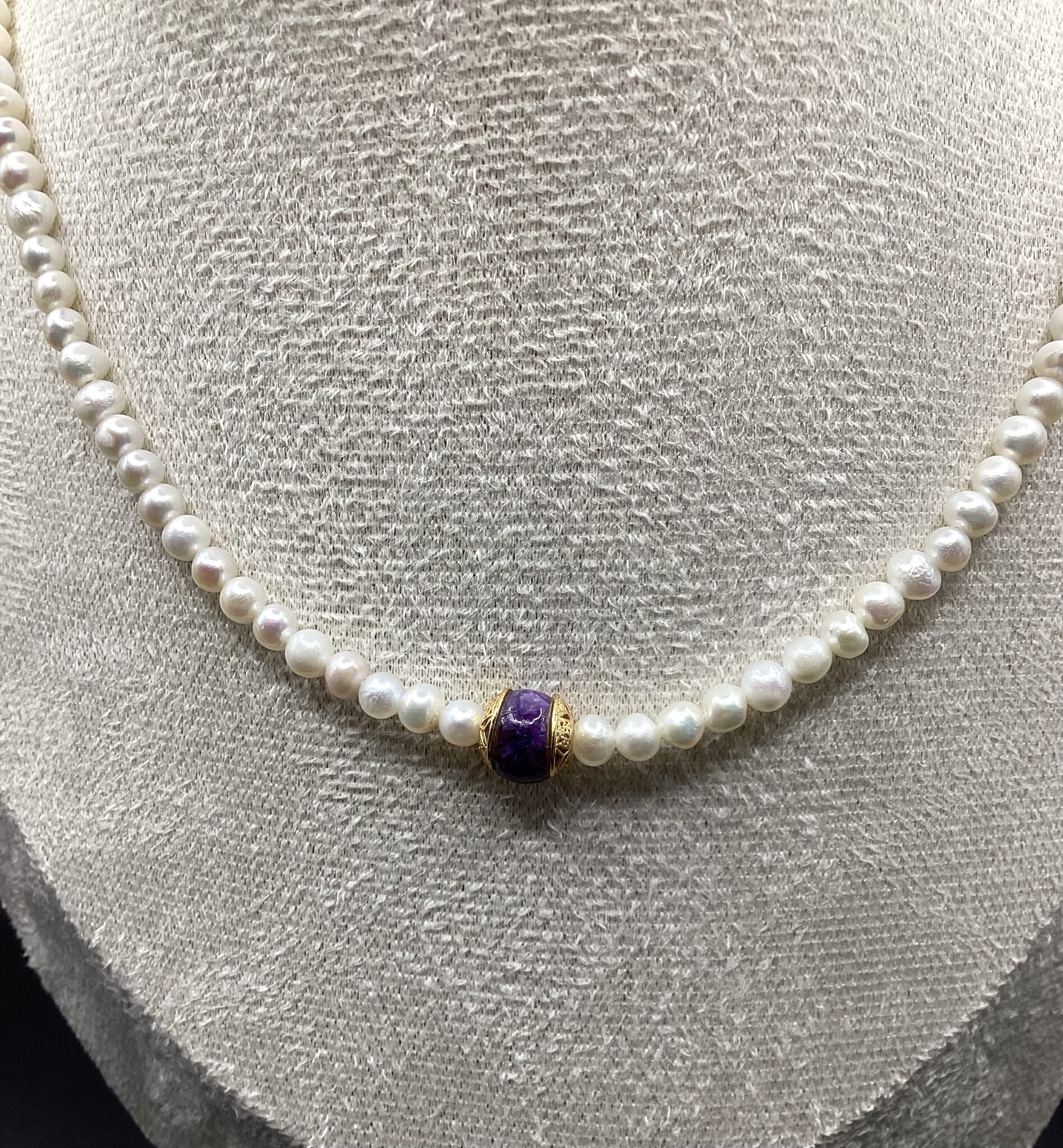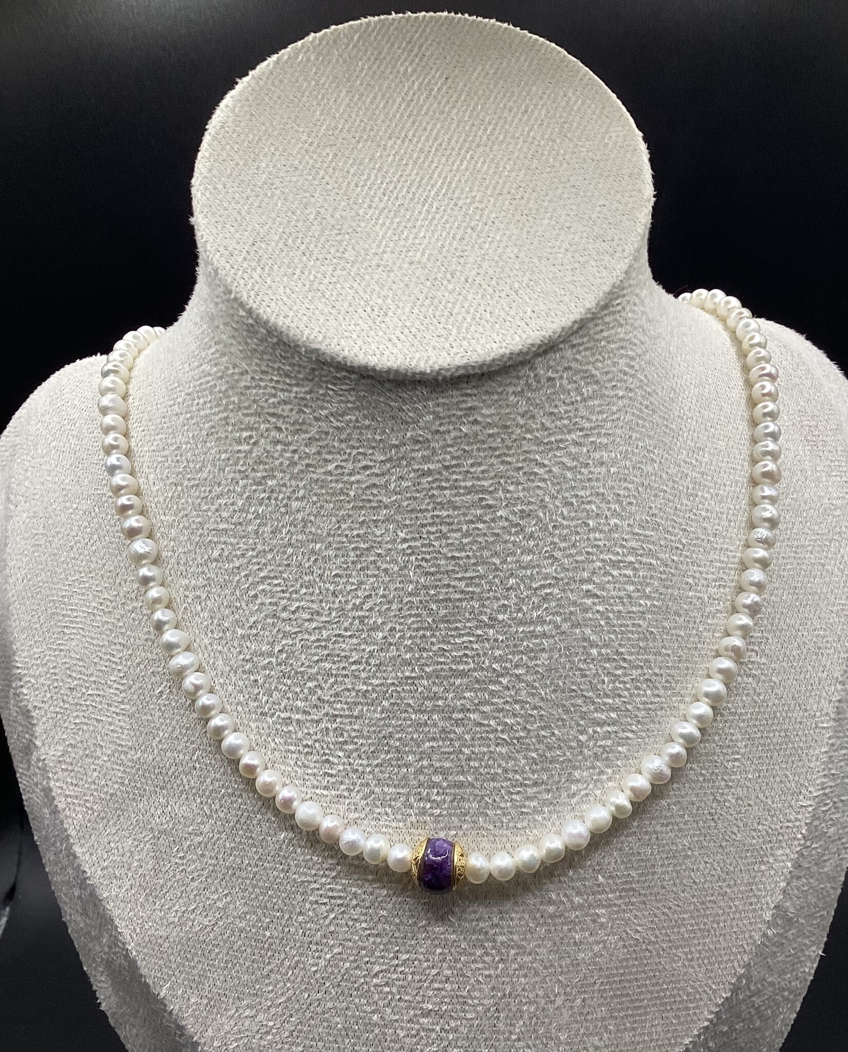 Collier en délicates perles d’eau douce (4mm). En son centre une perle de charoïte sertie d’argent S925 plaqué or. Fermoir en acier inoxydable avec chaîne d’extension.
