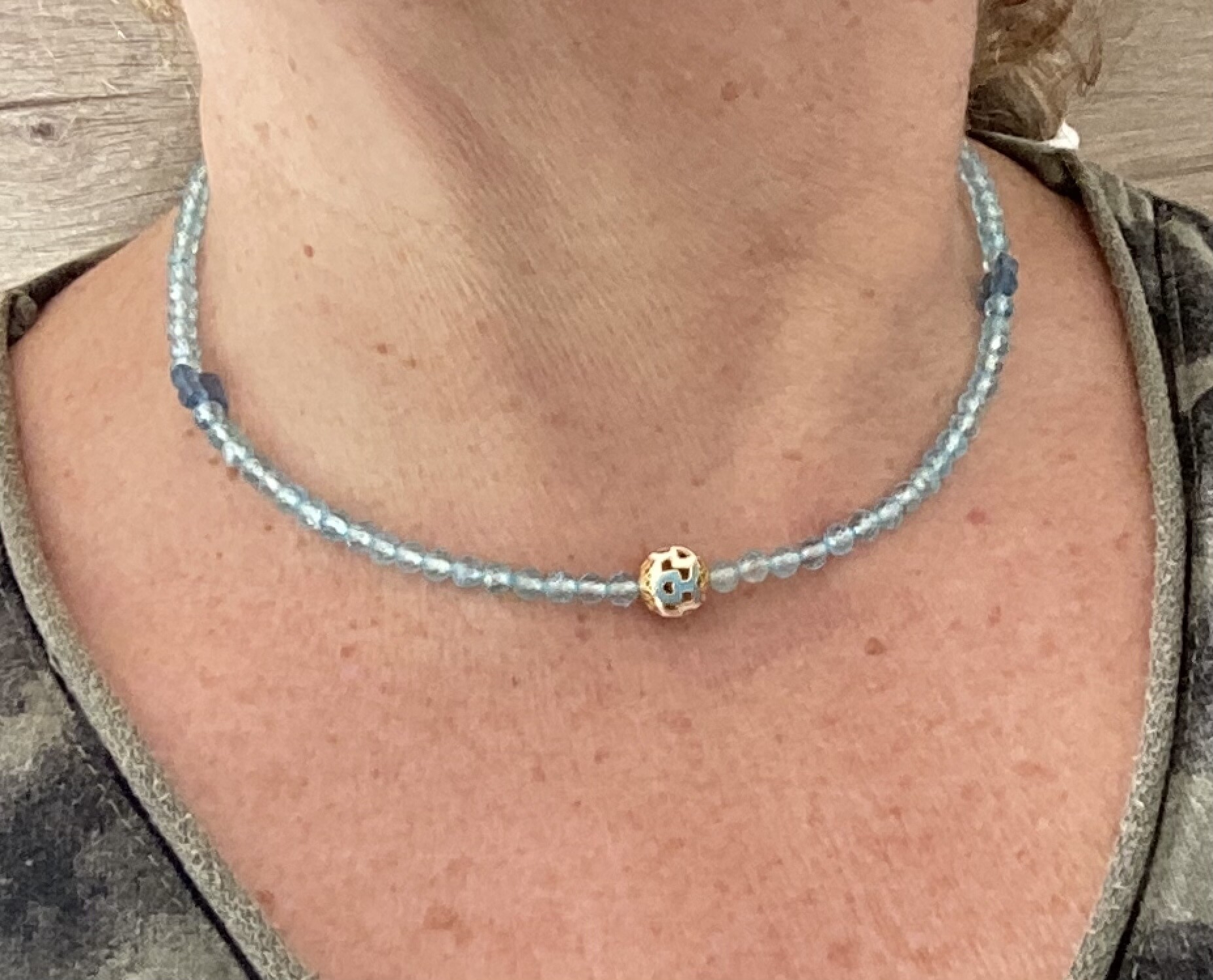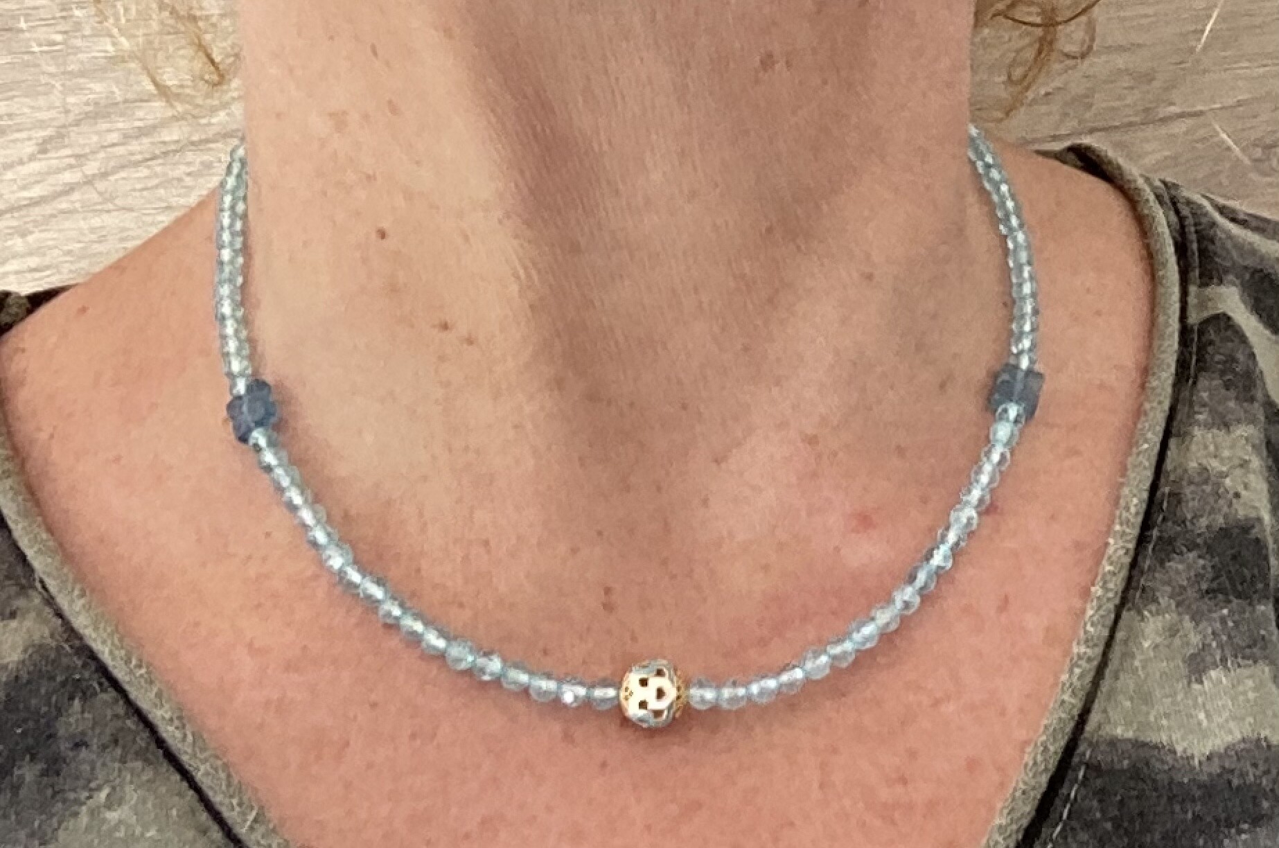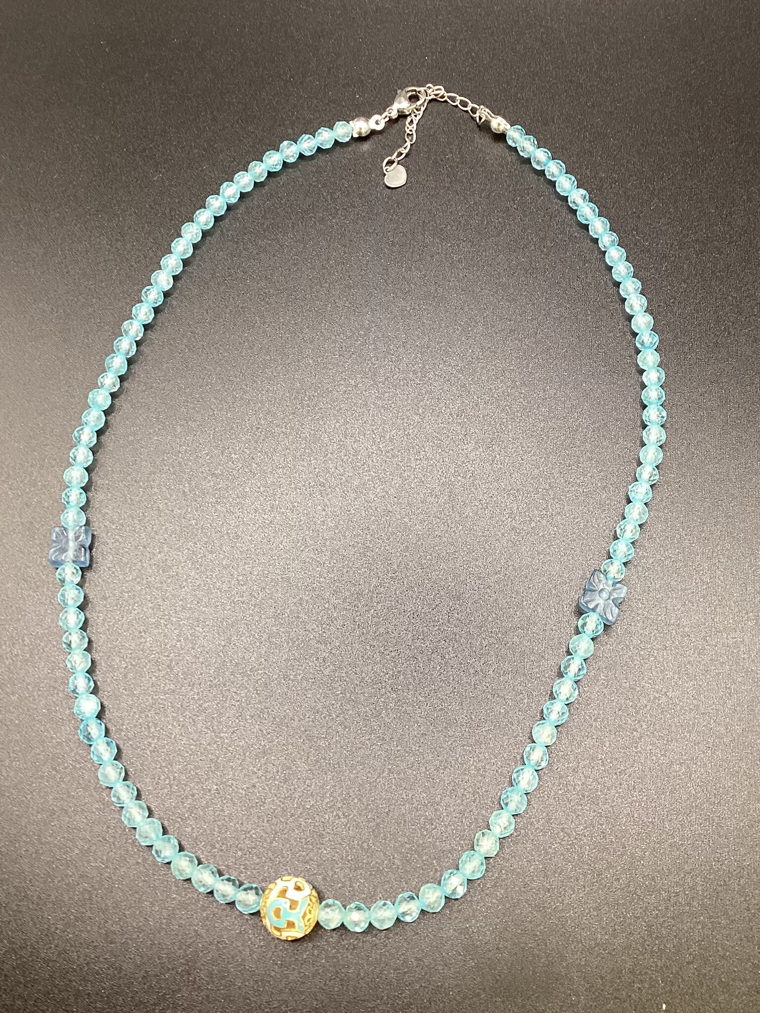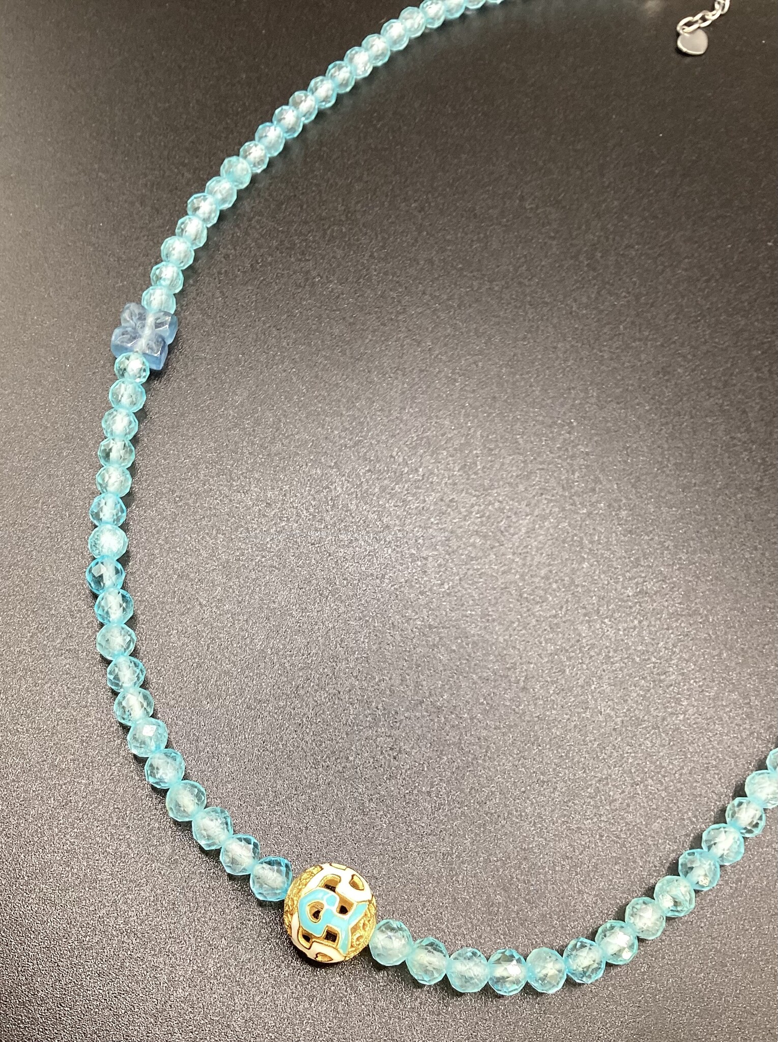 Collier en perles facettées de topaze bleue (4mm), avec en son centre une perles en argent S925 plaqué or et dessins blanc et bleu. De chaque côté un petit trèfle en aigue marine. Fermoir en acier inoxydable avec une chaîne d’extension.