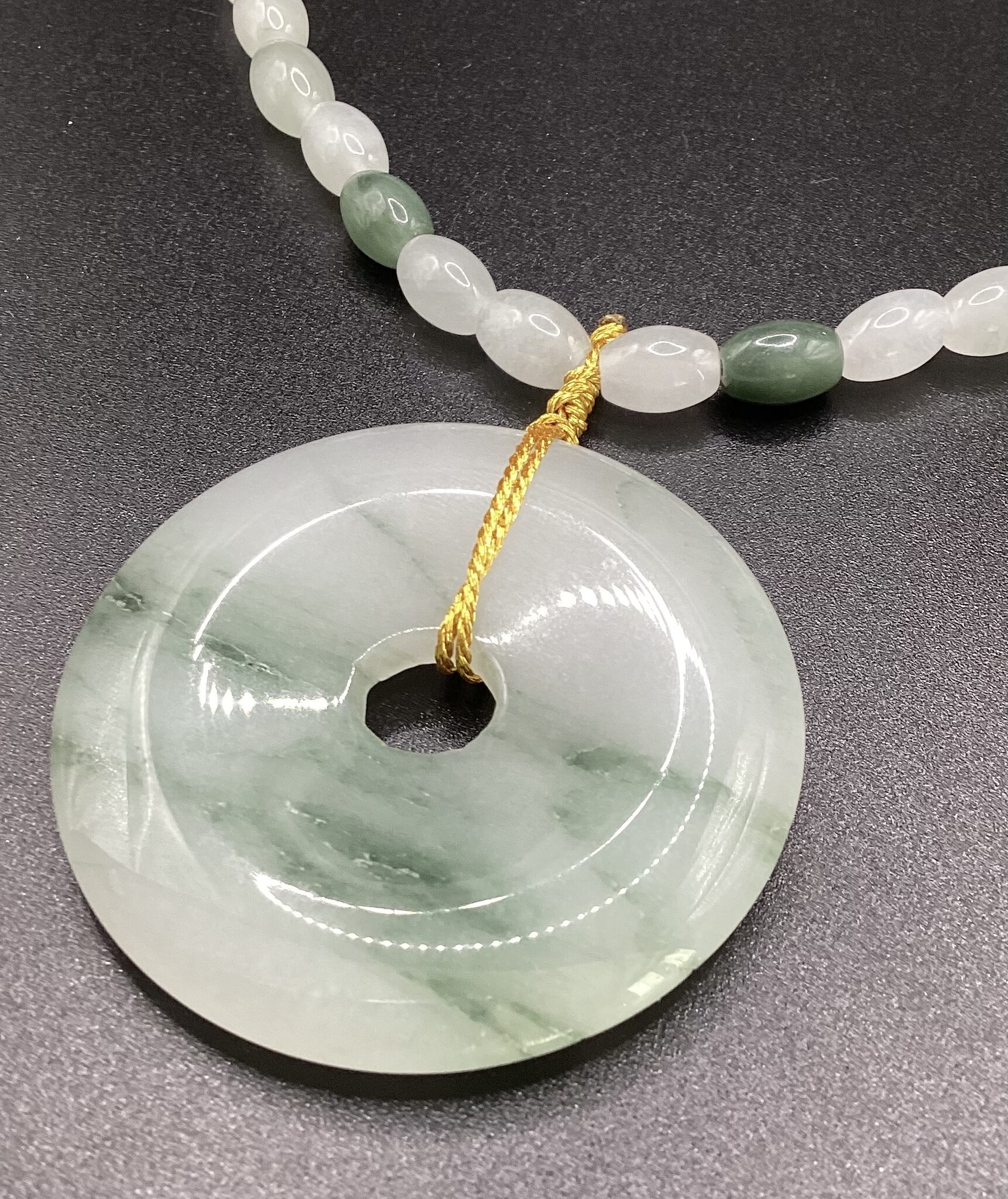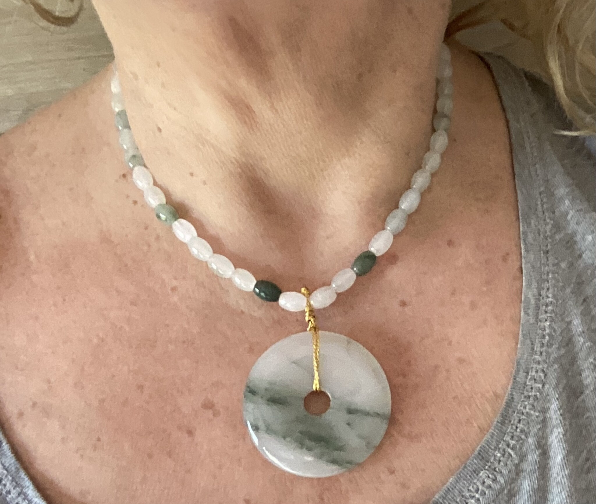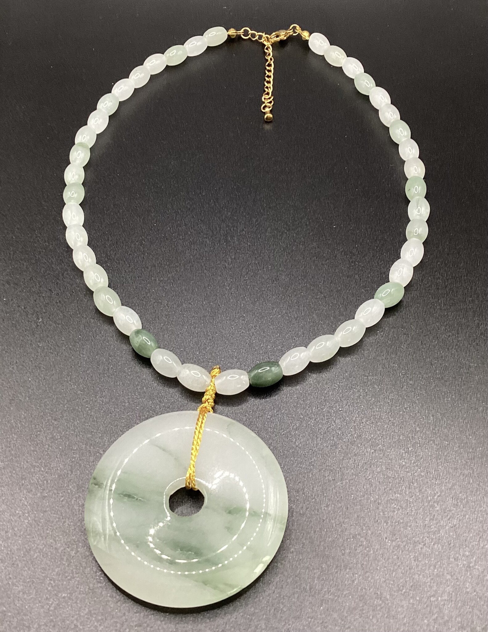 Collier en perles de jade vert nuancé et blanc avec en son centre un gros donuts de jade dans les mêmes tons (4,6 cm). Fermoir en acier inoxydable et chaîne d’extension.