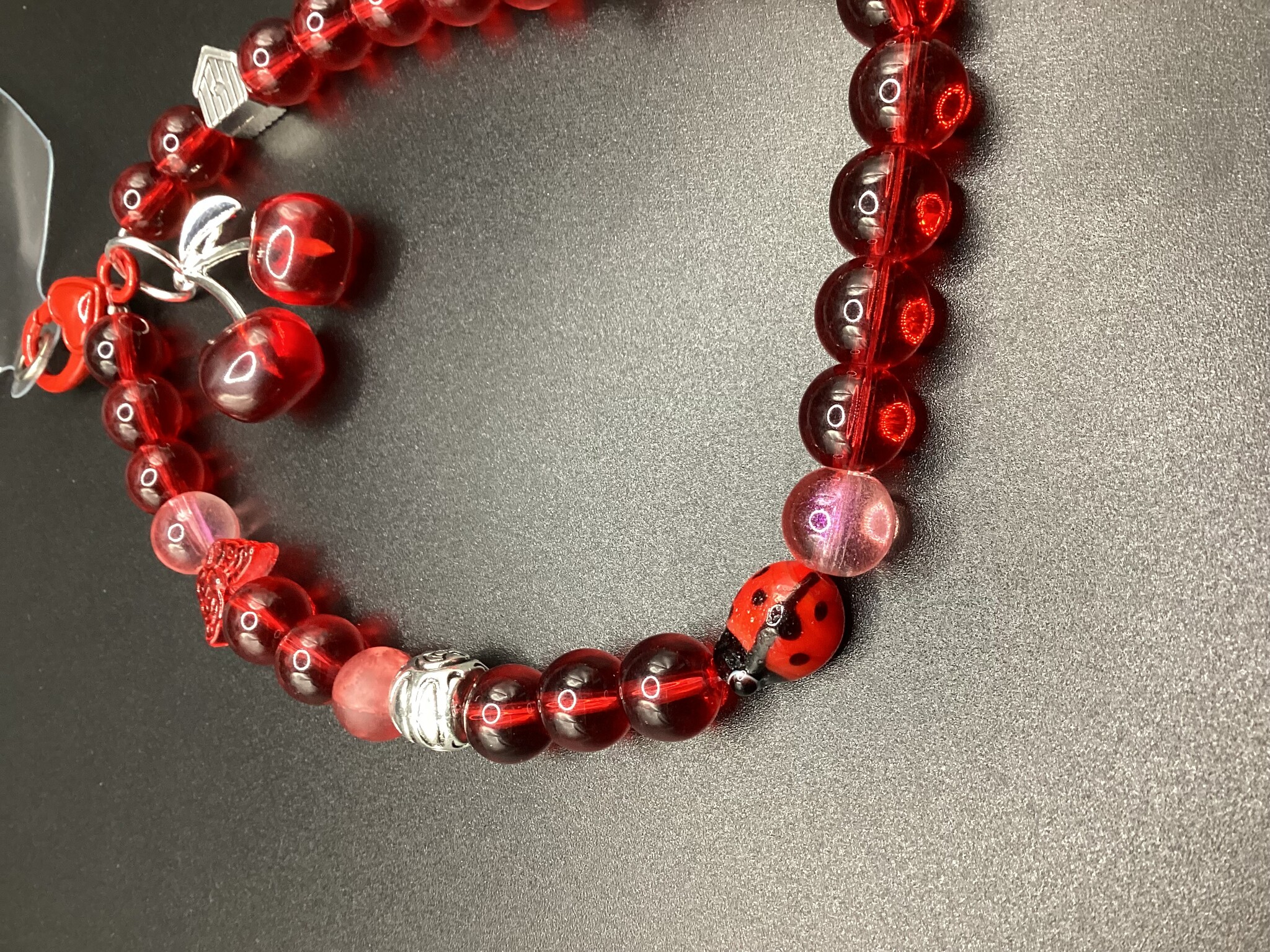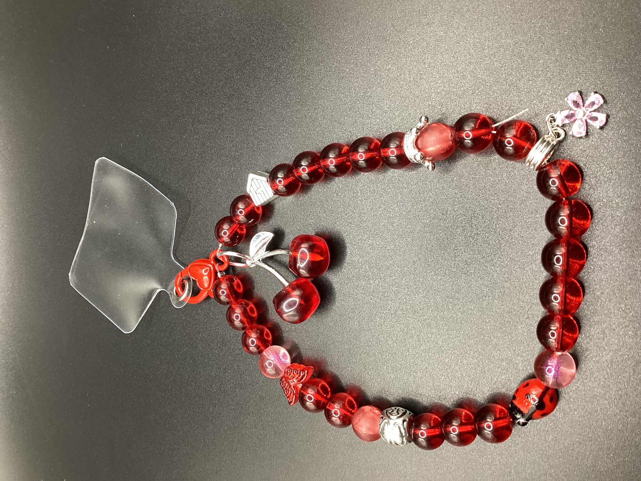 Bijou de portable aux notes fruitées !!;perles de verre 10 mm, et petits charms en alliage. La anguette silicone est à glisser sous votre coque de portable.