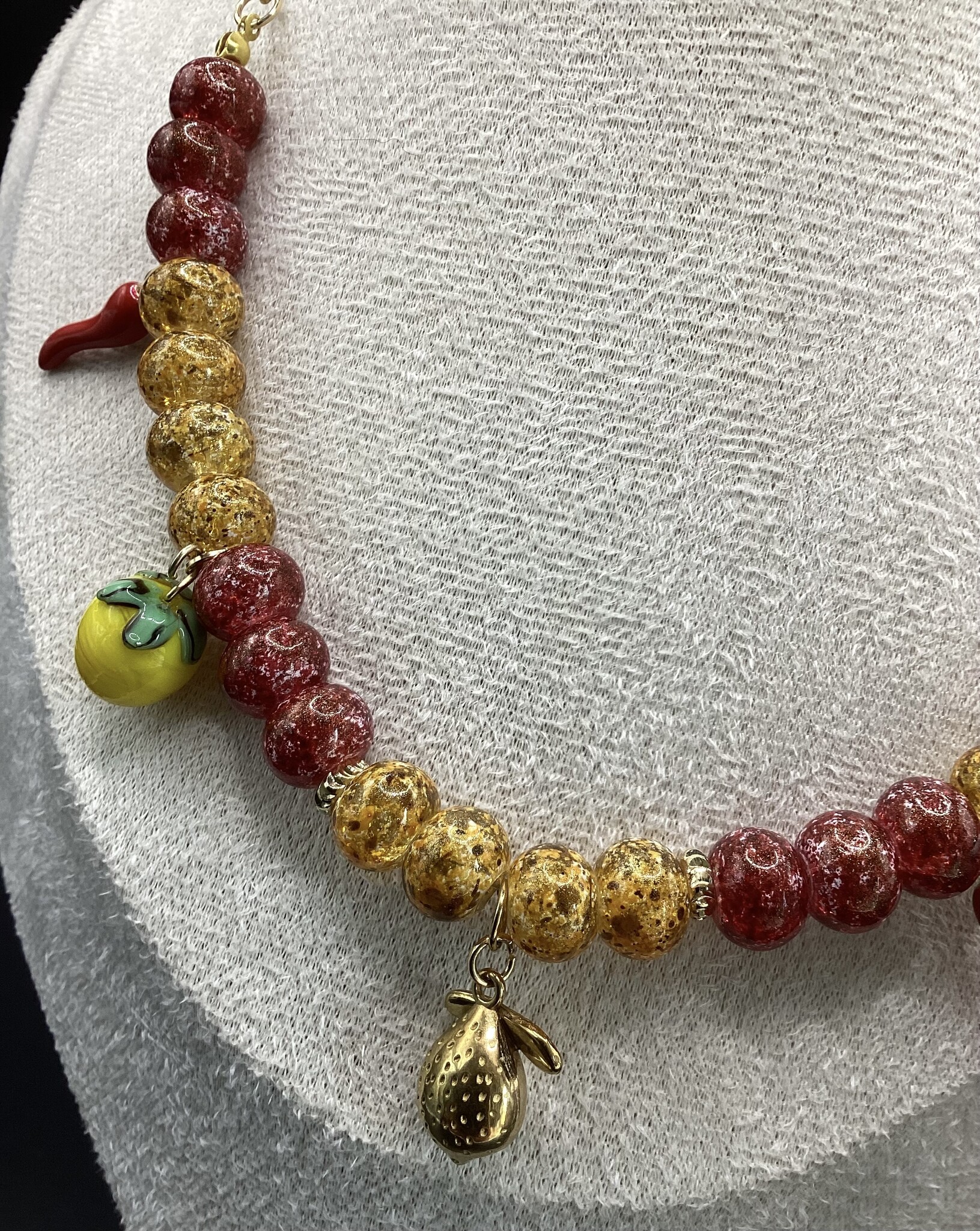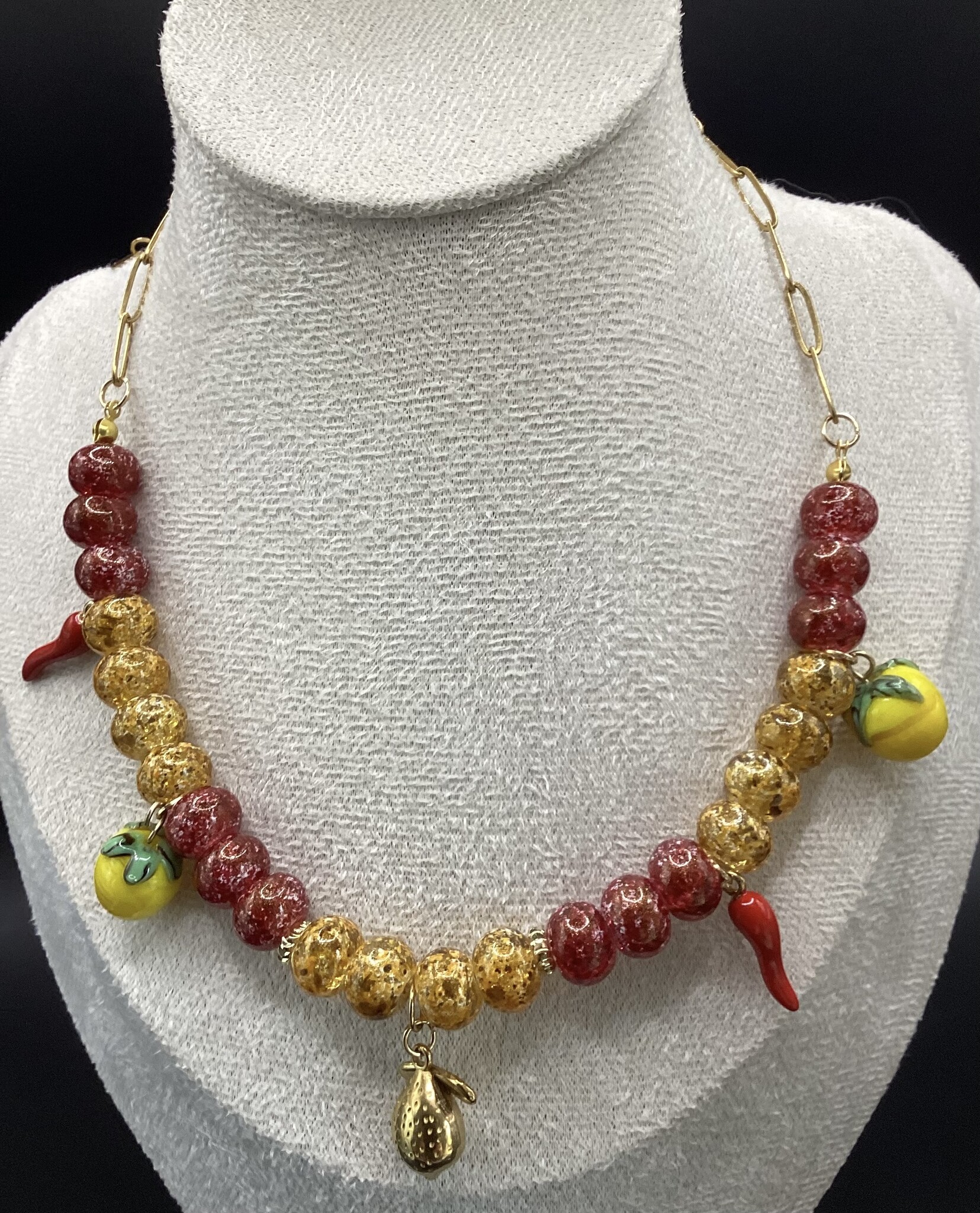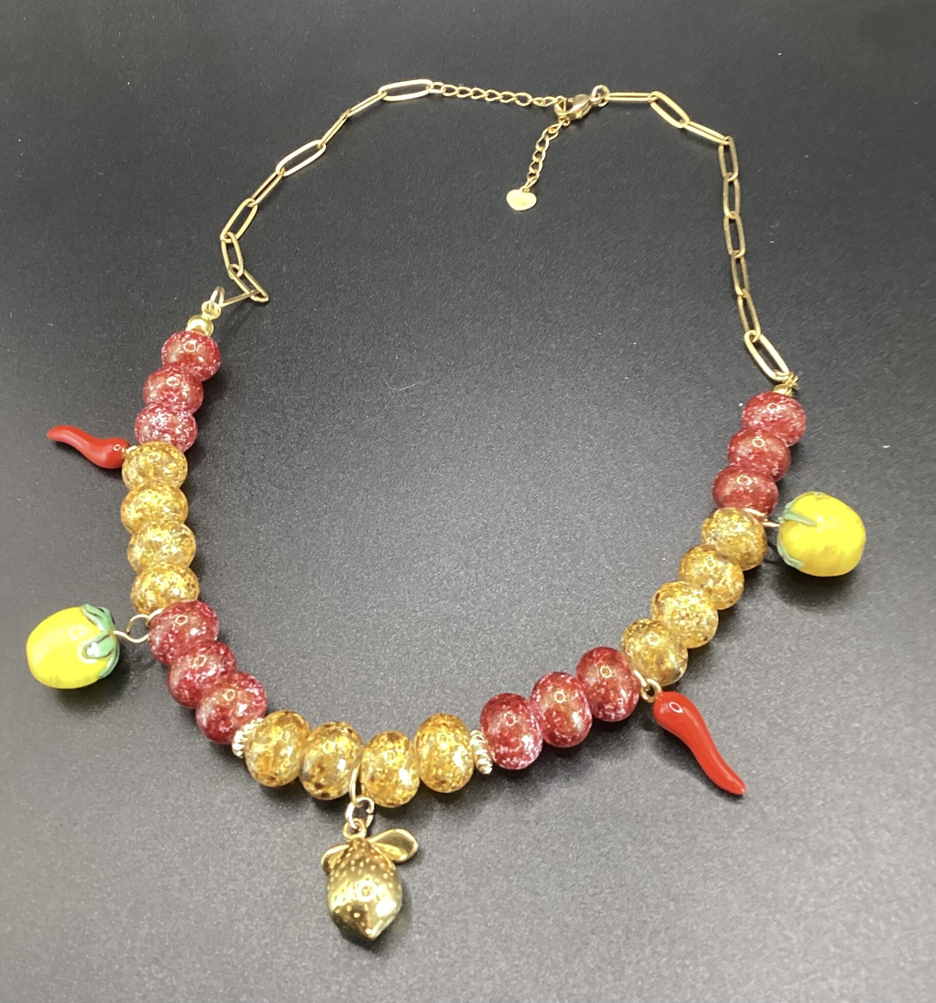 Collier en perles de verre mouchetées rouge et jaune, (très) original !! Les petits citrons (verre) pour le sud est et les petits piments (acier inoxydable) pour le sud ouest !! Un petit citron est en argent plaqué or. La chaîne et le fermoir sont en acier inoxydable. Osez !!!