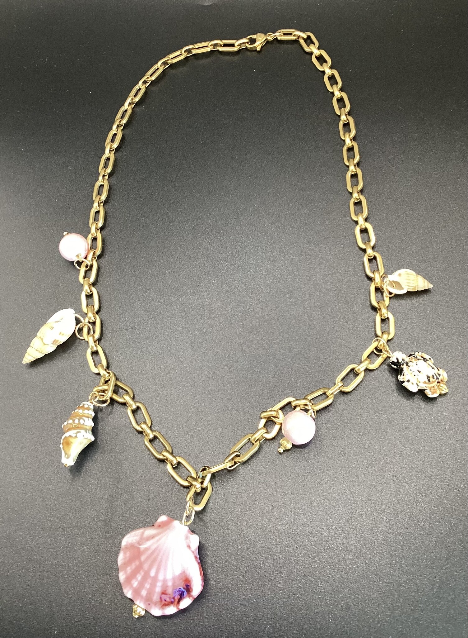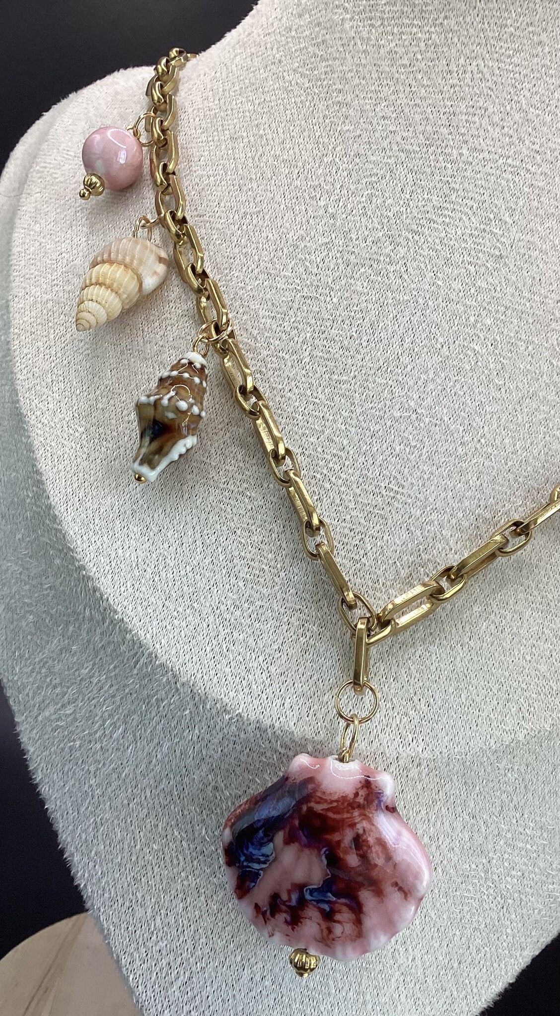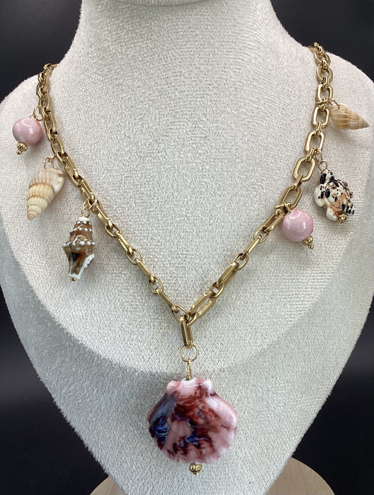 Joli collier en chaîne acier inoxydable et breloques en céramique et coquillages. Vive l’été ! Fermoir en acier inoxydable.