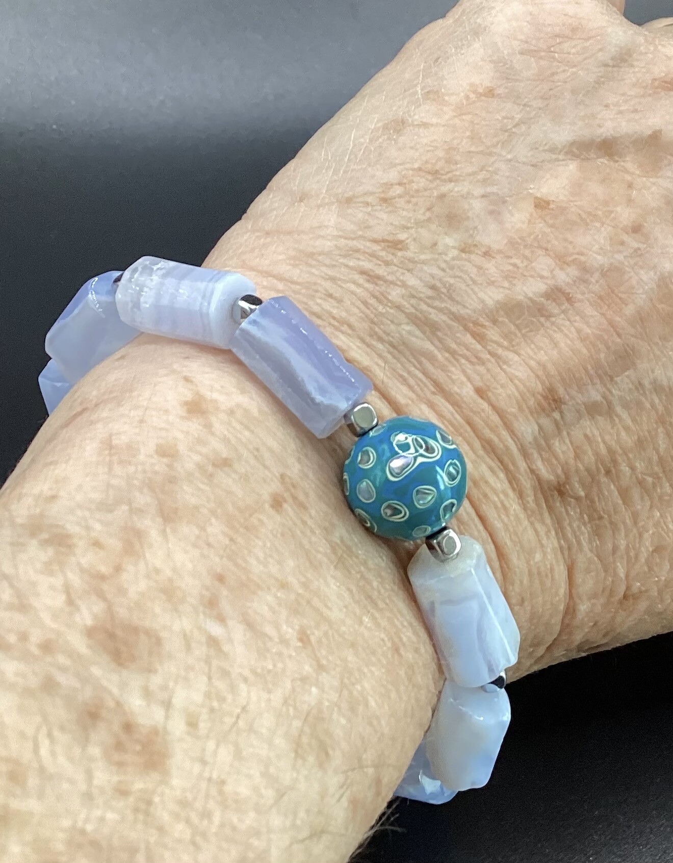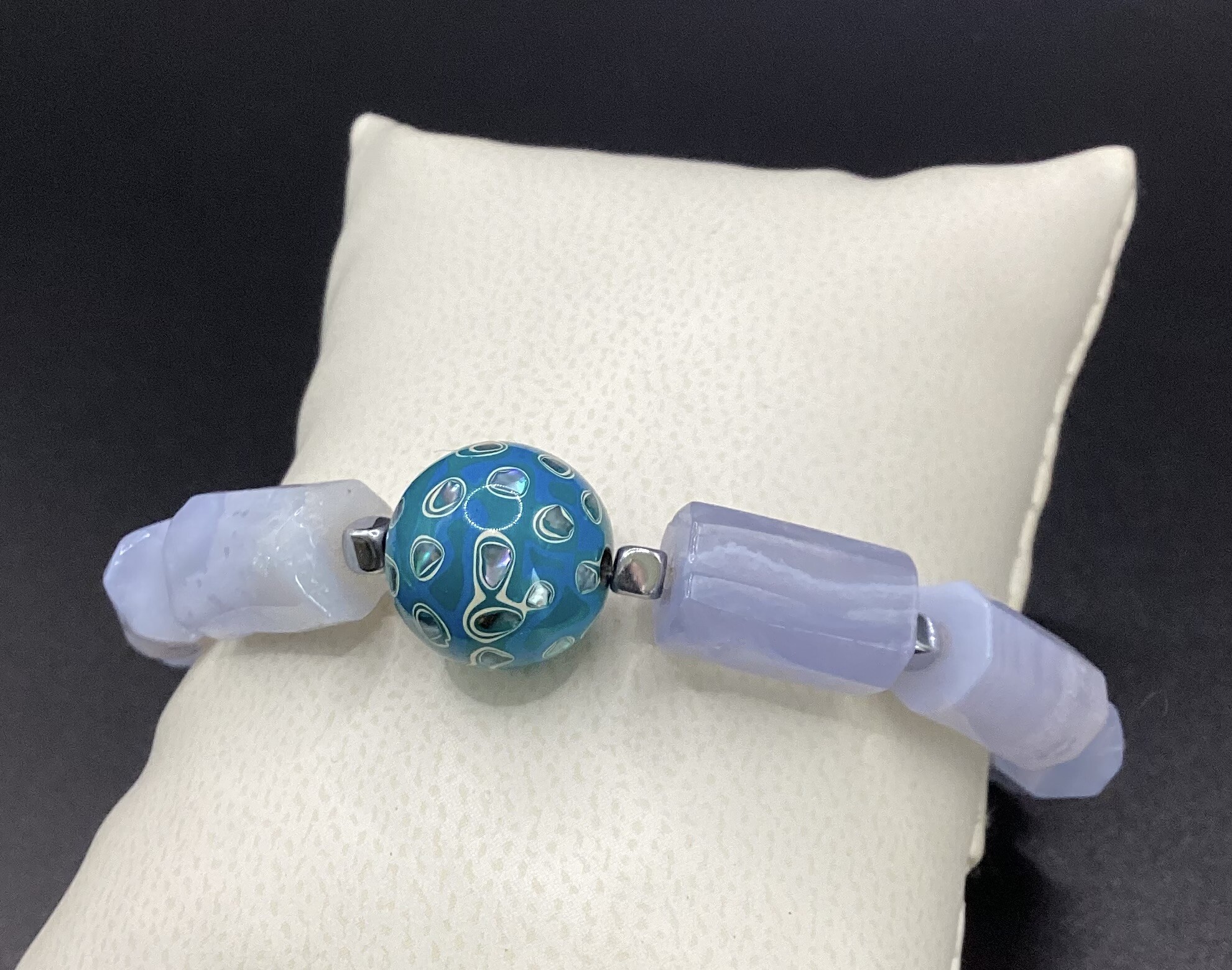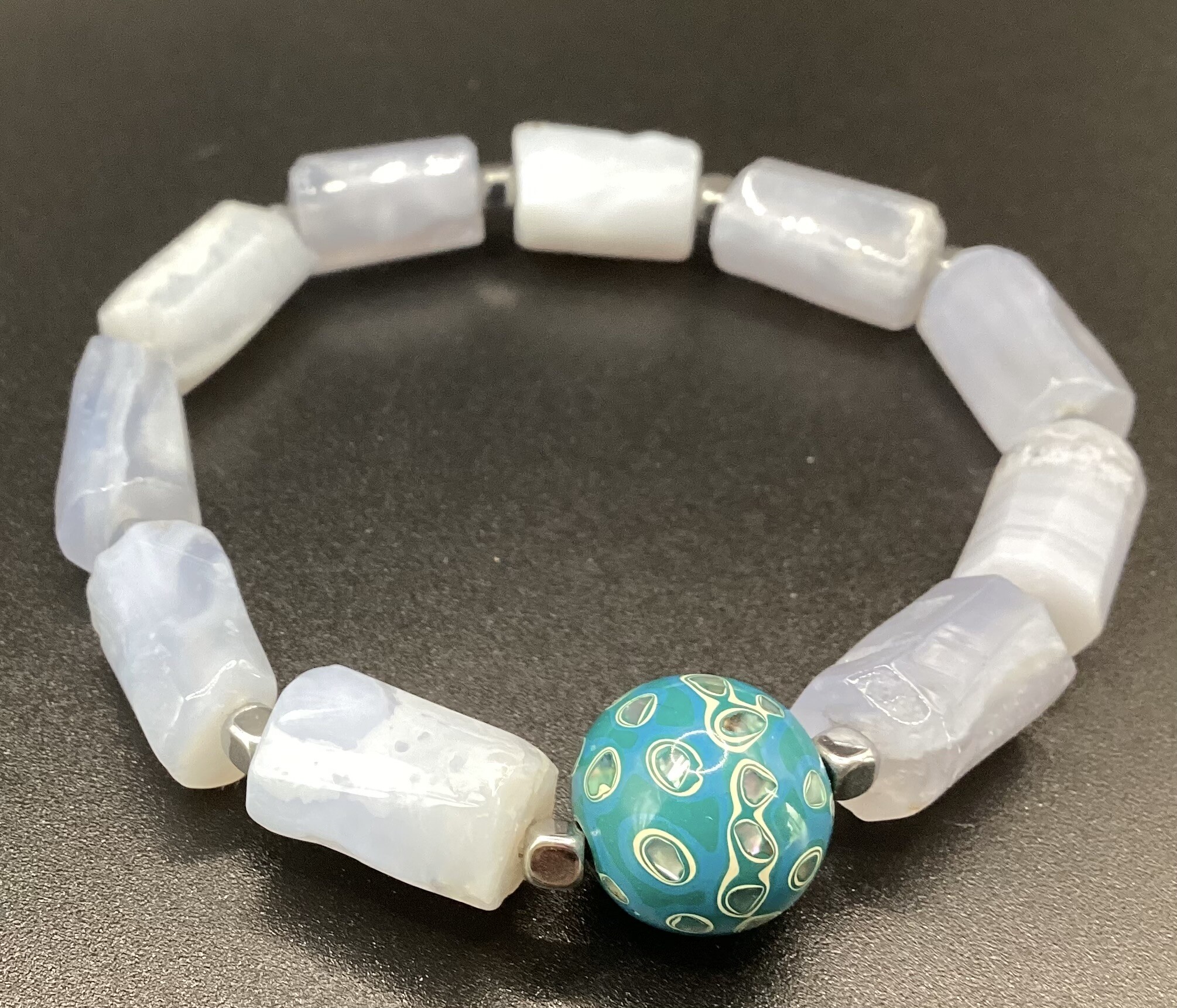 Bracelet agate blue lace (calcite bleue) et perle laquée