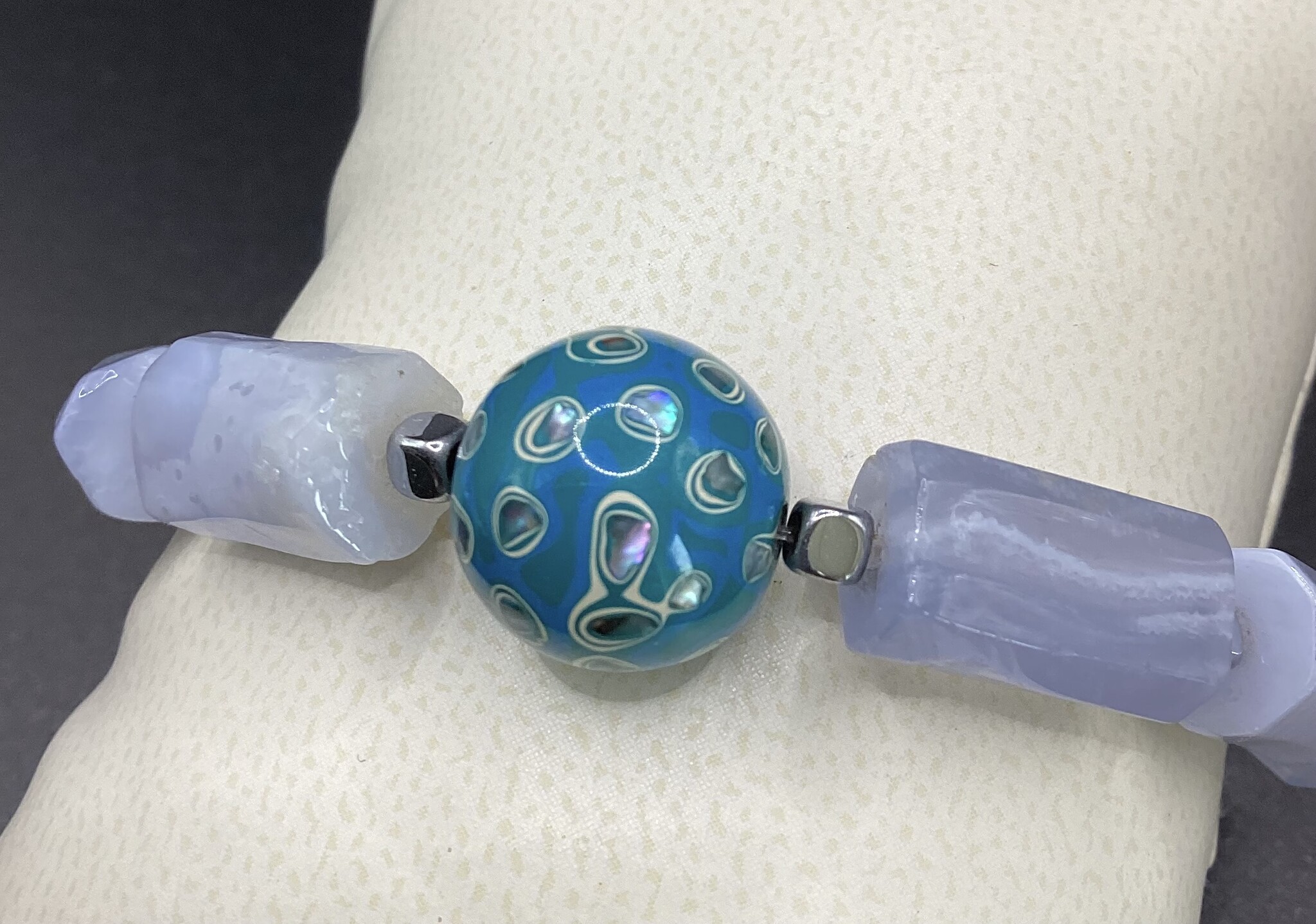 Bracelet tout bleu !! En perles d’agate blue lace (calcite bleue) en forme de tubes, intercalées de petites perles carré en hématite. En sont centre la jolie perle traditionnelle chinoise laquée en incrustée d’éclats d’ormeau.