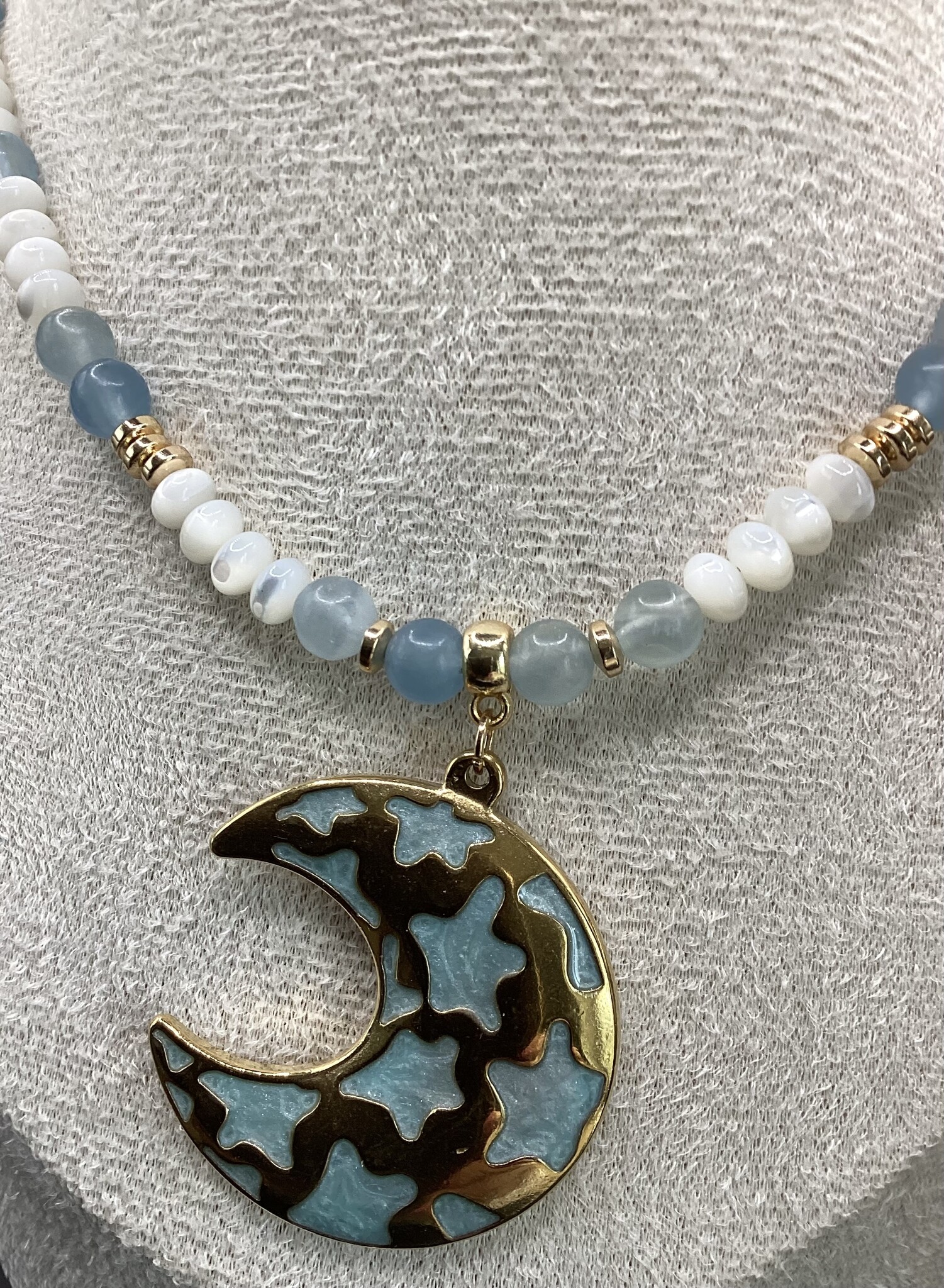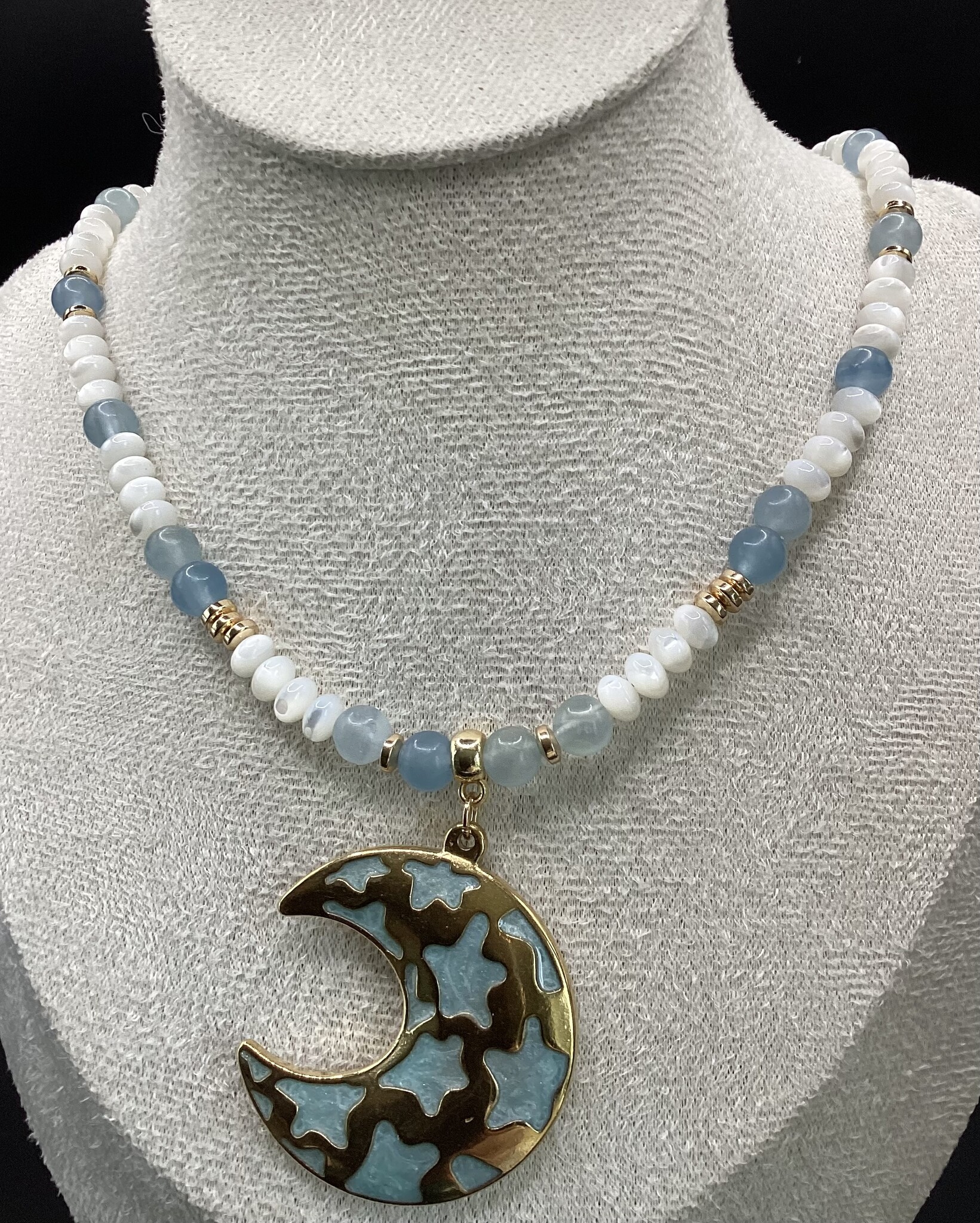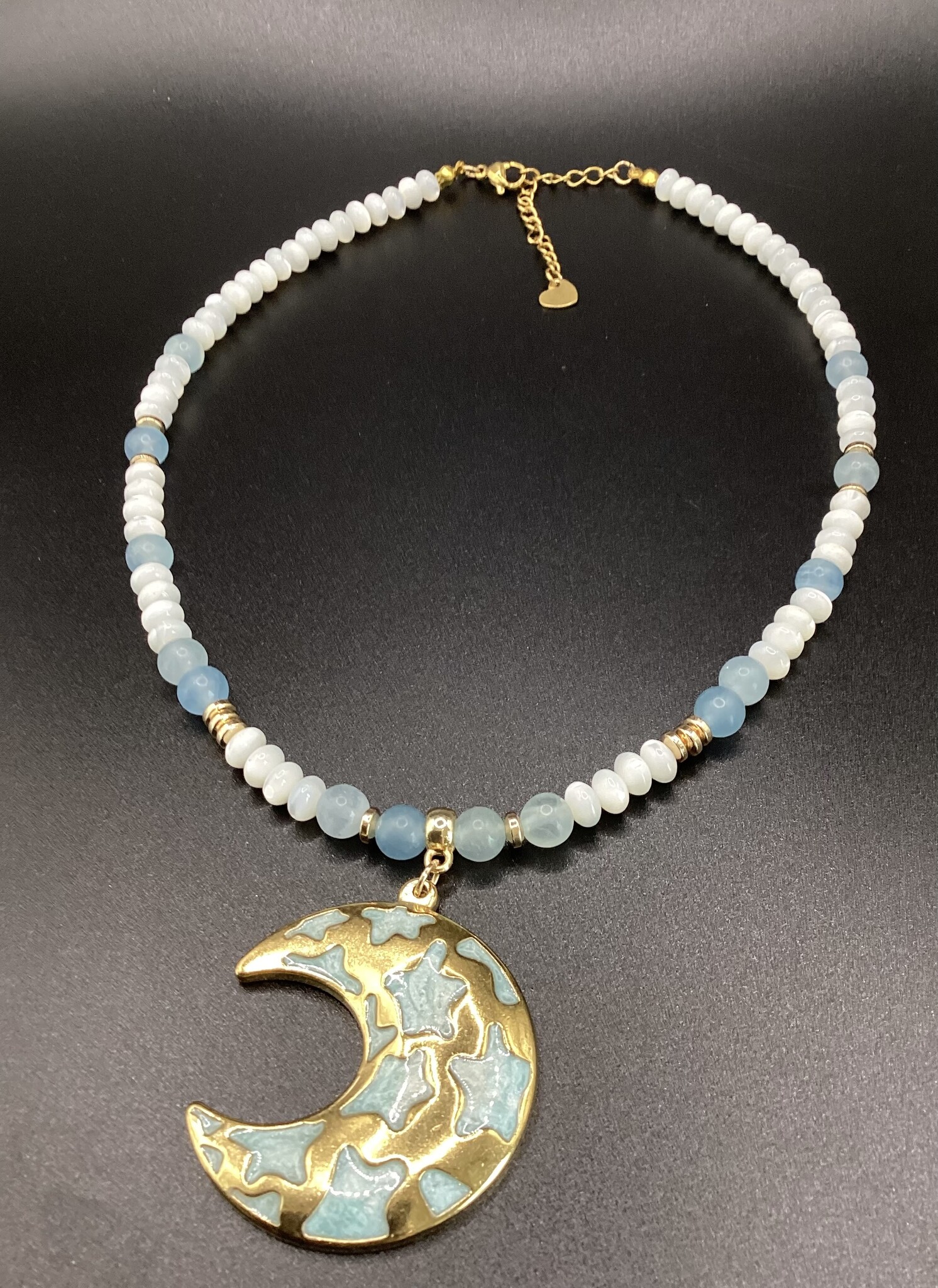 Collier en perles de nacre et calcite bleue de 6 mm. Petits détails en perles d’hématite. La jolie lune est en acier inoxydable, ainsi que le fermoir avec chaîne