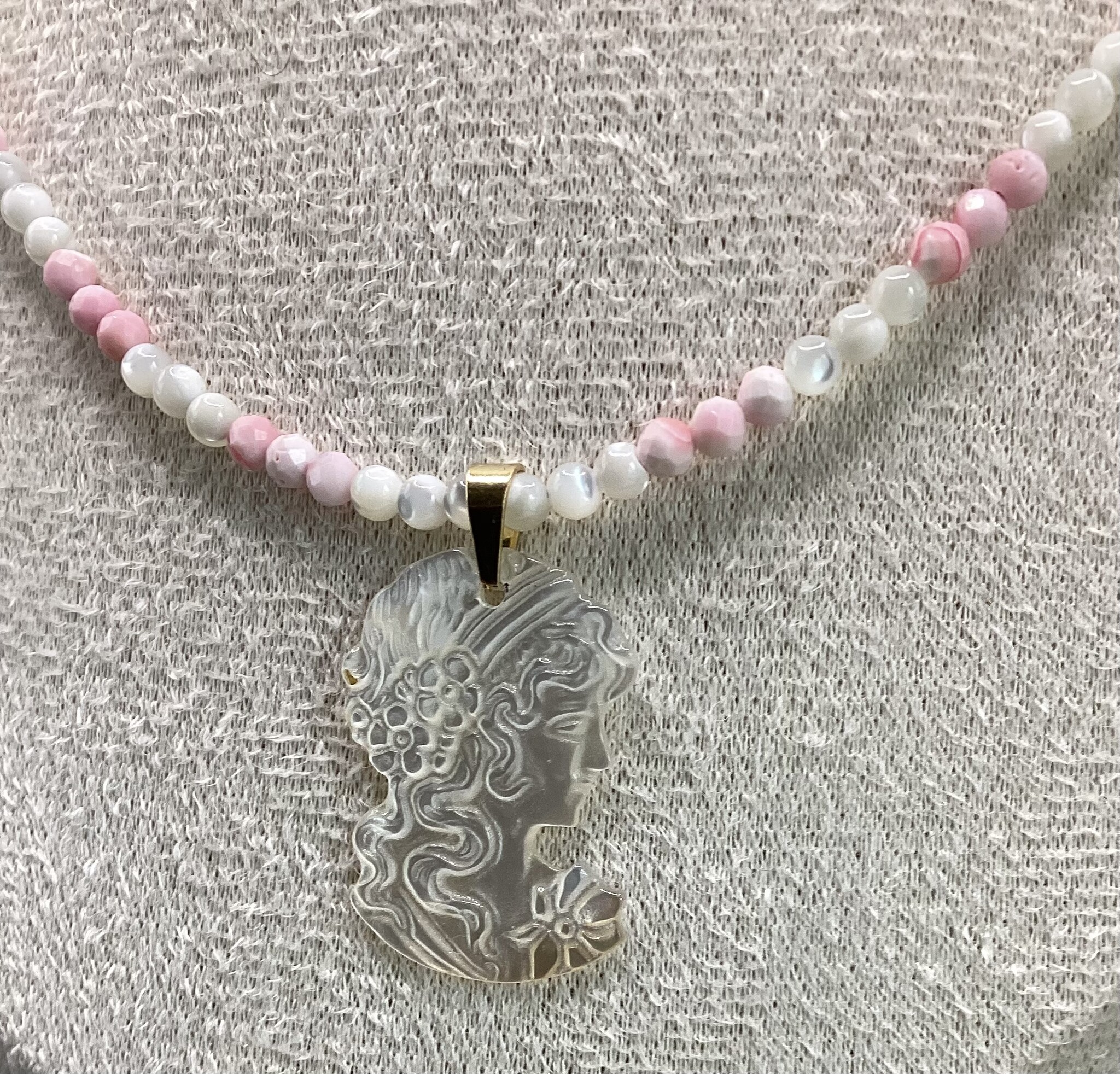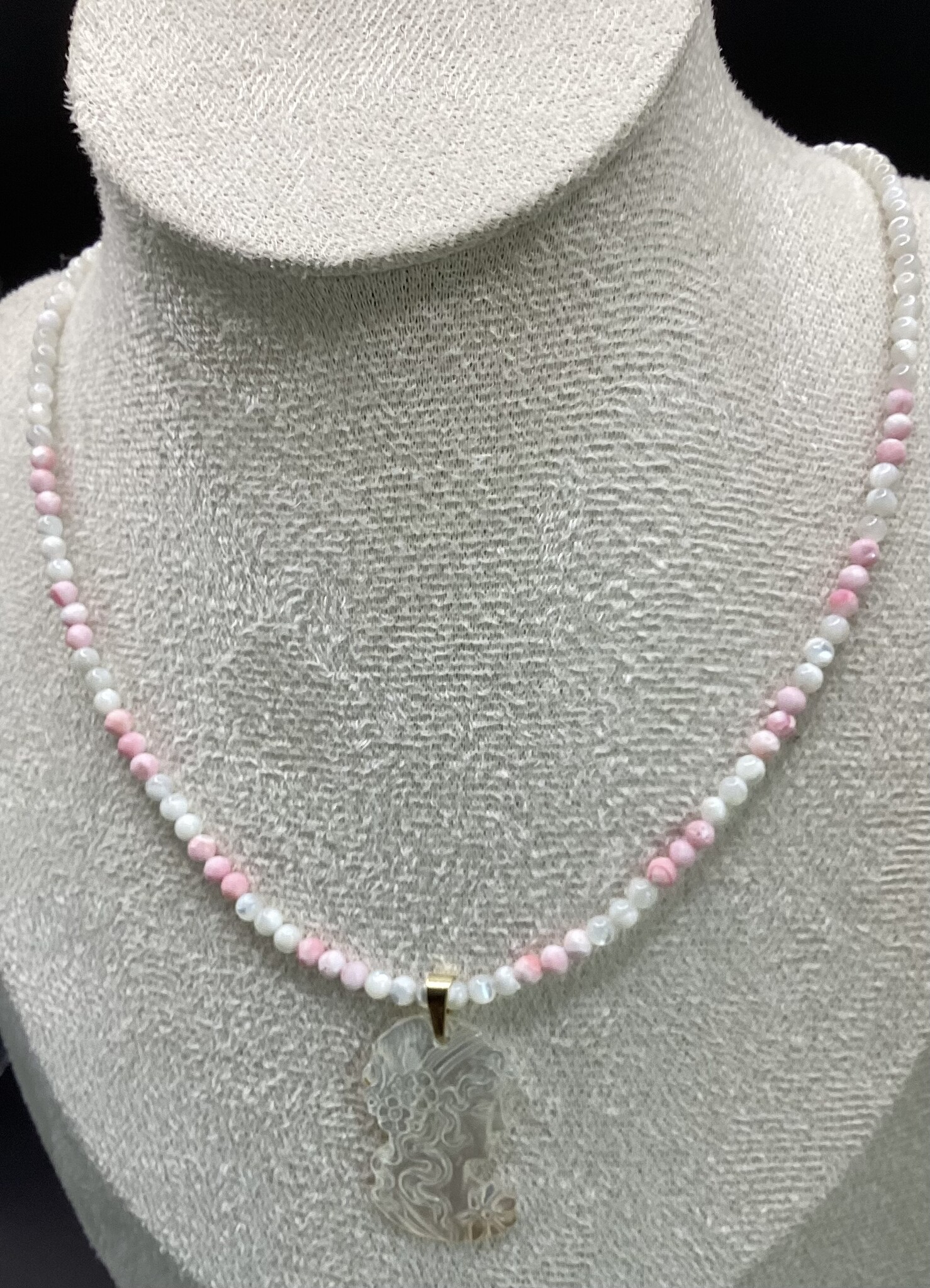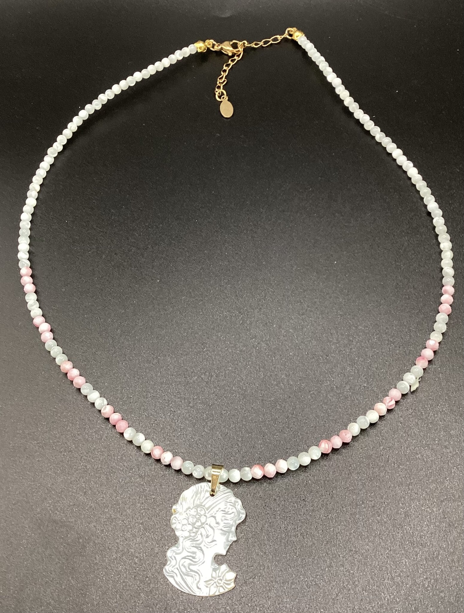 Collier en petites perles de nacre 3 mm, nacre blanche et nacre rose (conque). En son centre un joli camais de nacre.. tout à fait romantique !