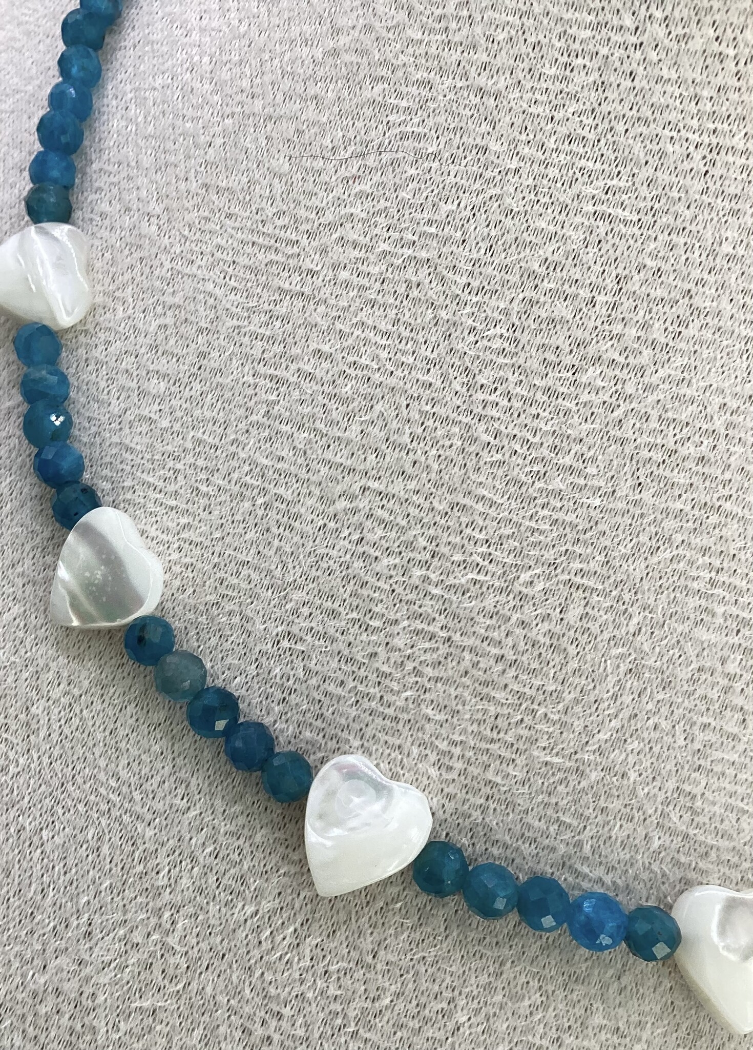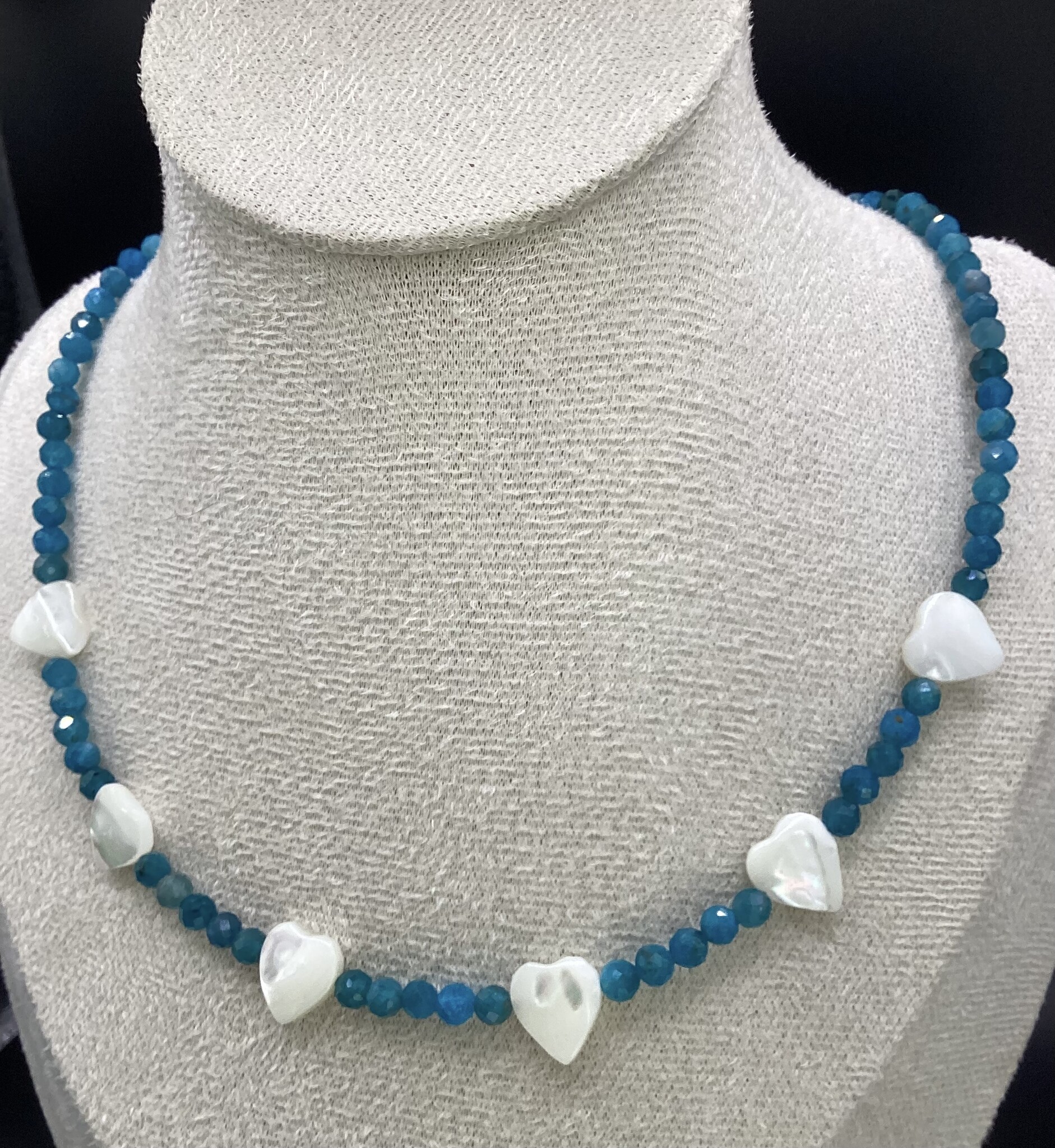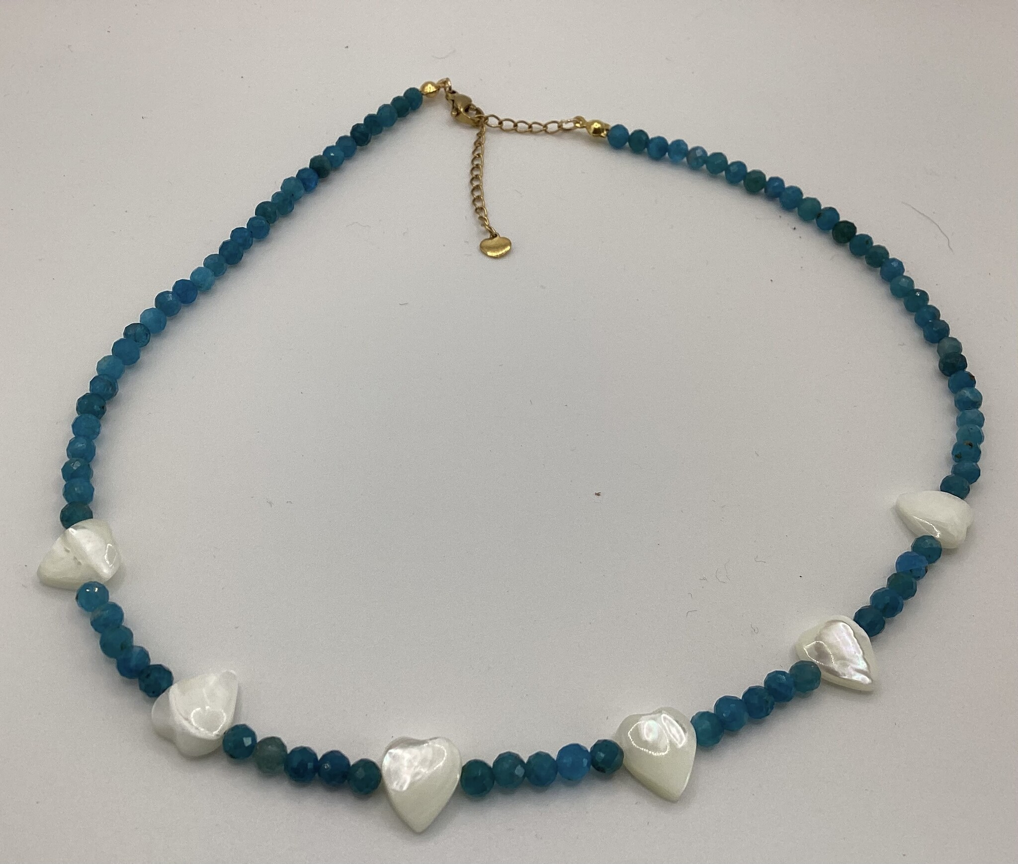 Collier en perles d’apatite facettées et petits cœur de nacre. Jolis reflets ATC en ciel de la nacre et profondeur de l’apatite. Le fermoir est en acier inoxydable avec chaîne d’extension.