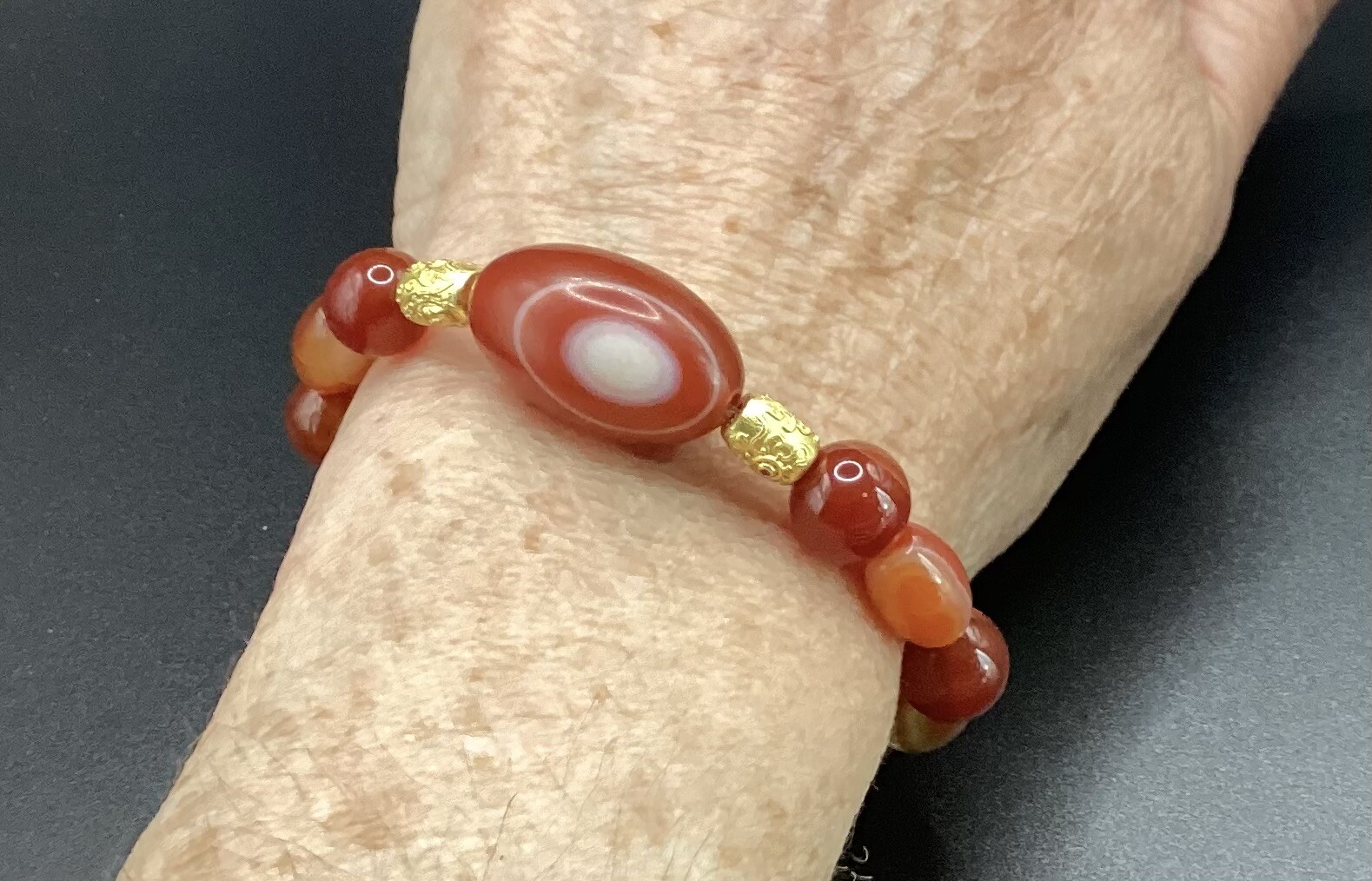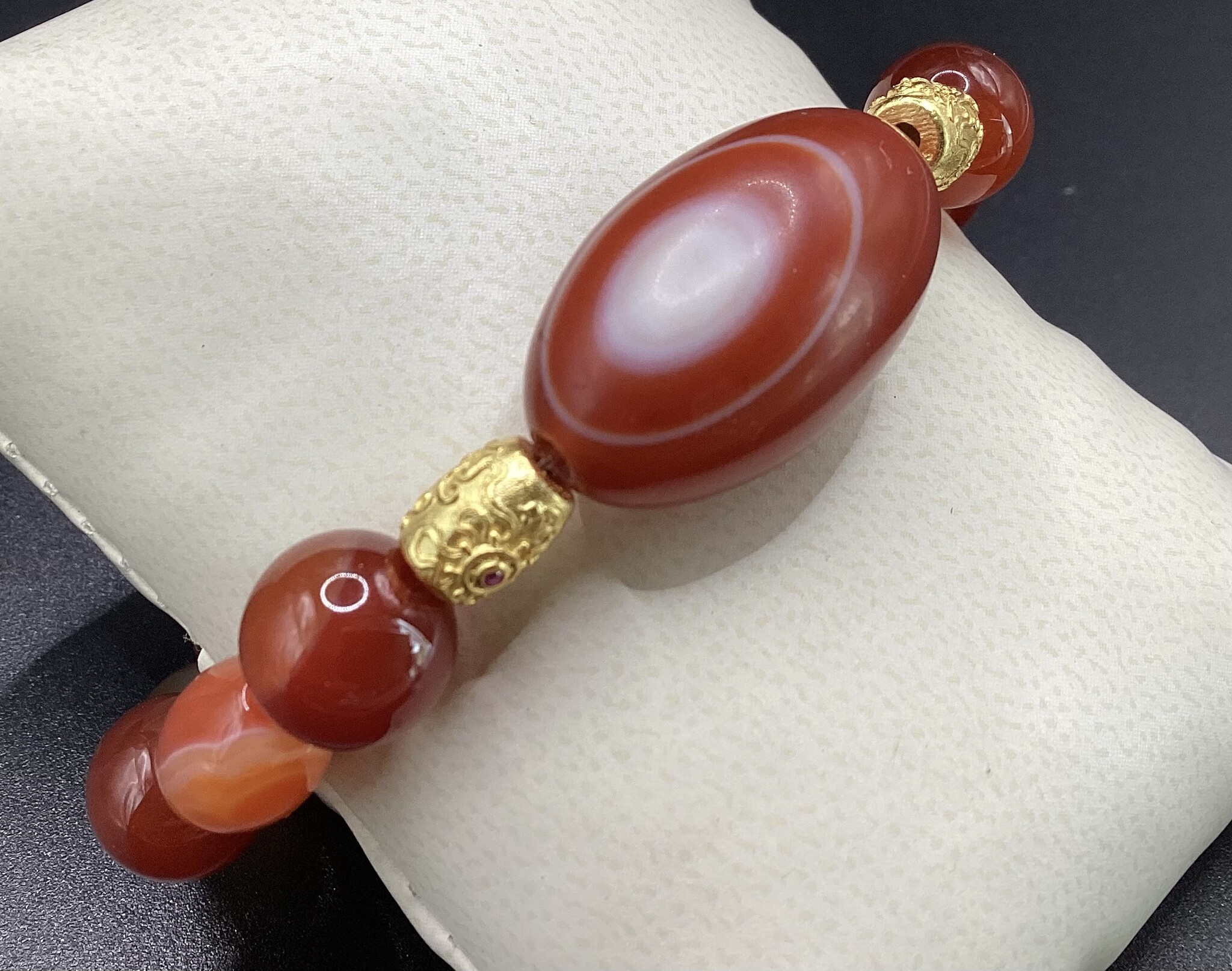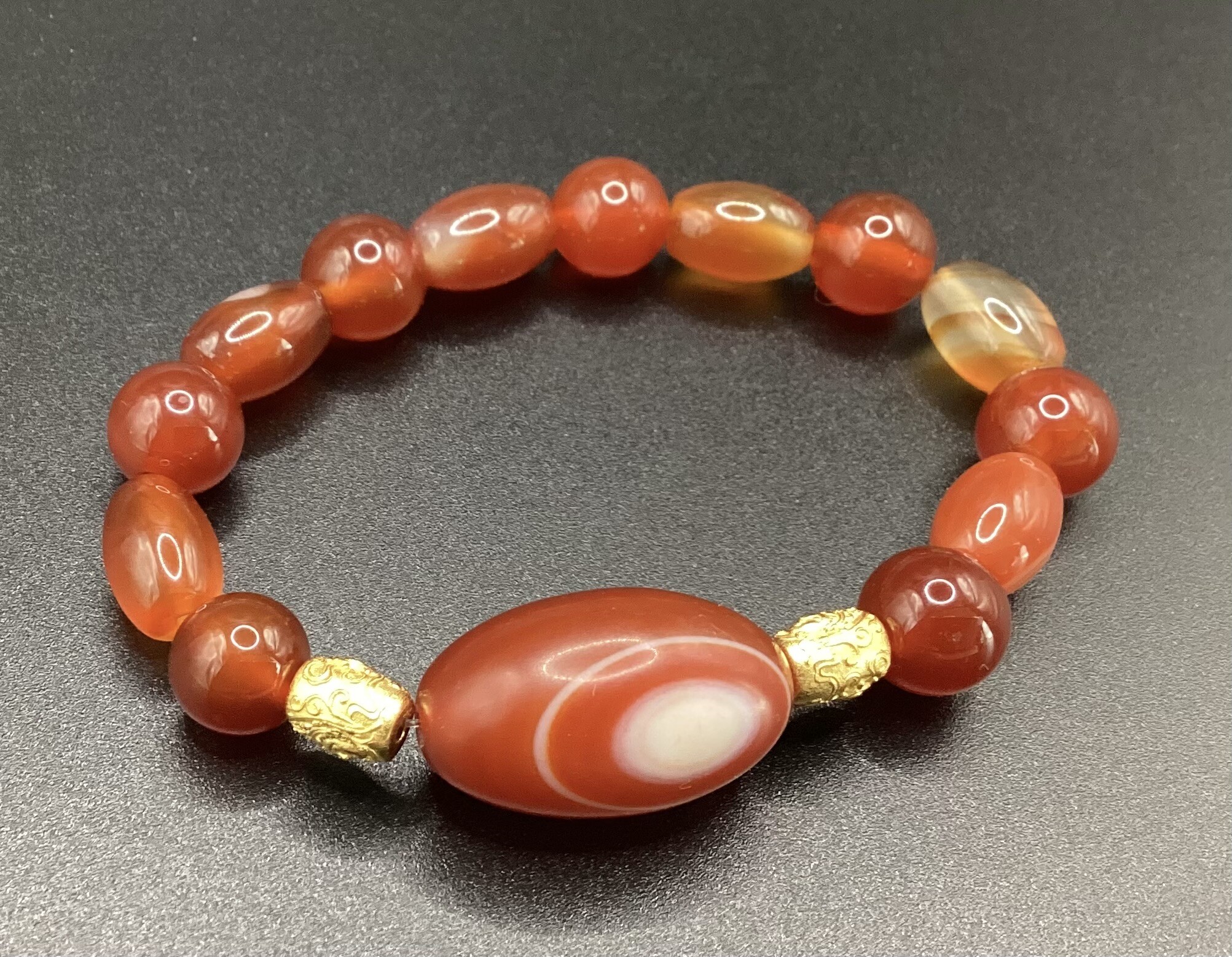 Bracelet en perles de cornaline ronde de 10 mm et ovale 8 mm. En son centre une superbe perle en « tonneau » d’agate orbiculaire, entourée de deux perles gravées en argent plaqué or. Très raffiné et rare..