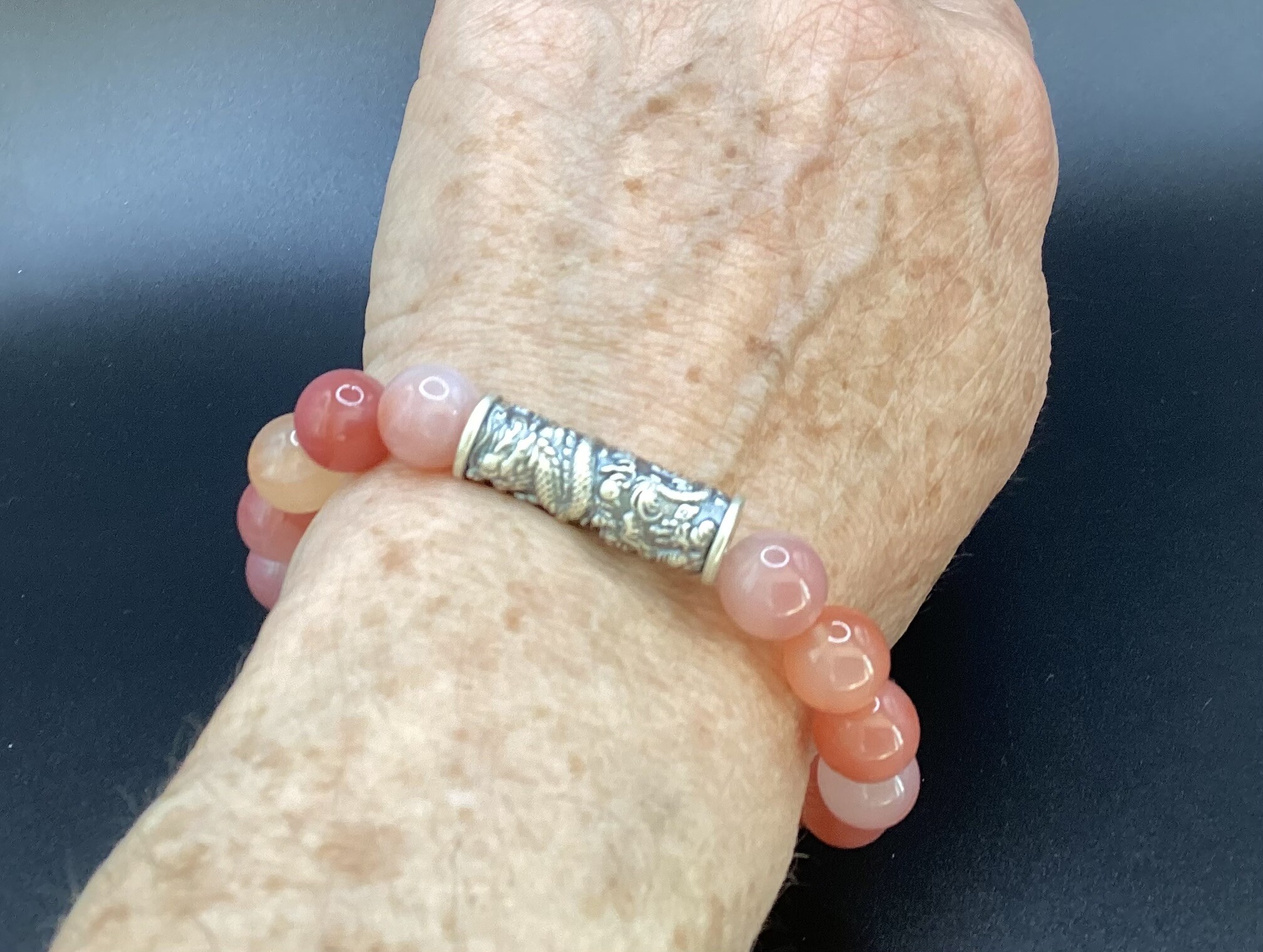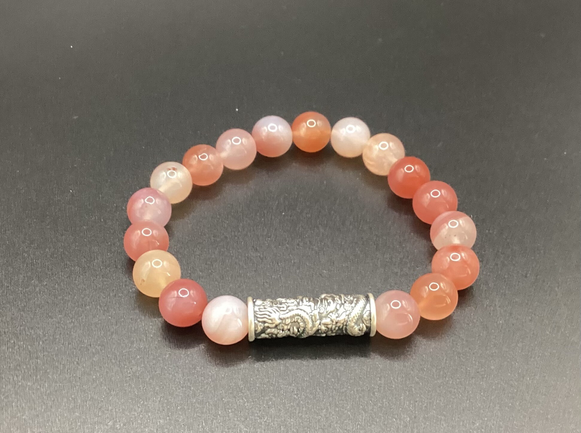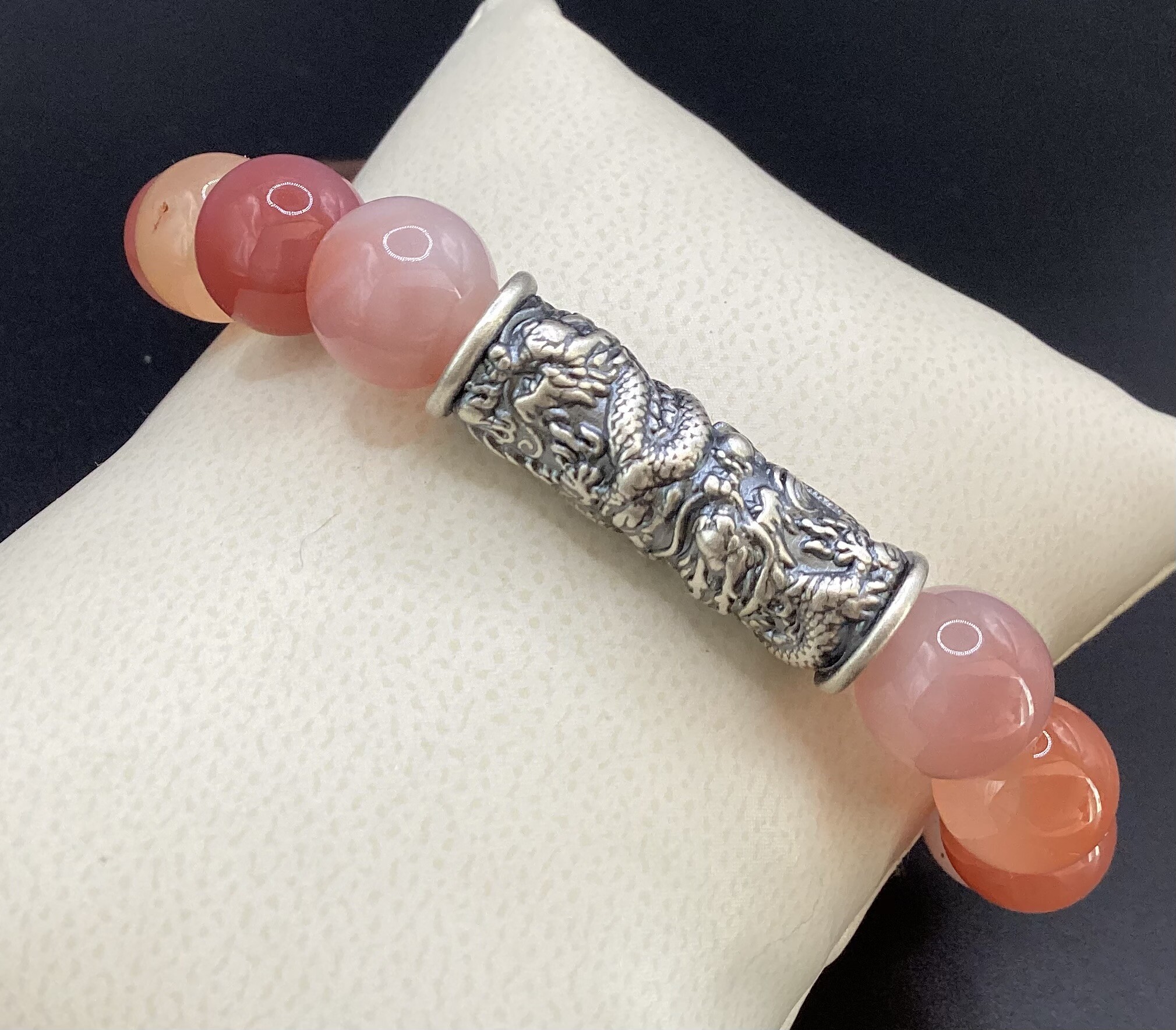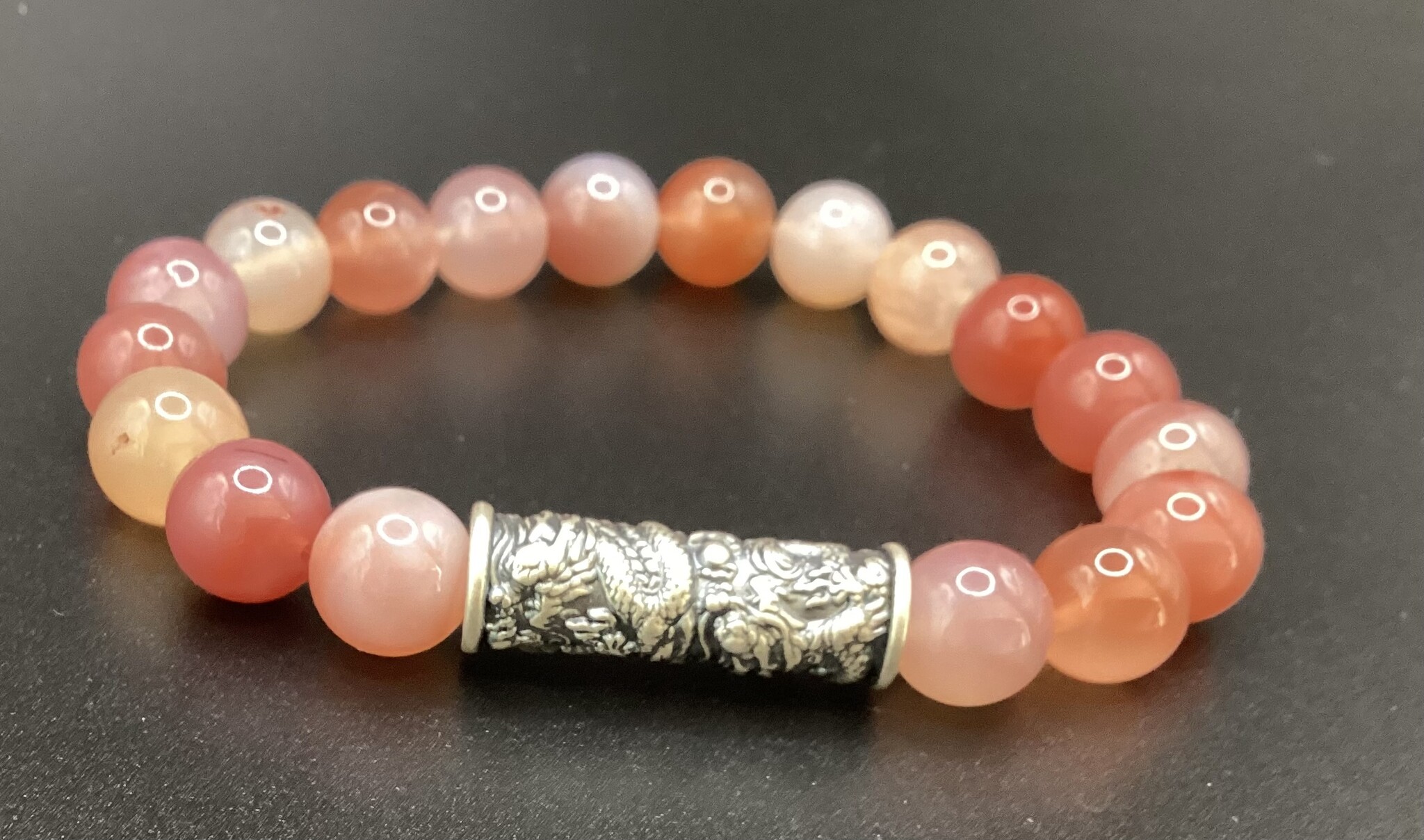 Bracelet en perles d’agate sel source, ou agate Yan yuan (10 mm) de très belle qualité. En son centre un joli tube d’argent S925, gravé du dragon porte bonheur en Asie.