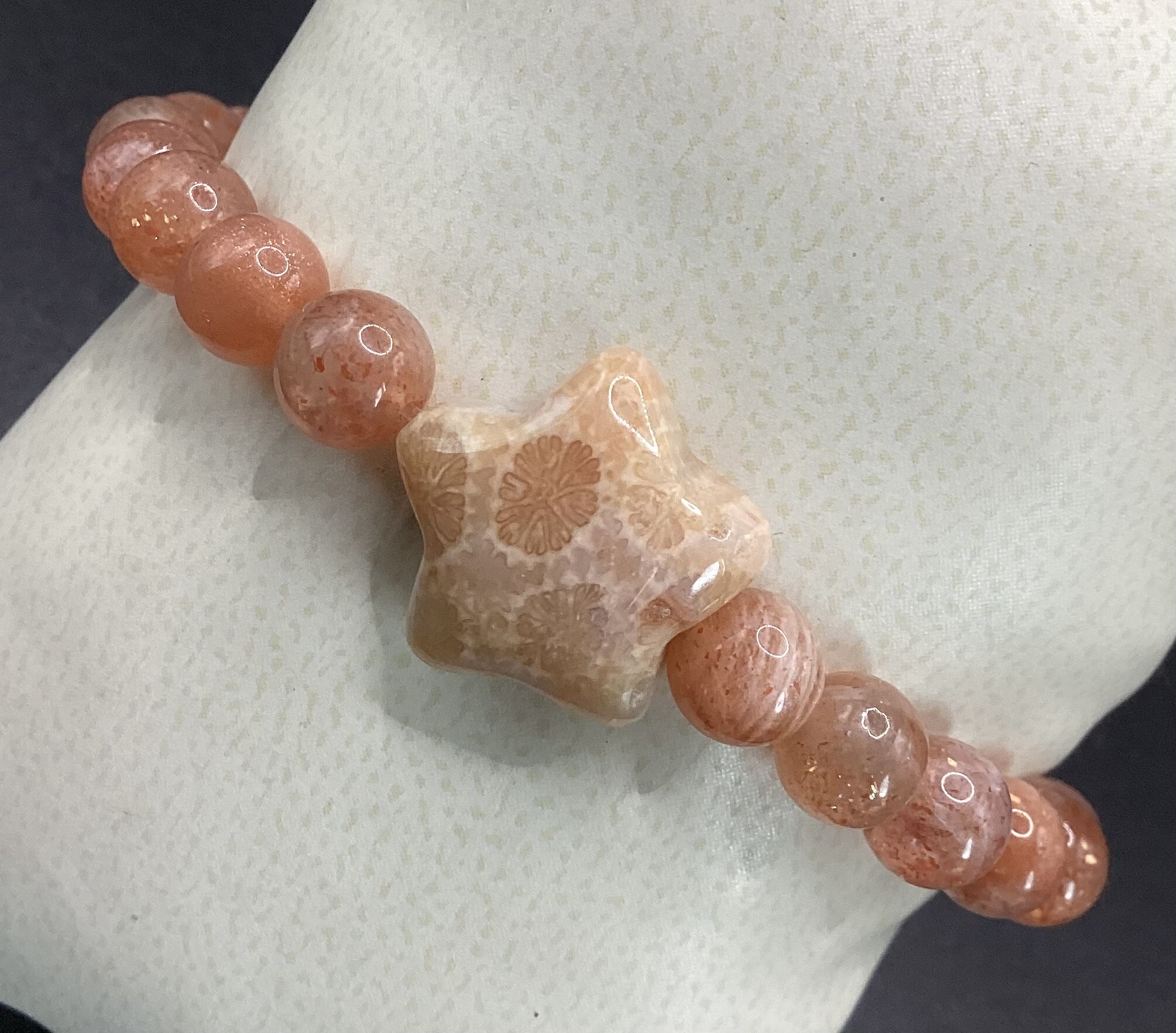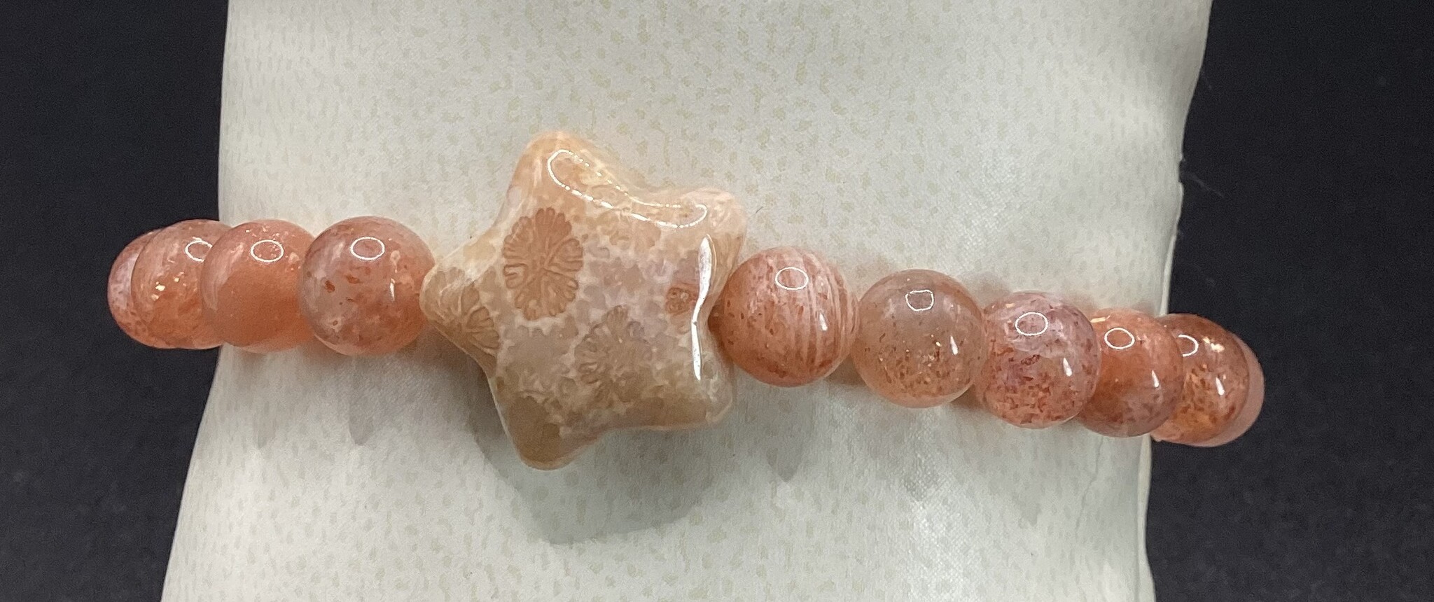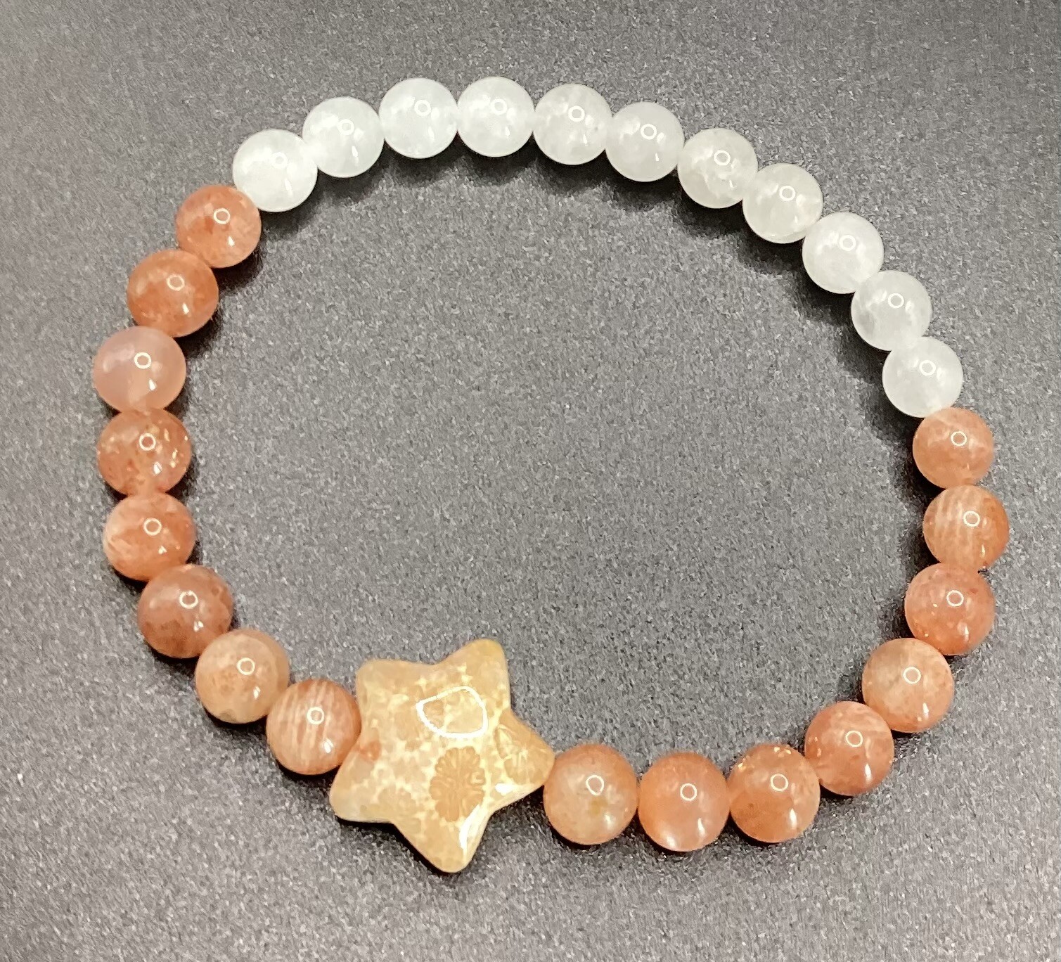 Bracelet en perles de pierre de soleil et jade blanc de 6 mm. En son centre une jolie étoile en jaspe corail fossile. Très belle qualité.