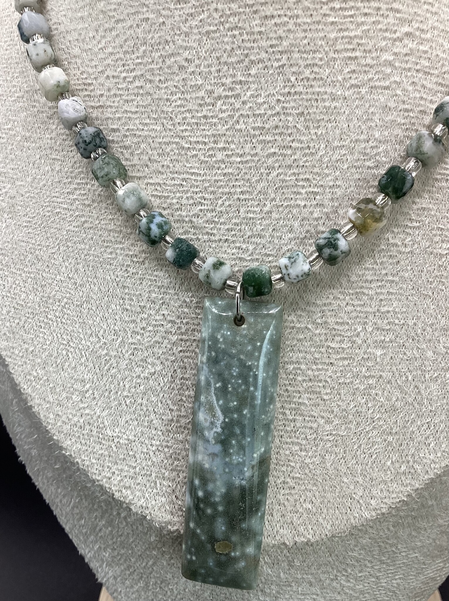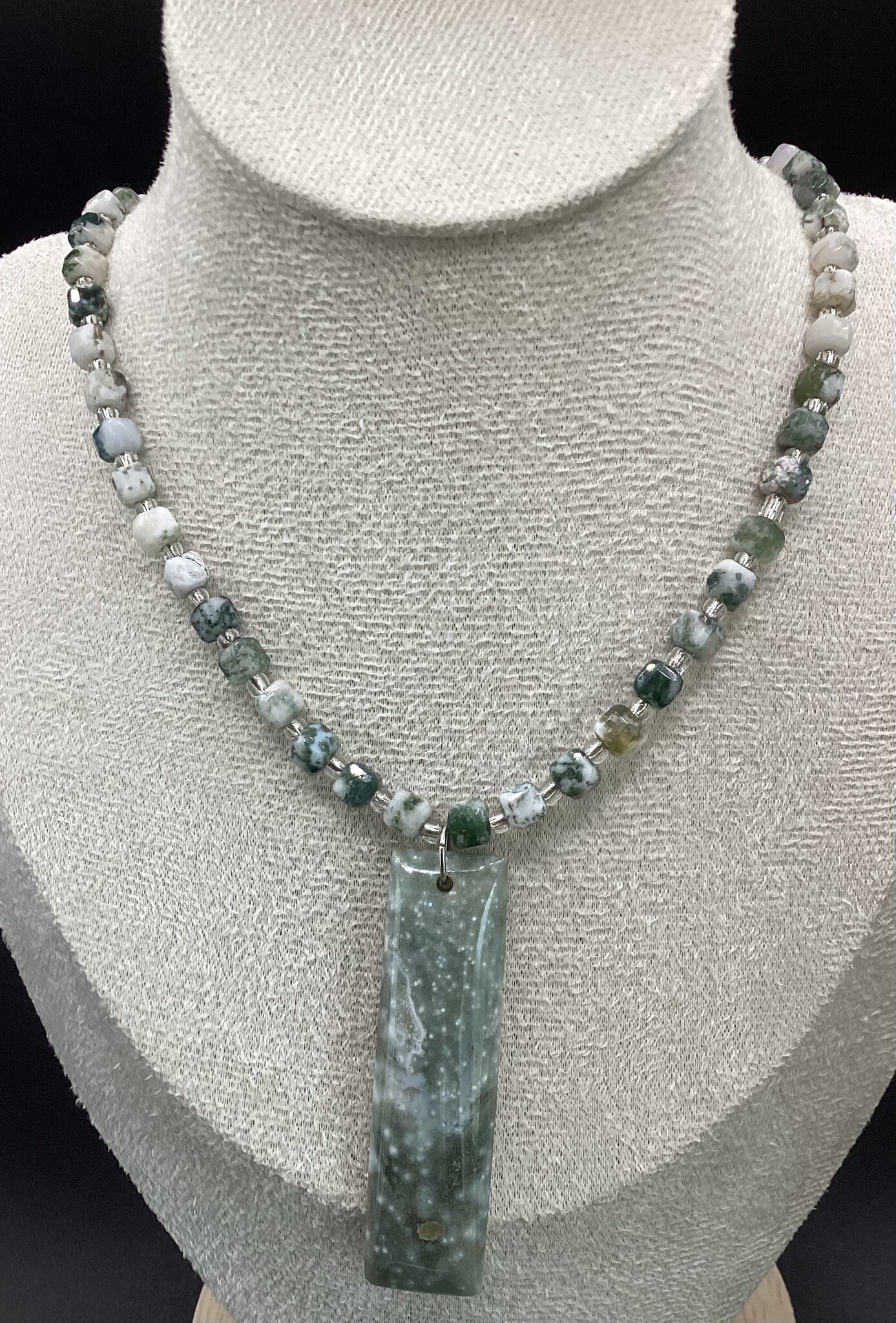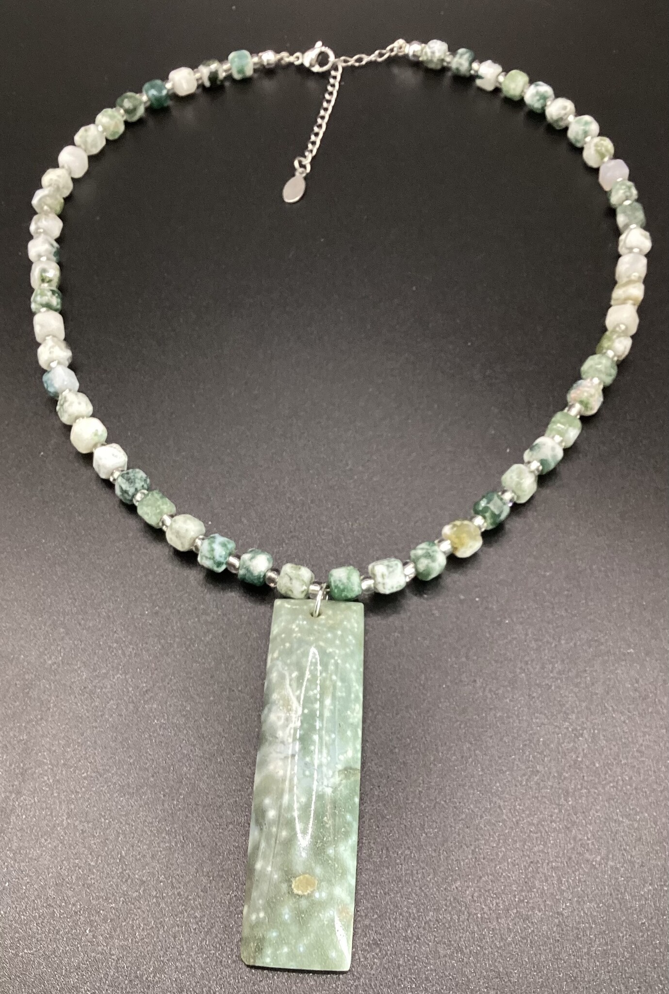 Collier ras de cou en agate arbre, perles carré originales (5mm). Entre celles ci de petites perles de verre argentées,. Superbe pendentif rectangulaire en agate. Fermoir en acier inoxydable avec chaîne d’extension.
