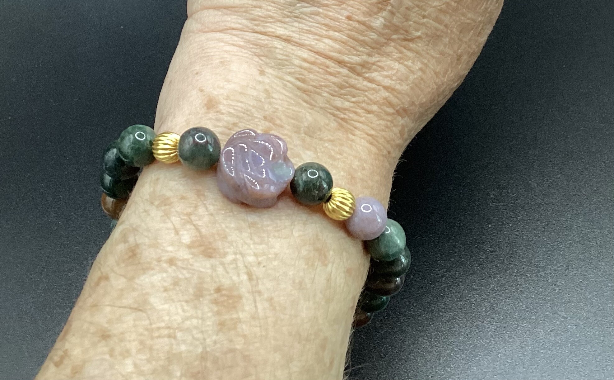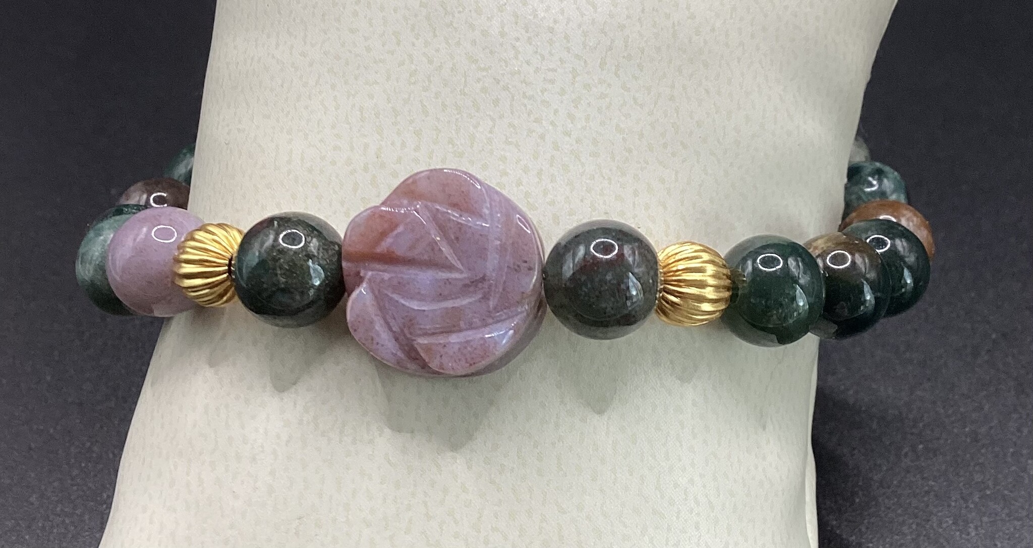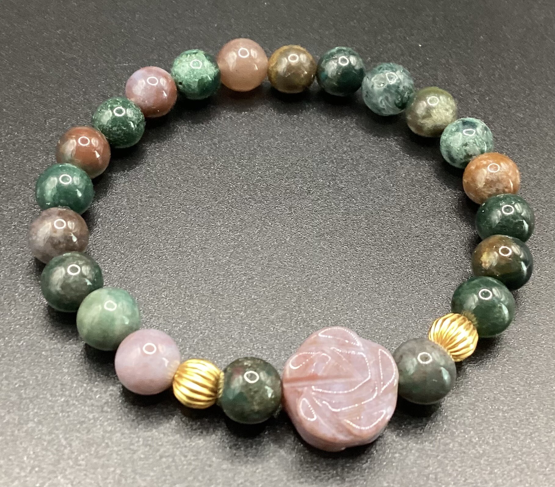 Bracelet en perles d’agate indienne de 8 mm, avec en son centre une rose de la même pierre, et deux perles dorées à 30 % argent et 70 % alliage ( ne ternit pas). Délicatesse..