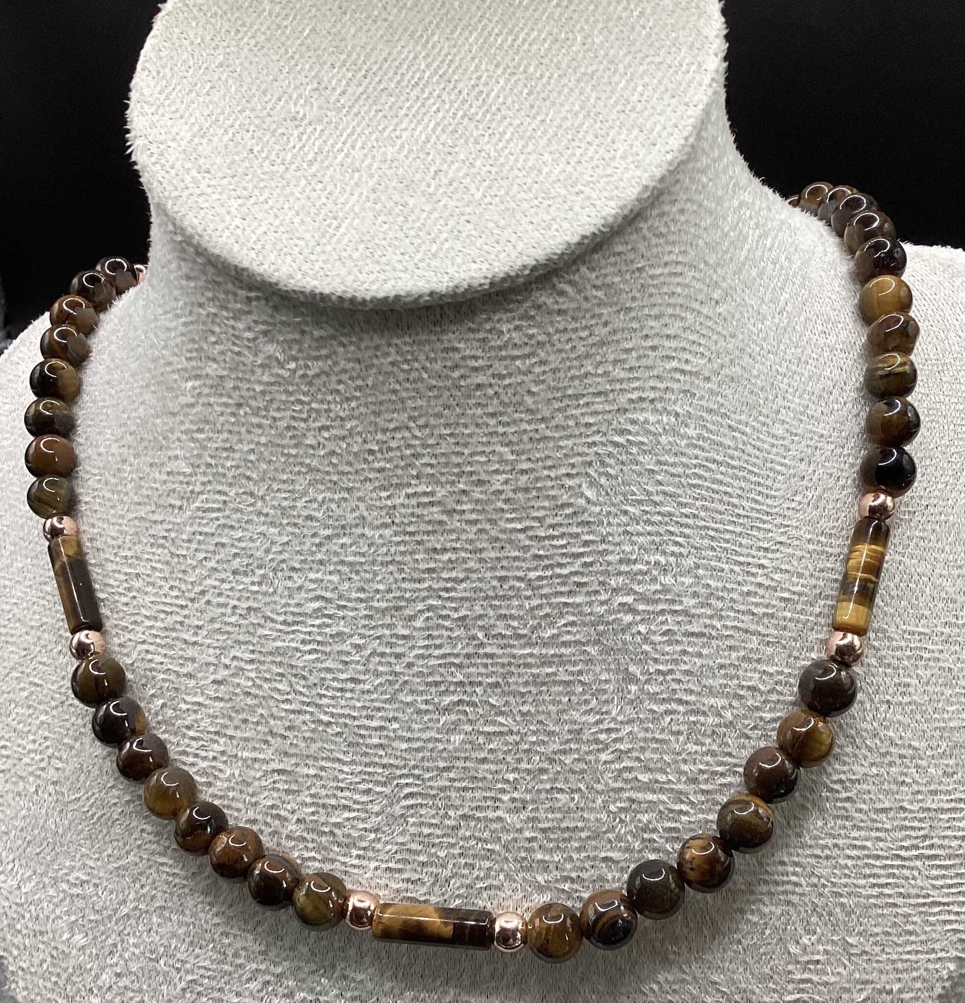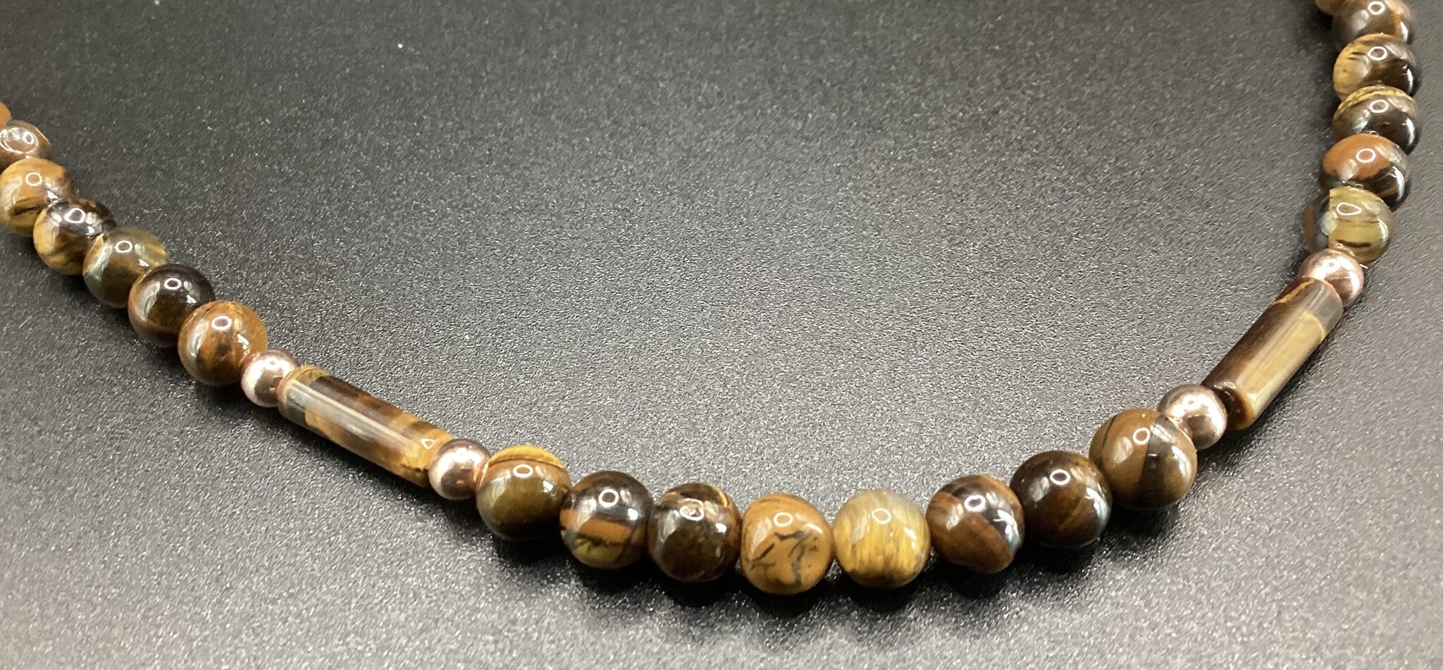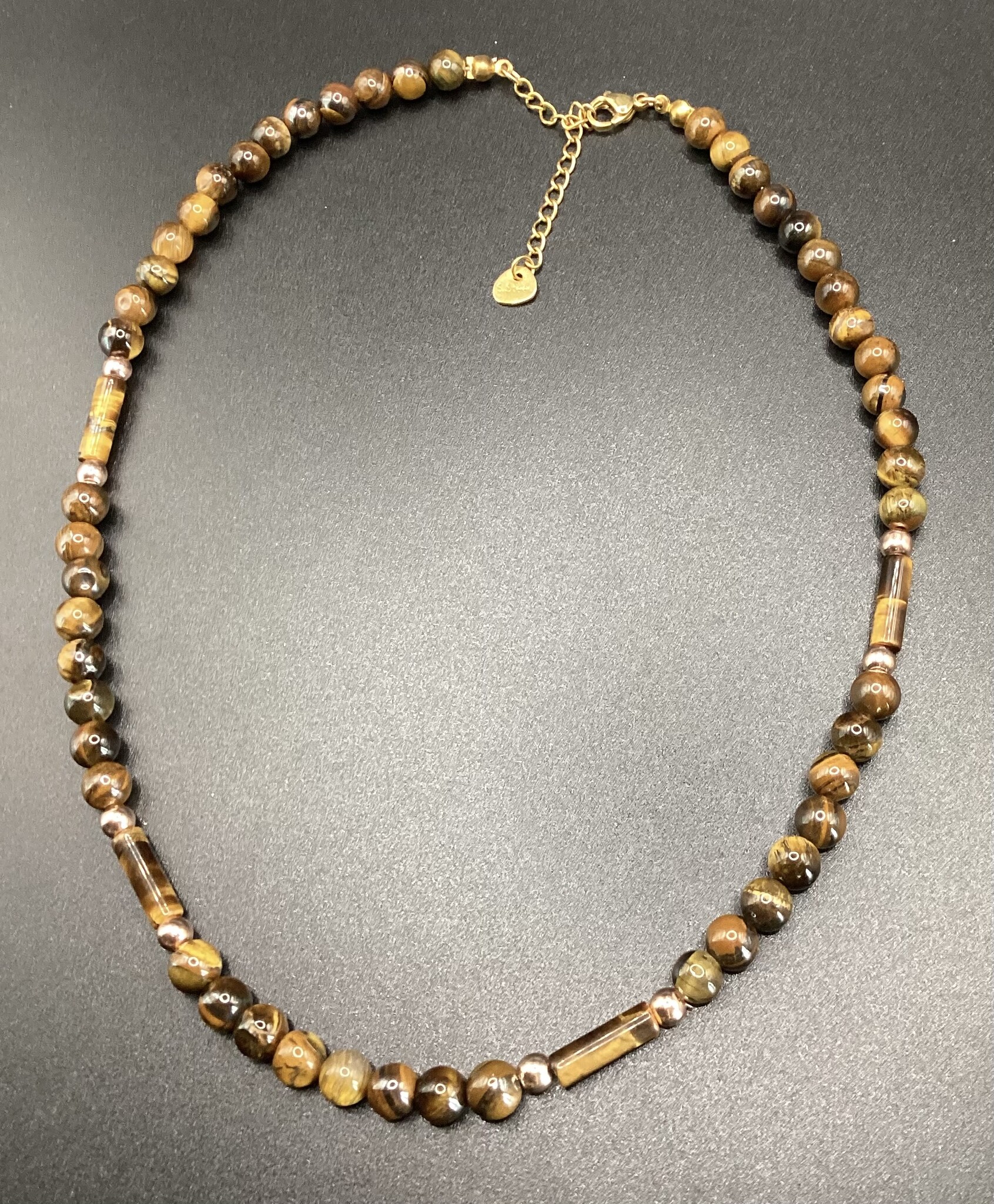 Collier en perles d’oeil de tigre de 6 mm, avec quelques perles en tube et quelque perles dorées en hématite. Il est simple et élégant…