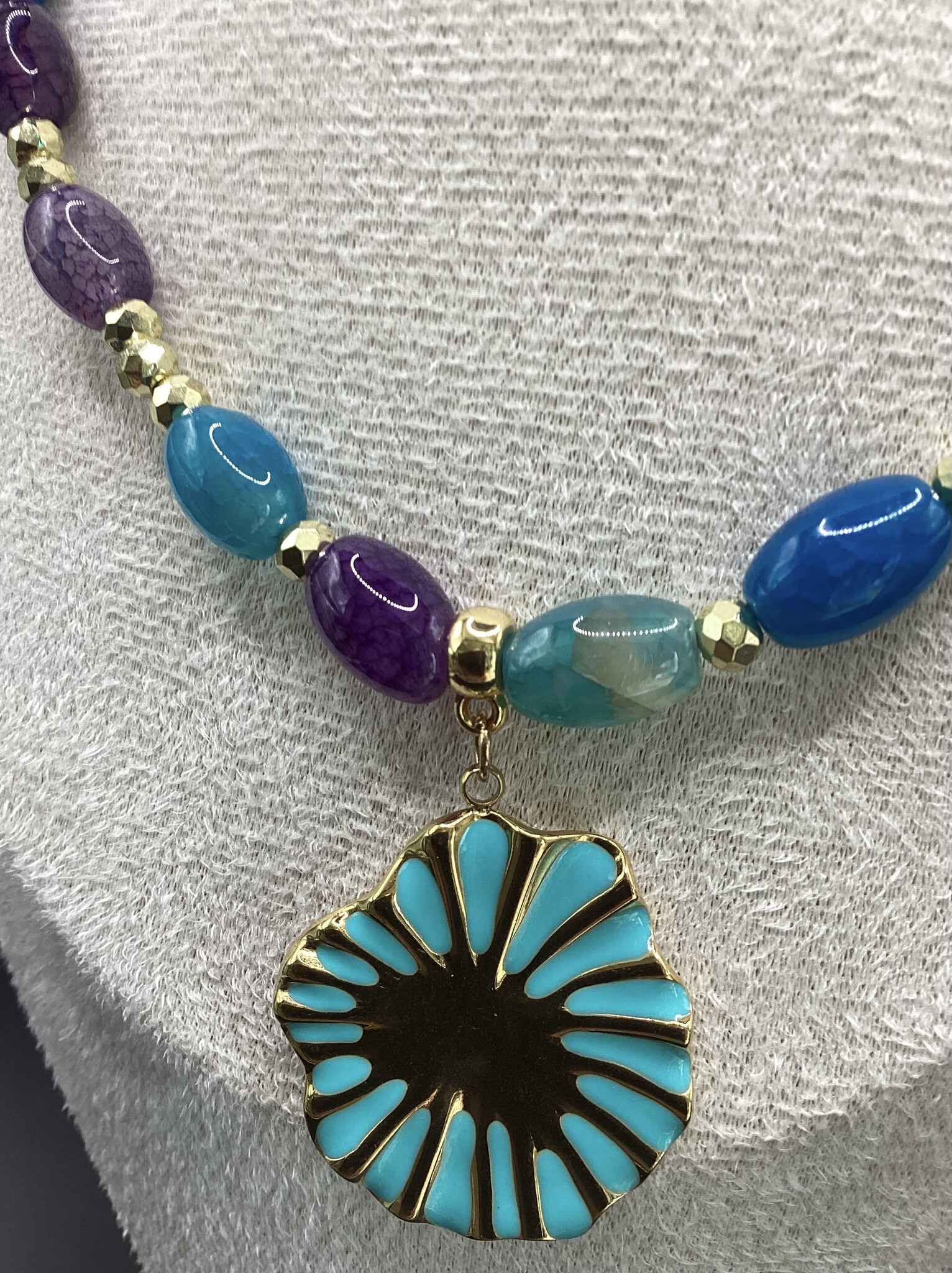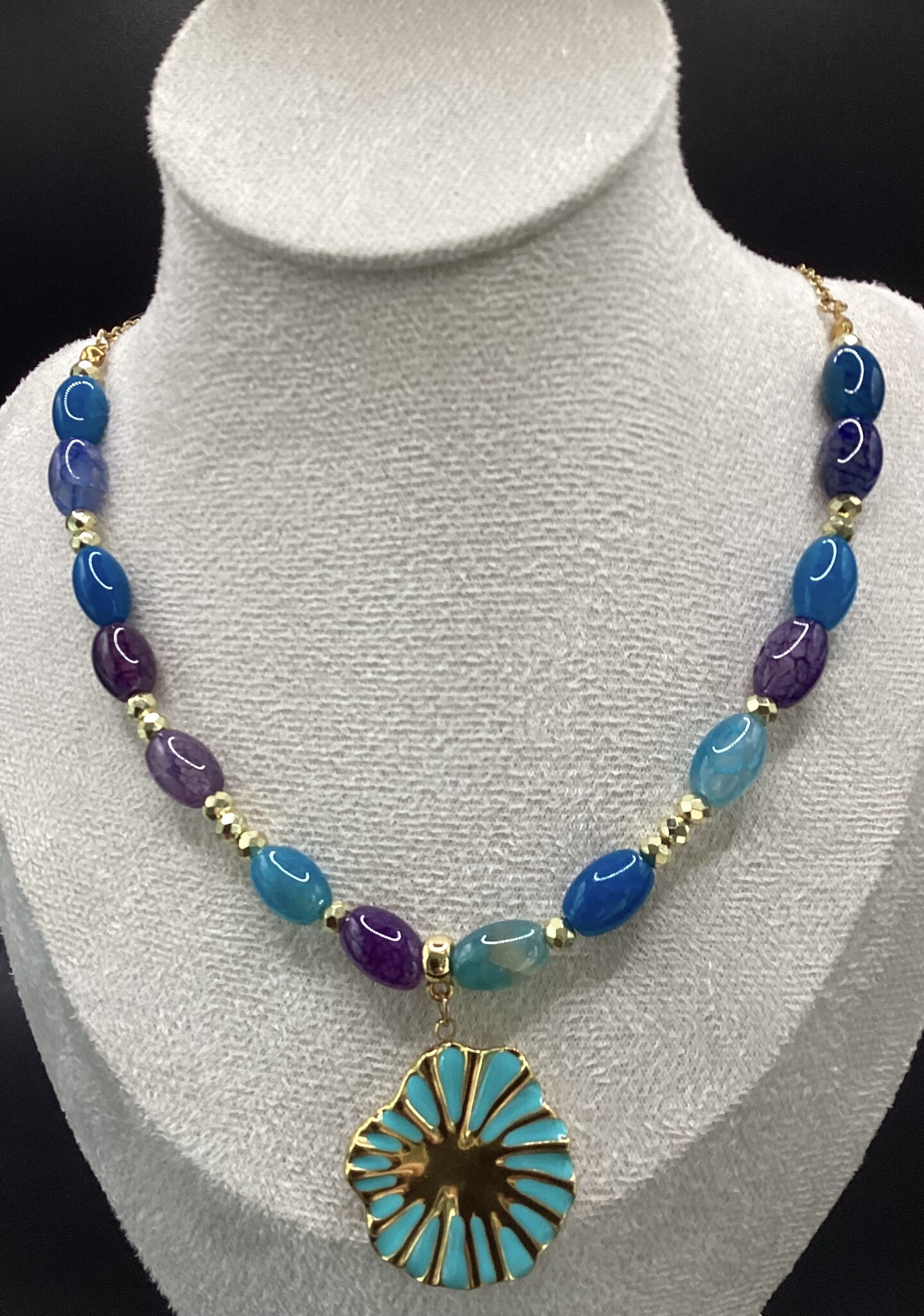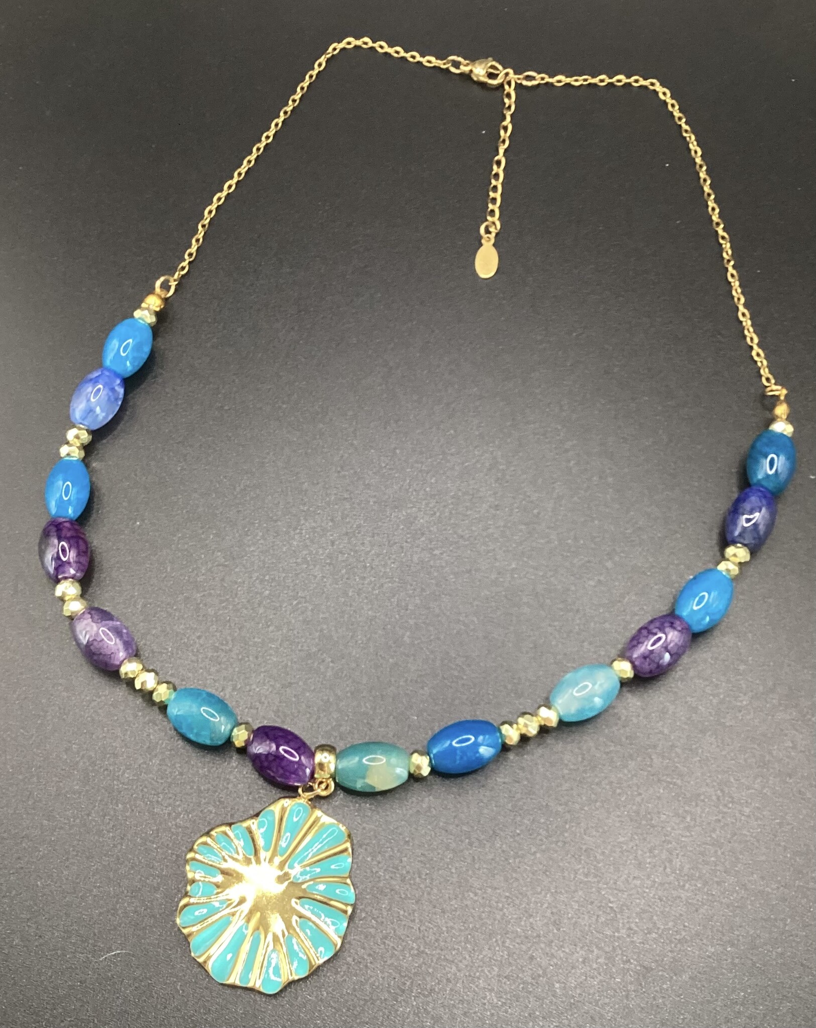 Collier fantaisie avec des pèles de verre ovale 8 mm, camaïeu de bleu et violet. Des petites perles dorees en verre, une chaine acier inoxydable, et en son centre, un joli pendentif fleur acier inoxydable… le fermoir est en acier inoxydable avec chaîne d’extension.