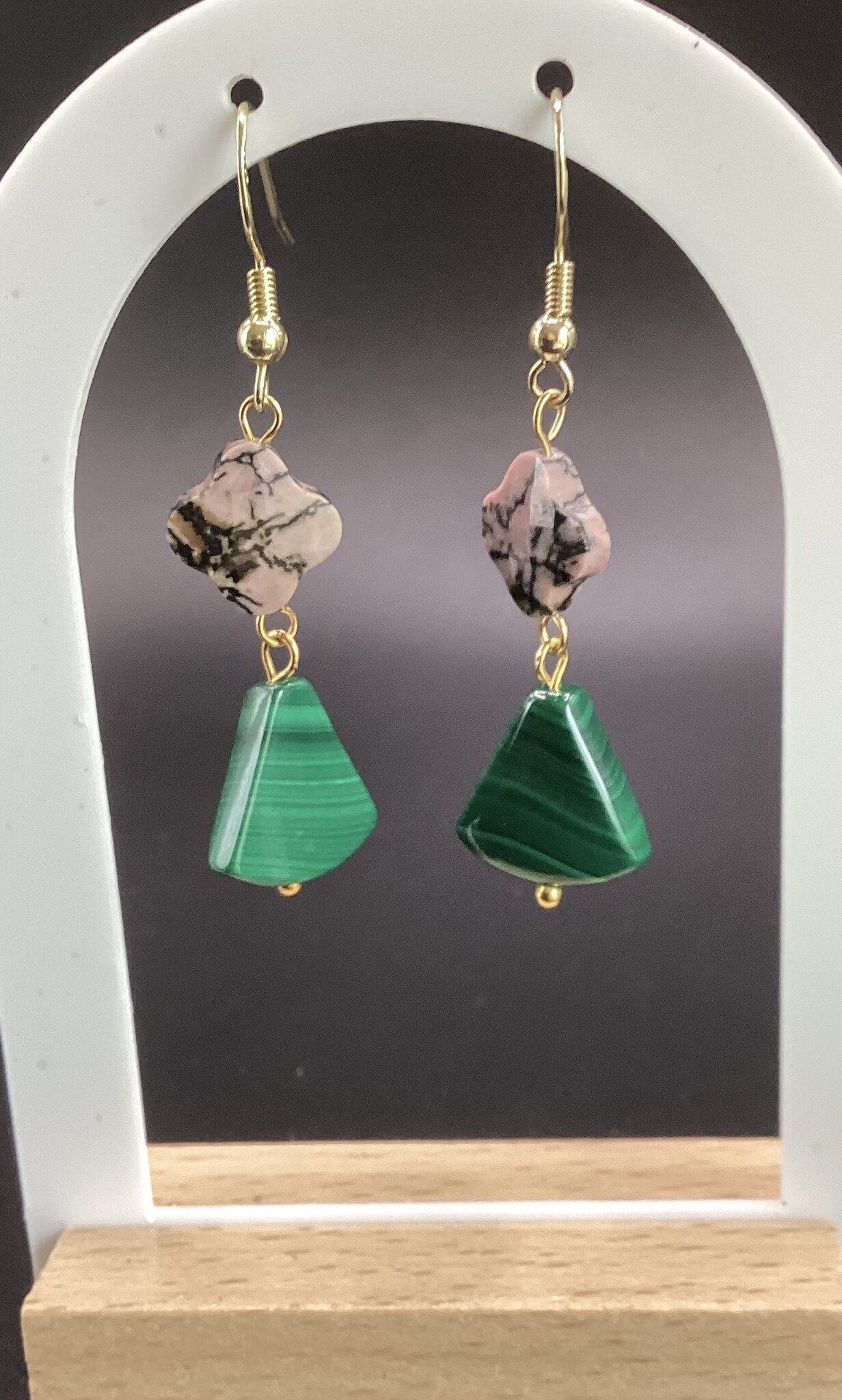Boucles d’oreilles avec un éventail de malachite et un joli trèfle de rodhonite . Les crochets sont en argent plaqué or. Très raffinées !
