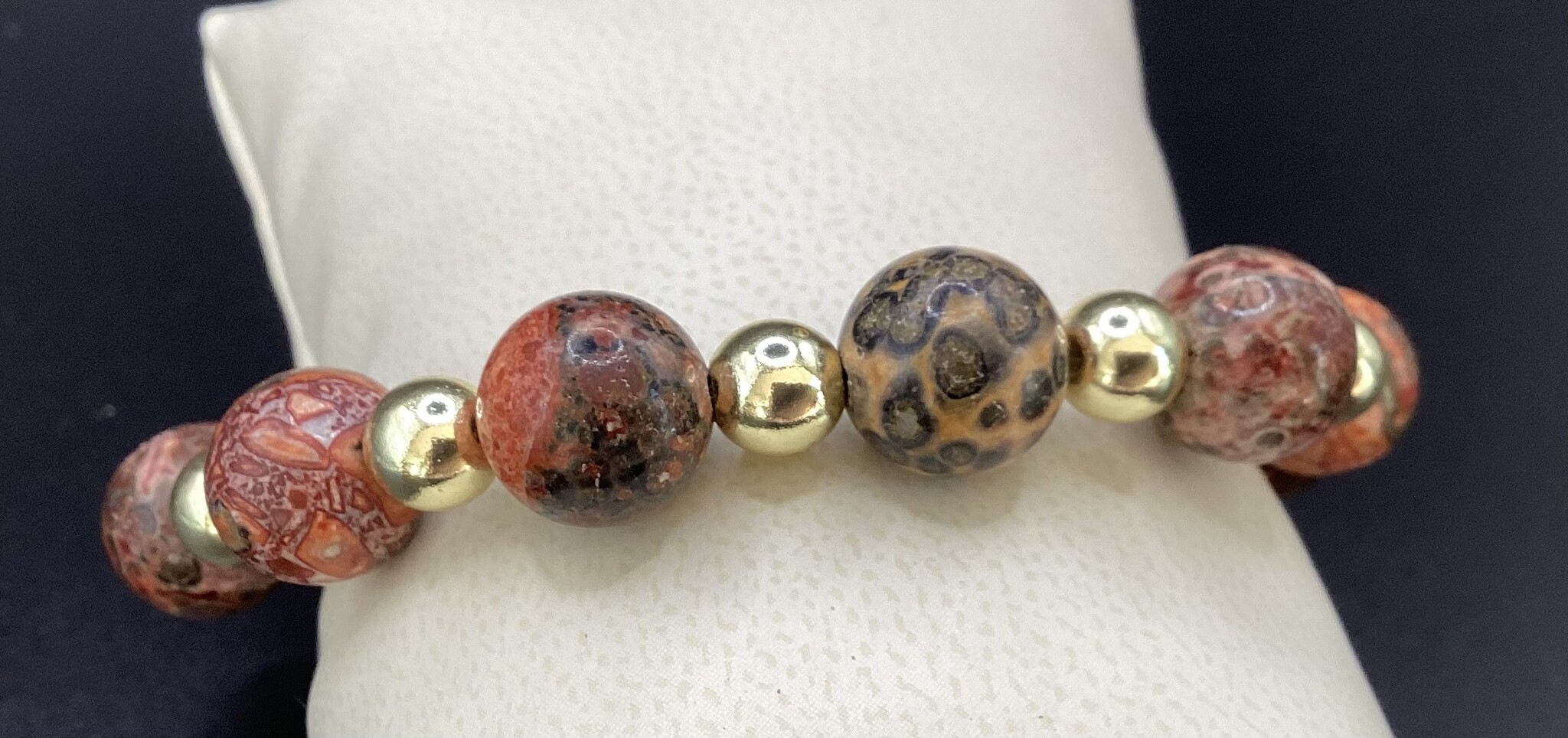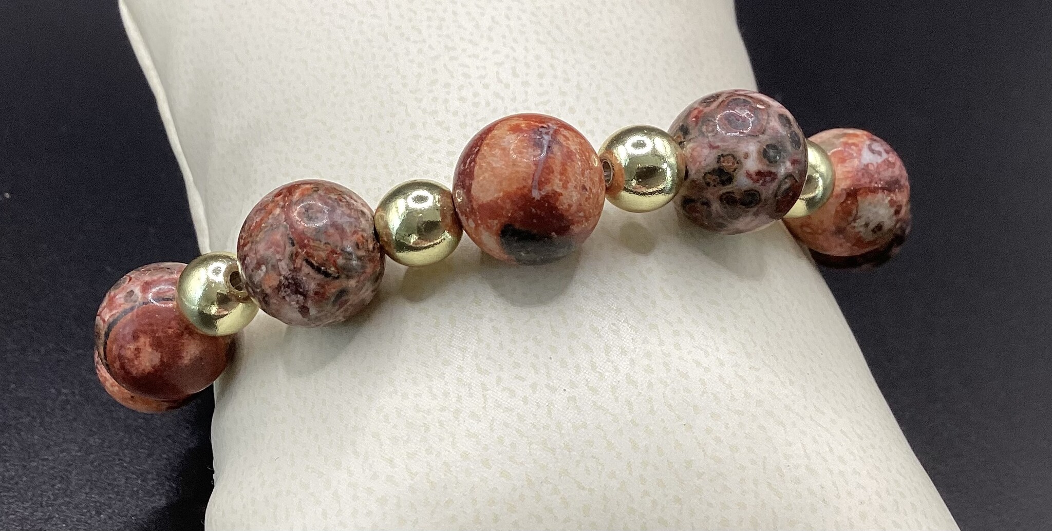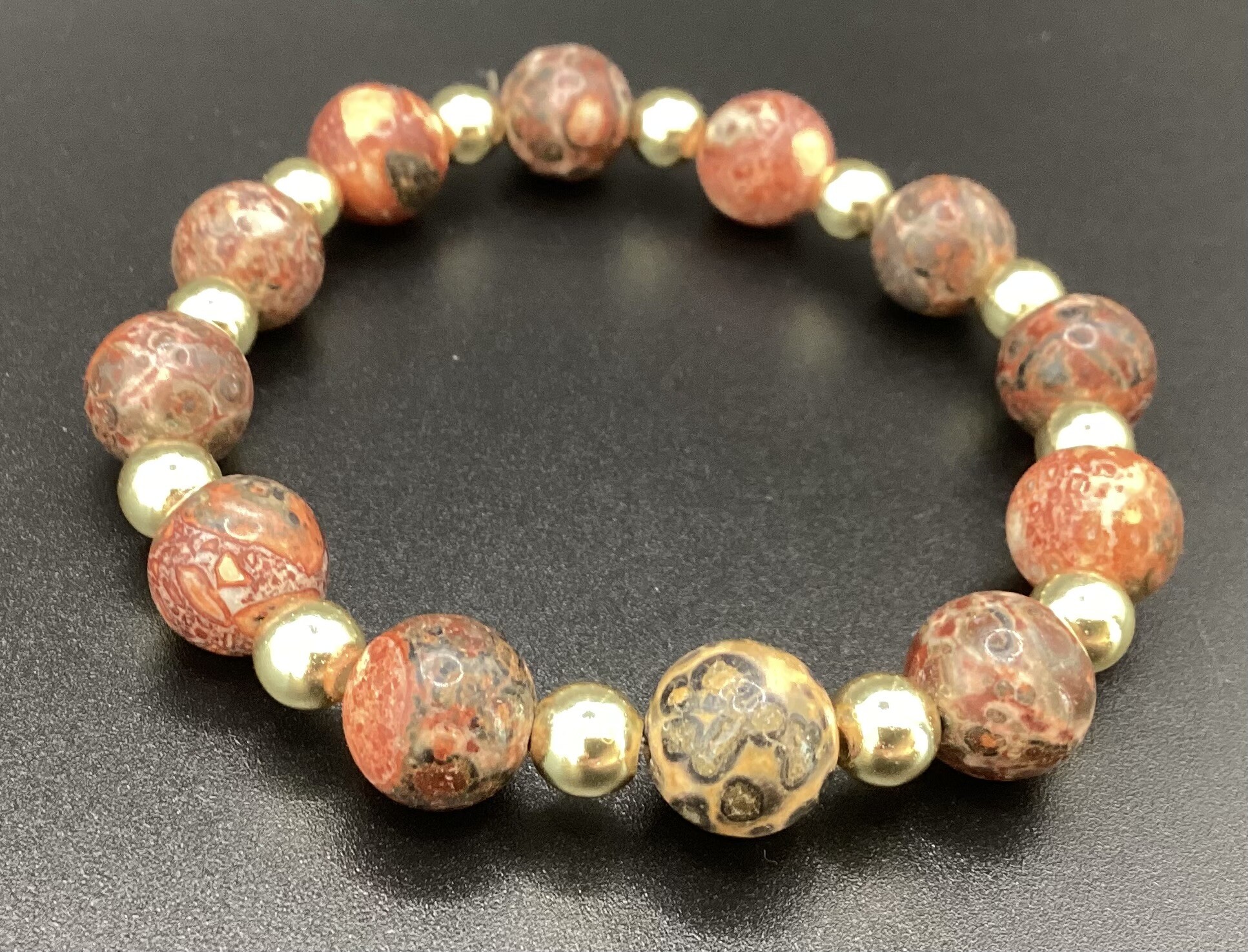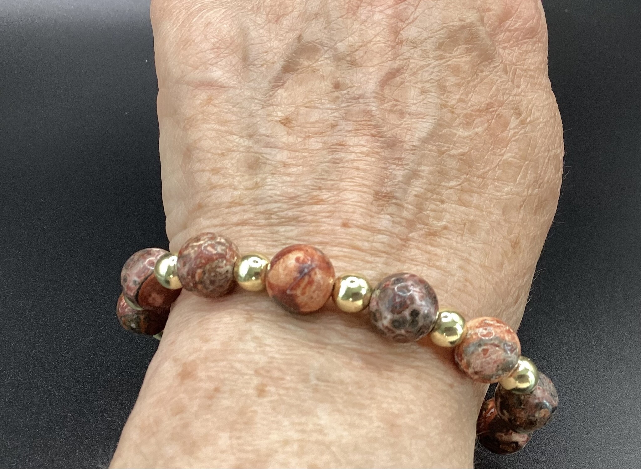 Sublime bracelet en perles de jaspe léopard (11 mm) et hématite (6 mm). Ses dessins sont incroyables !