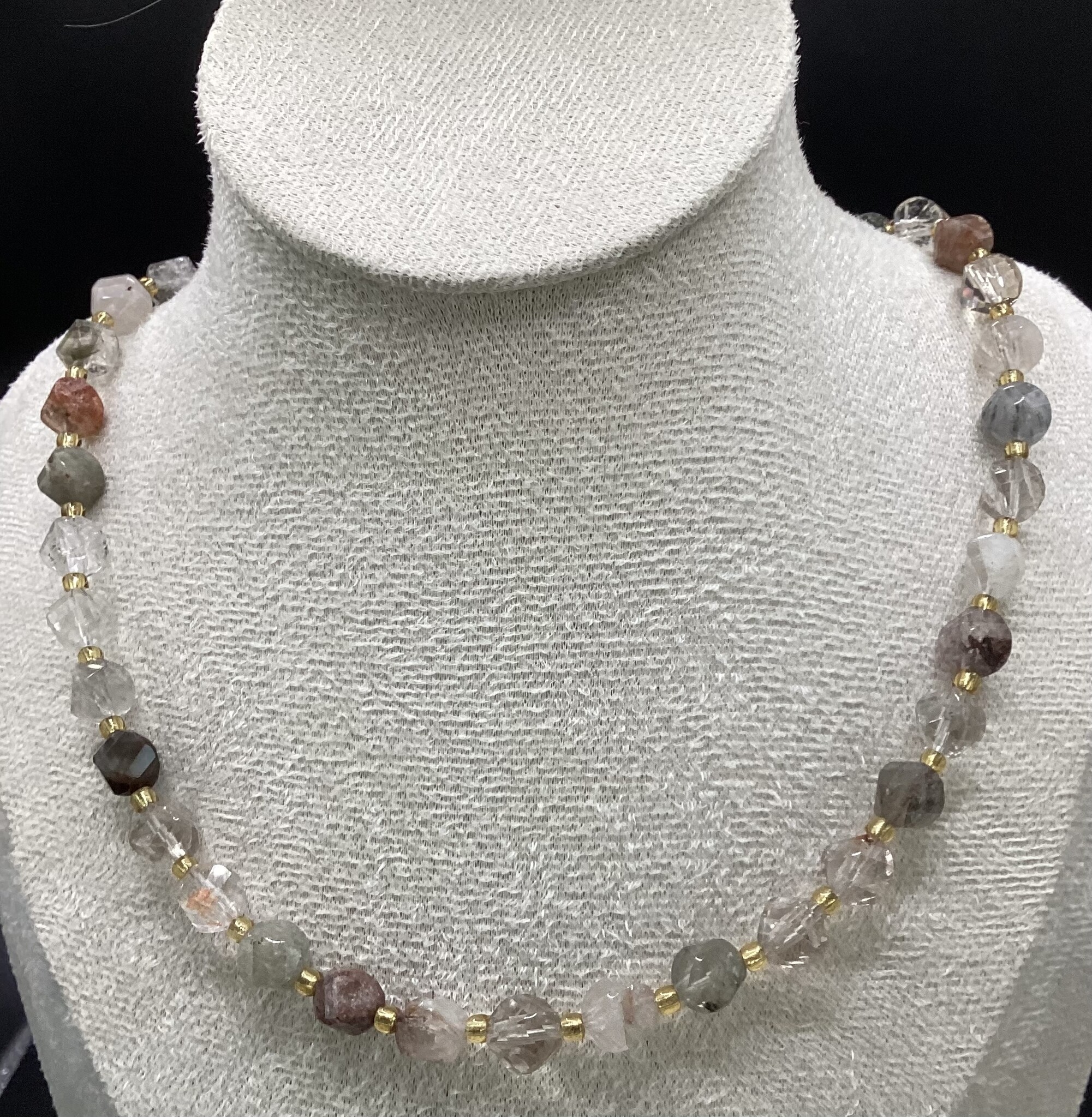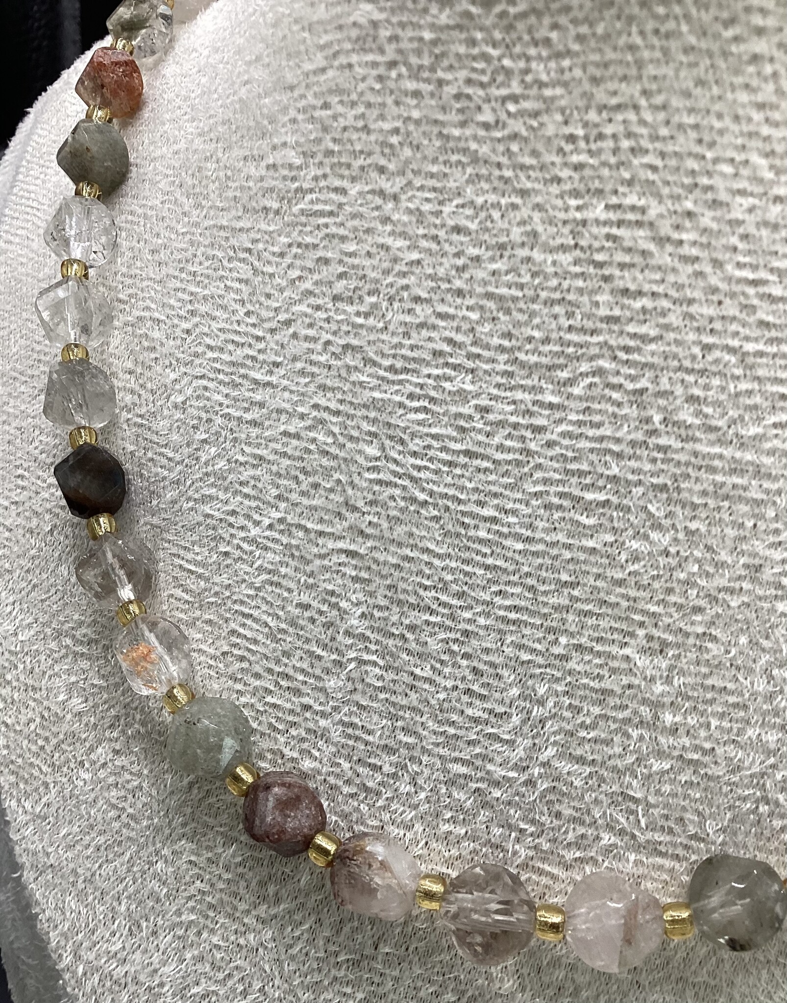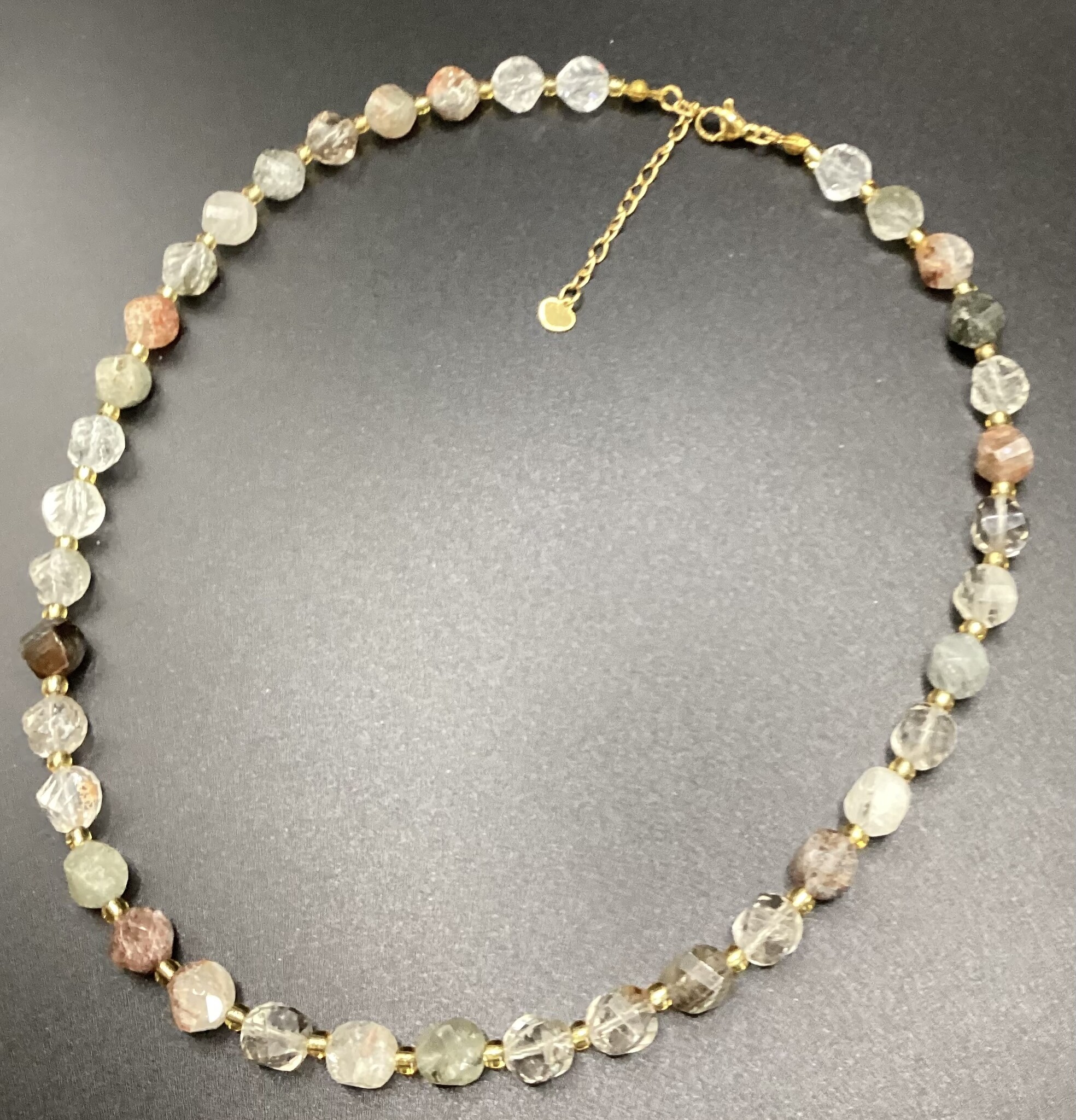 Collier en perles facettées de quartz jardin (ou fantôme) de 6 mm, aux superbes reflets et inclusions… entre chaque perles, une petite perle de rocaille dorée. Le fermoir est en acier inoxydable avec chaîne d’extension.