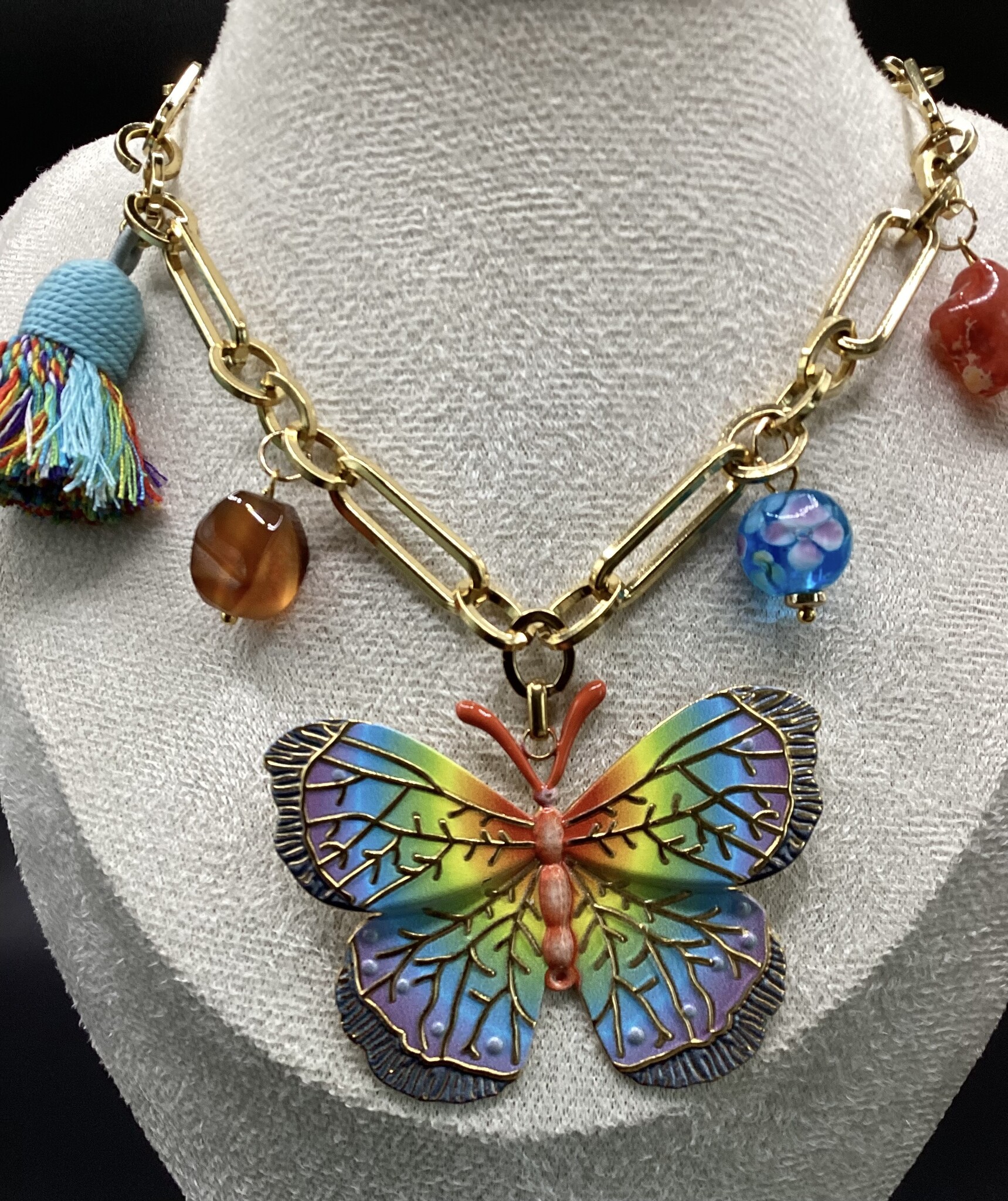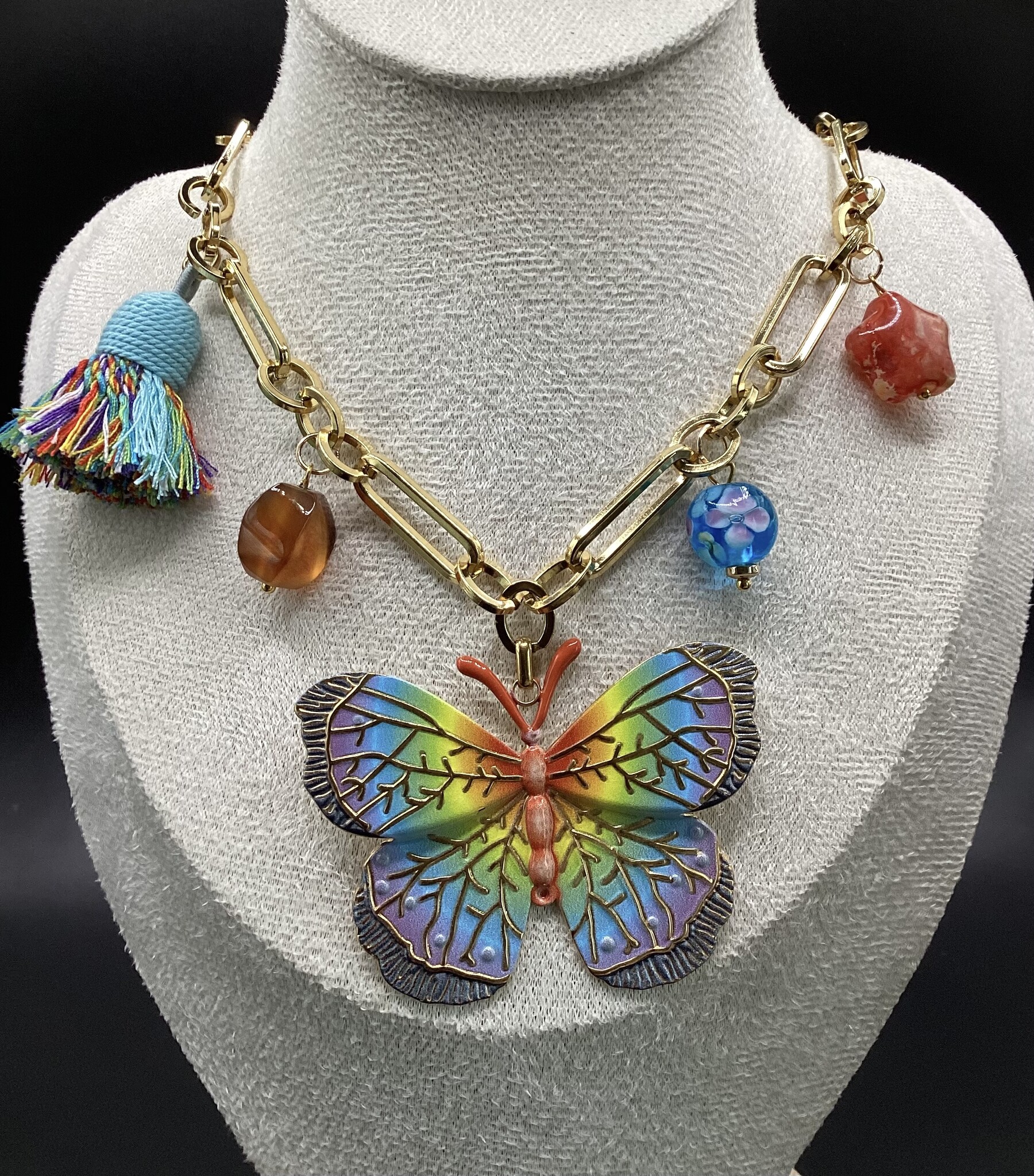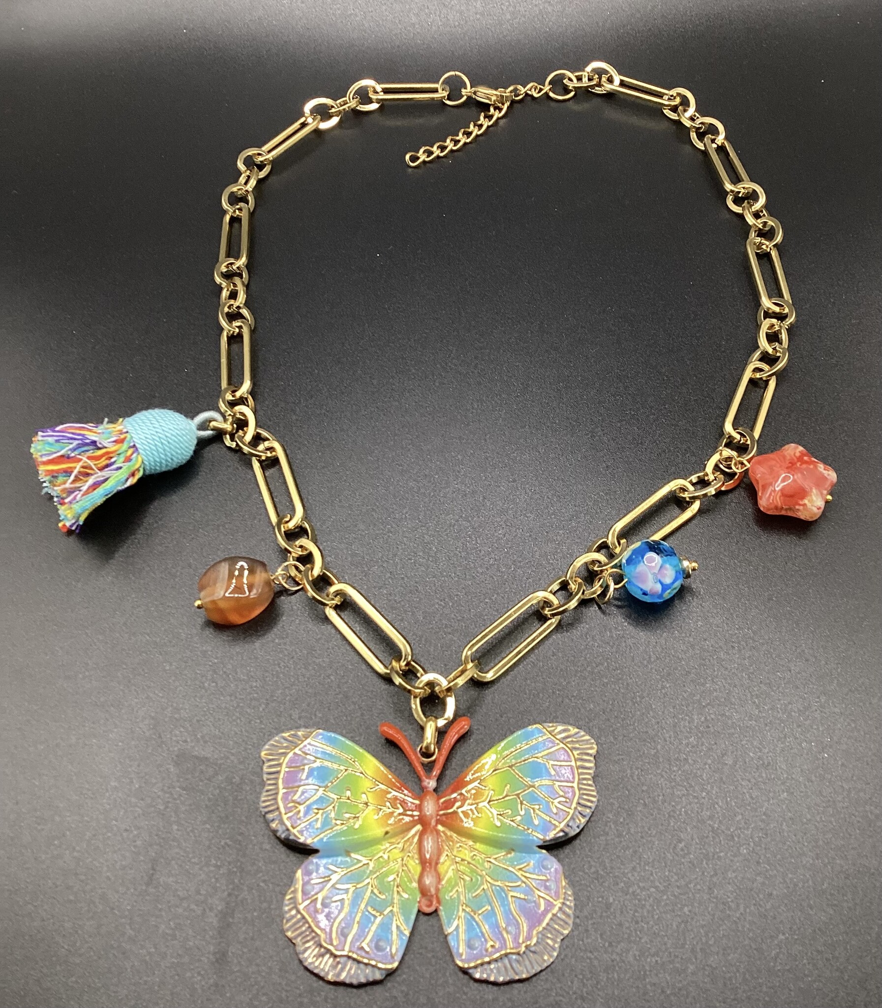 Qui aime la couleur ne peut passer à côté de ce collier en grosse chaîne acier inoxydable. Papillon en acier inoxydable, joli pompon dans les mêmes tons,’deux perles de verres toutes jolies, et une petite pierre de cornaline. Le fermoir est en acier inoxydable avec chaîne d’extension. Vive le printemps !
