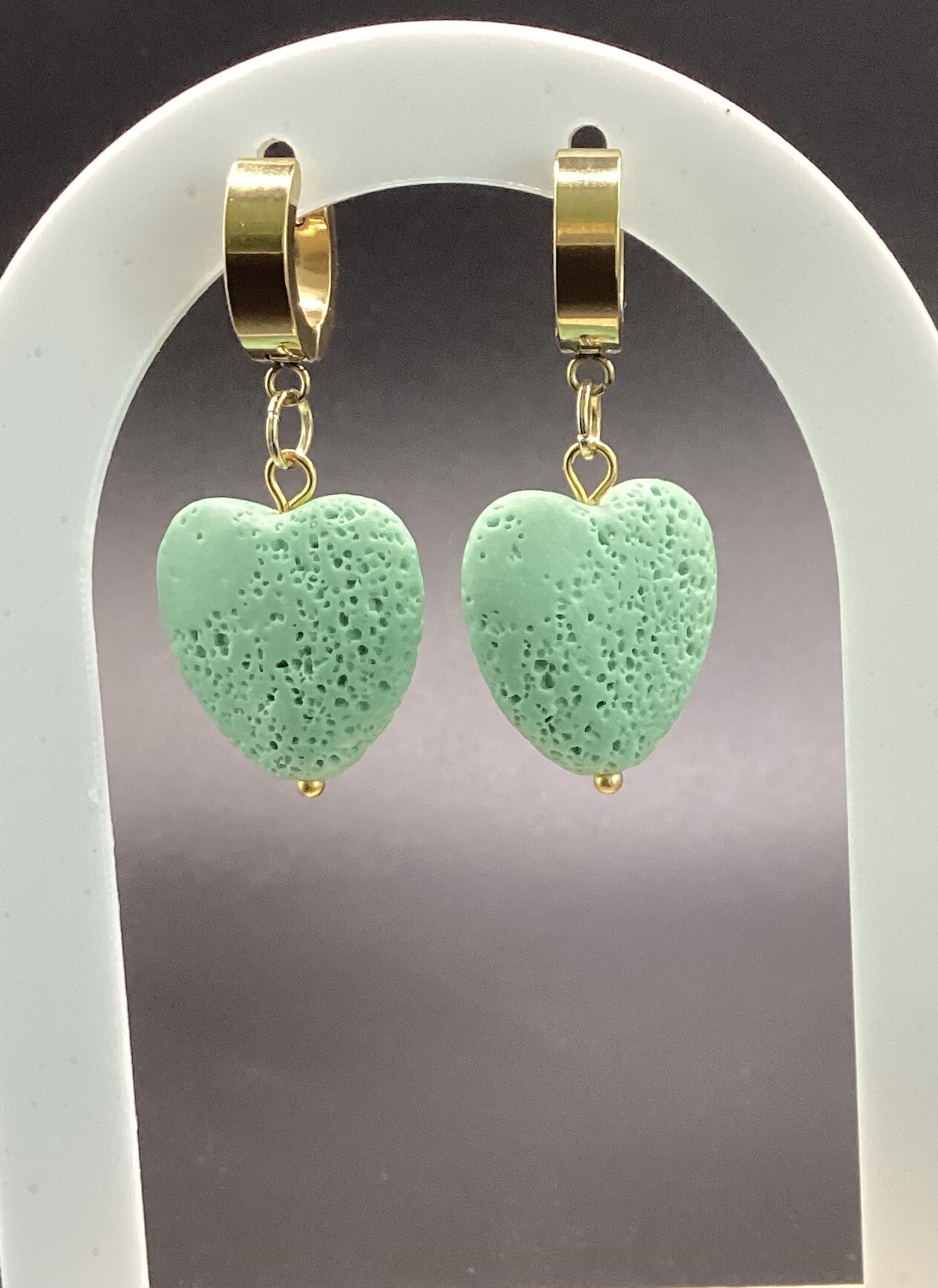 Boucles d’oreilles anneaux en acier inoxydable et petit cœur en pierre de lave teintée. Légères et estivales !