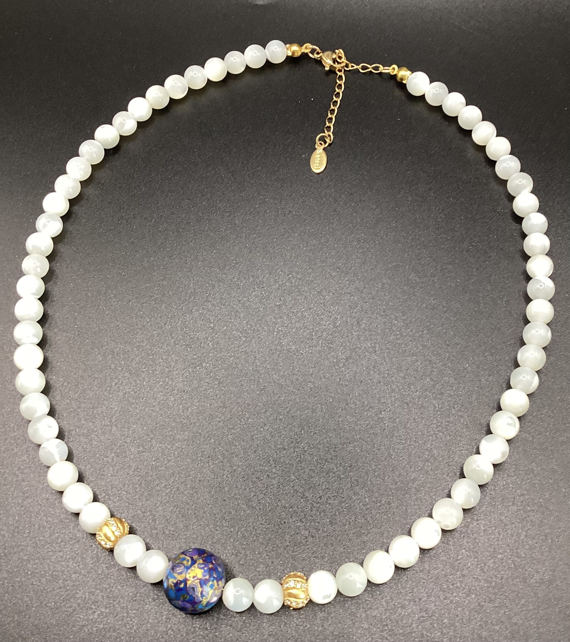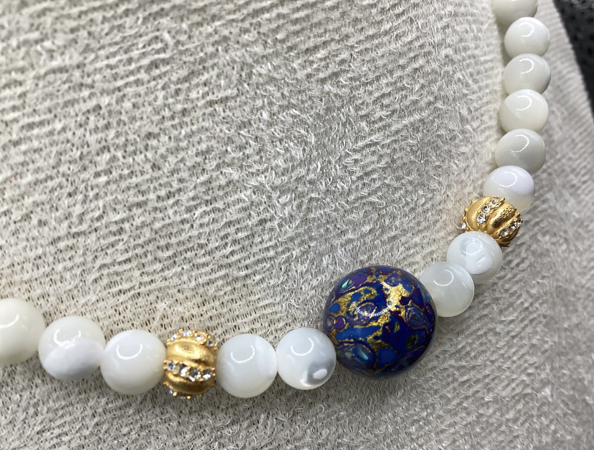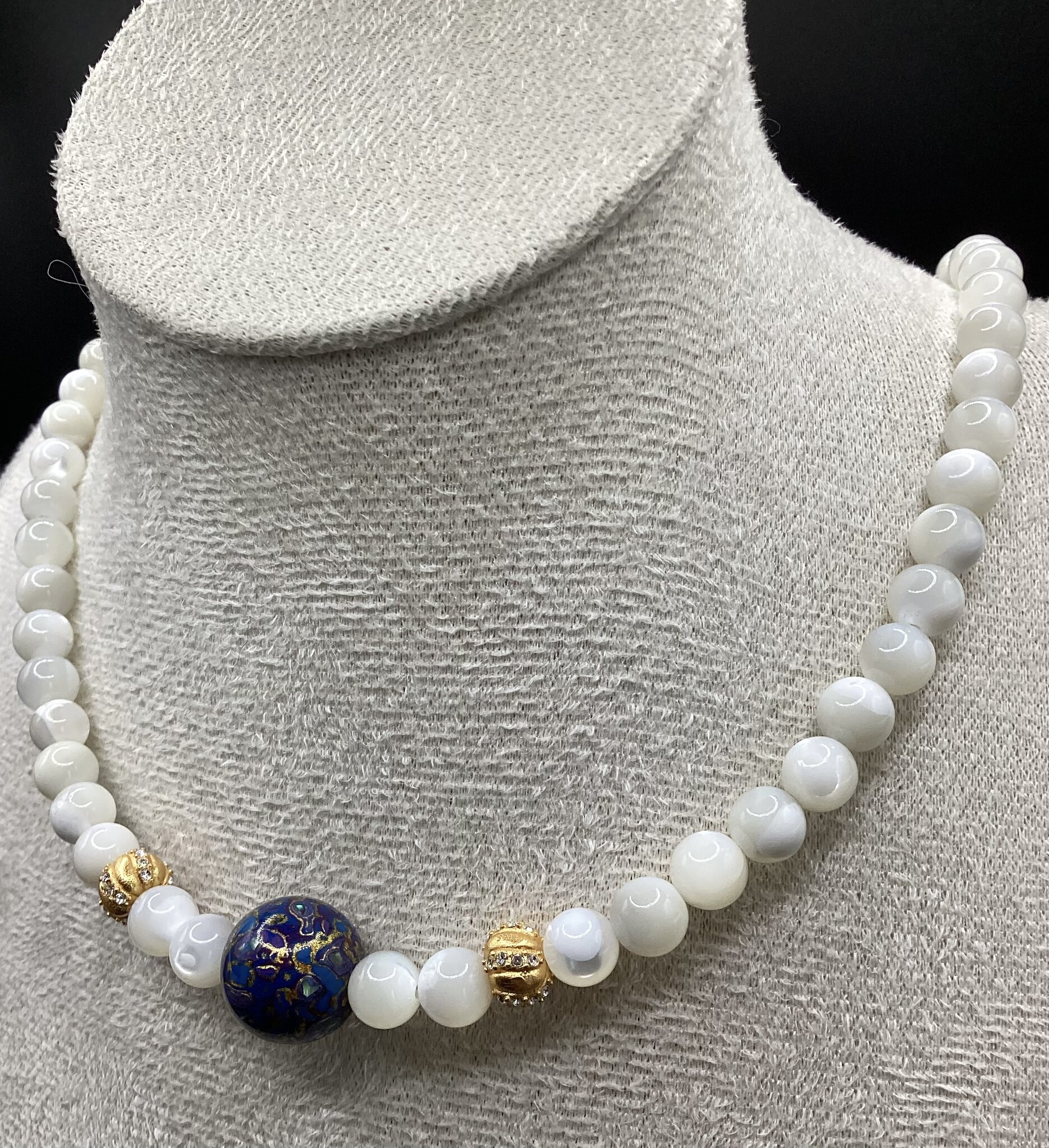 Magique ce collier en perles de nacre ! En son centre une perle traditionnelle chinoise, ancestrale, d’un bleu profond.